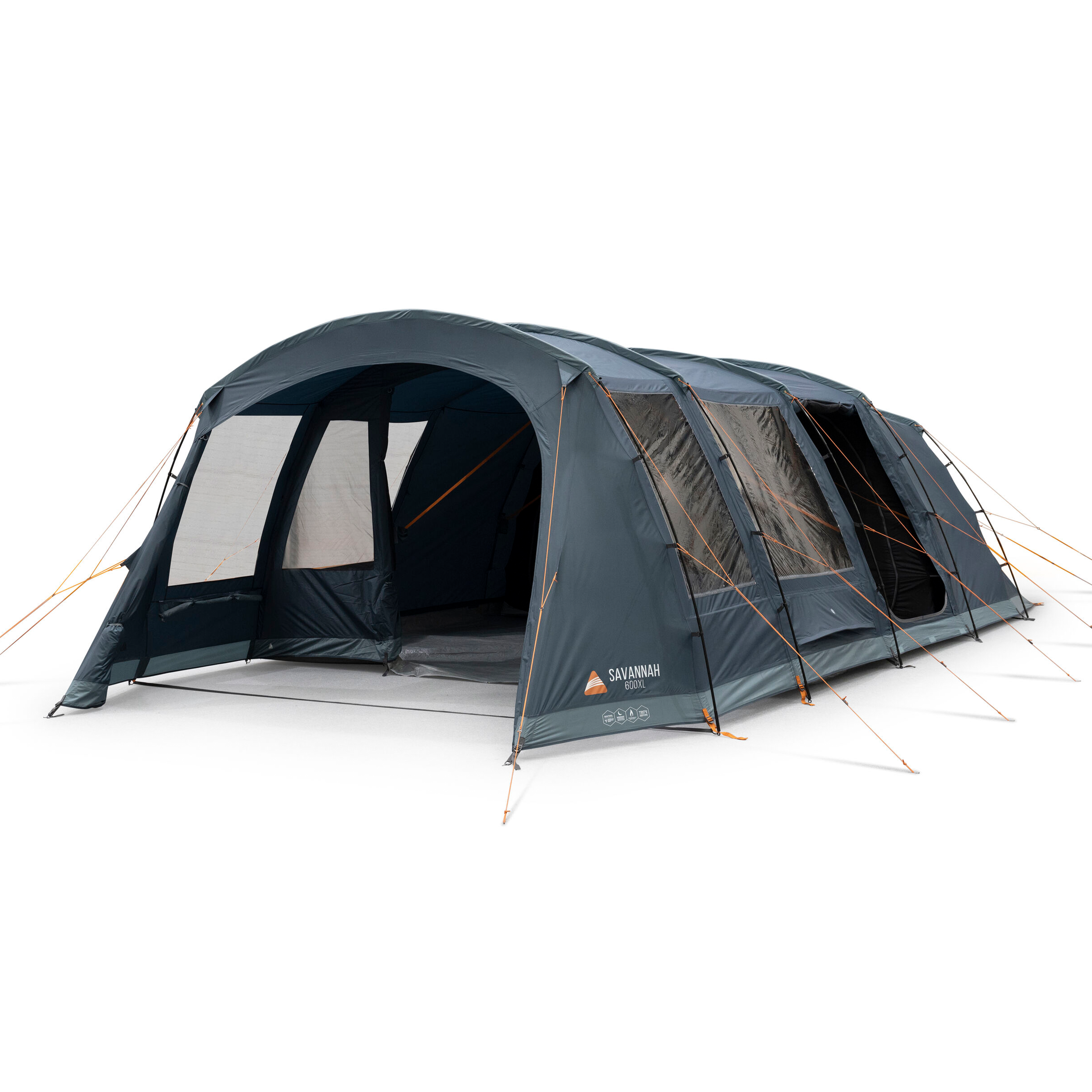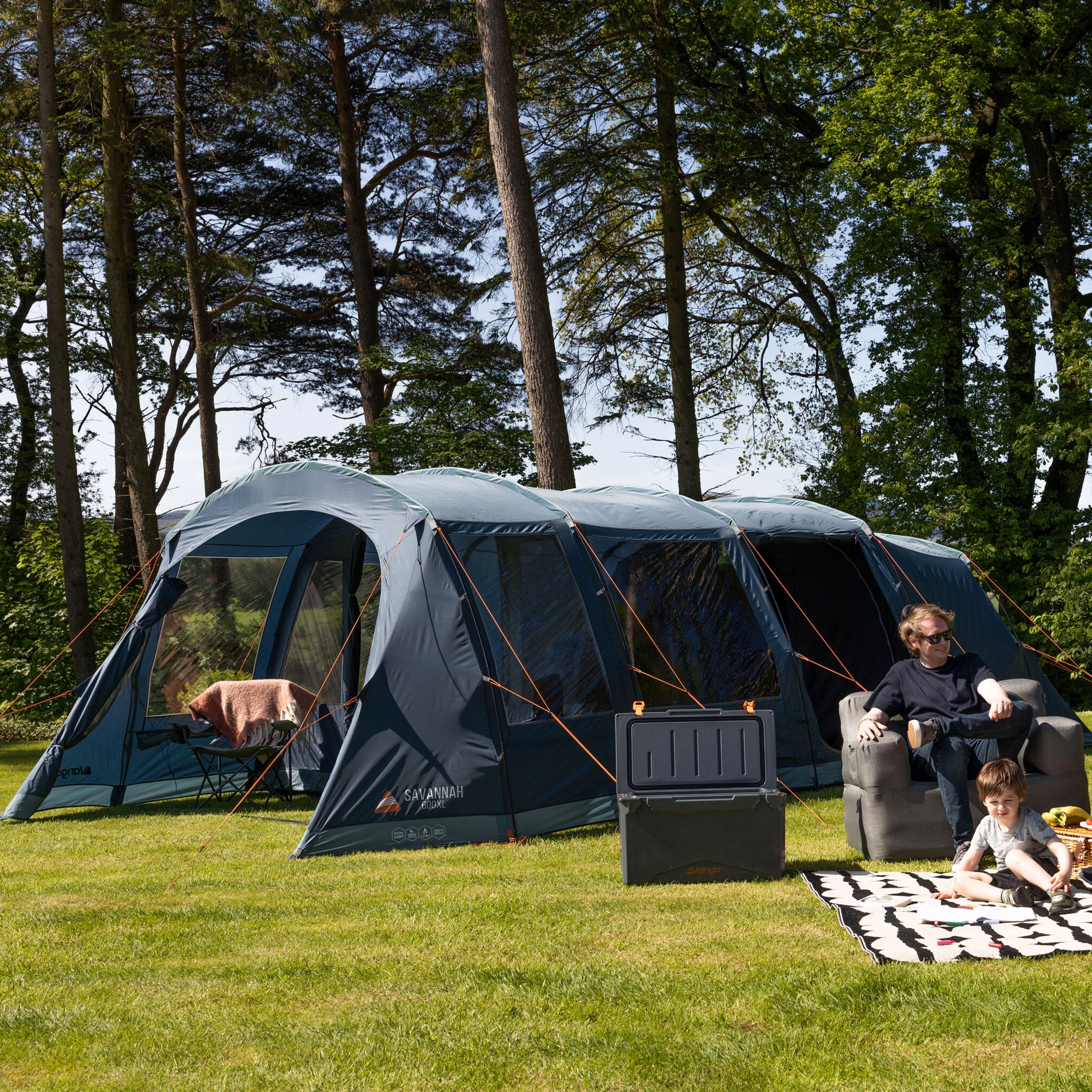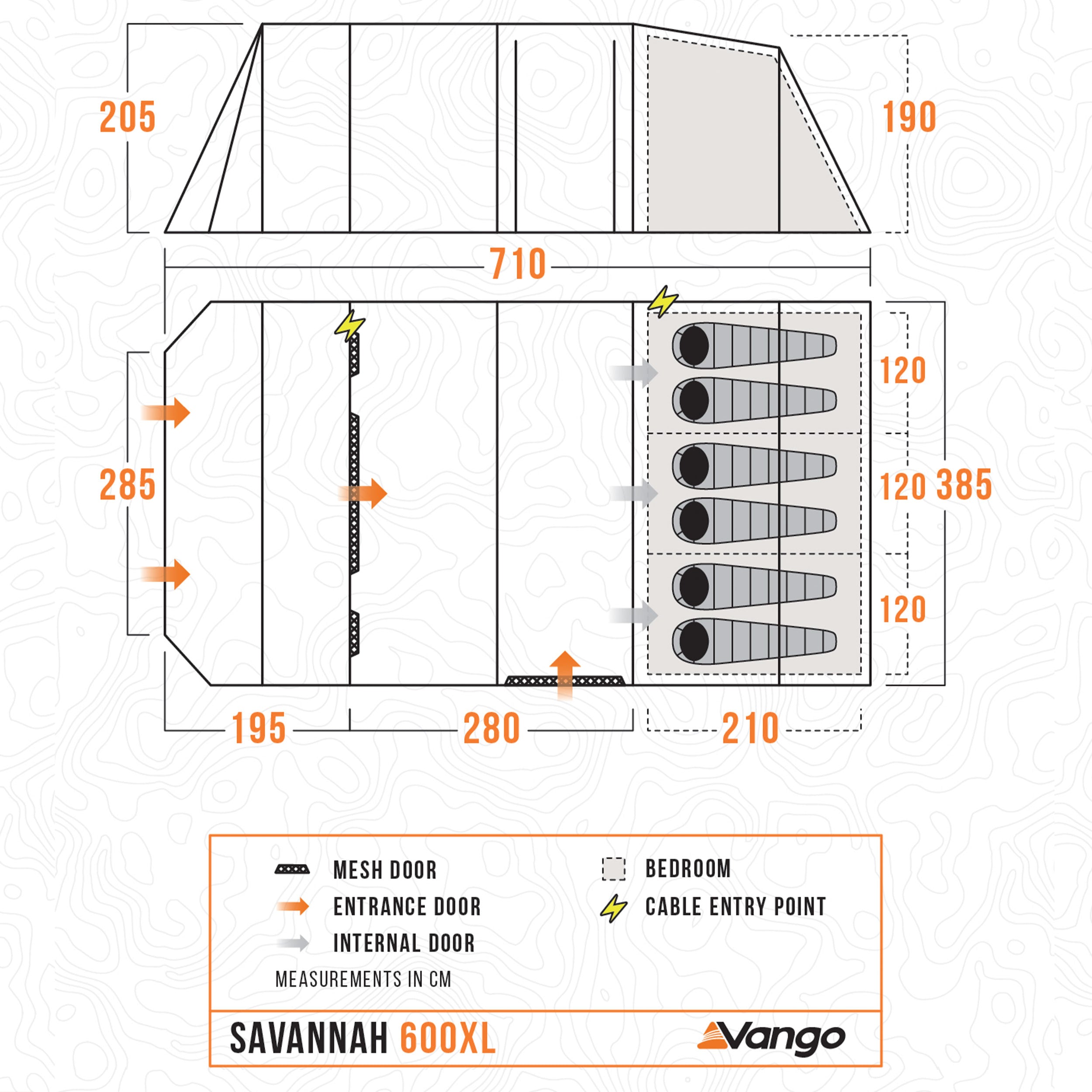 The Savannah 600XL is a 6-man poled tent with an integrated awning that provides additional living space. Dynamic Weave 100™ Fabric keeps pack size and weight low, while ensuring Vango quality and durability. The package includes a groundsheet protector which will protect and extend the life of your groundsheet and tent. The fully sewn-in groundsheet keeps out draughts and bugs, whilst ventilation can be managed using the mesh doors and AirZone panels. At over 2m tall, it is easy to stand-up and move around inside the tent. The large front door can be unzipped to the midpoint, or fully across, giving a good variety of options to suit different conditions and uses. Sleep-in longer thanks to Midnight Bedroom®, designed for a great and comfortable nights sleep. The large Diamond Clear windows let light pour into the living areas during the day and can be covered up with the roll-away toggled curtains at night.