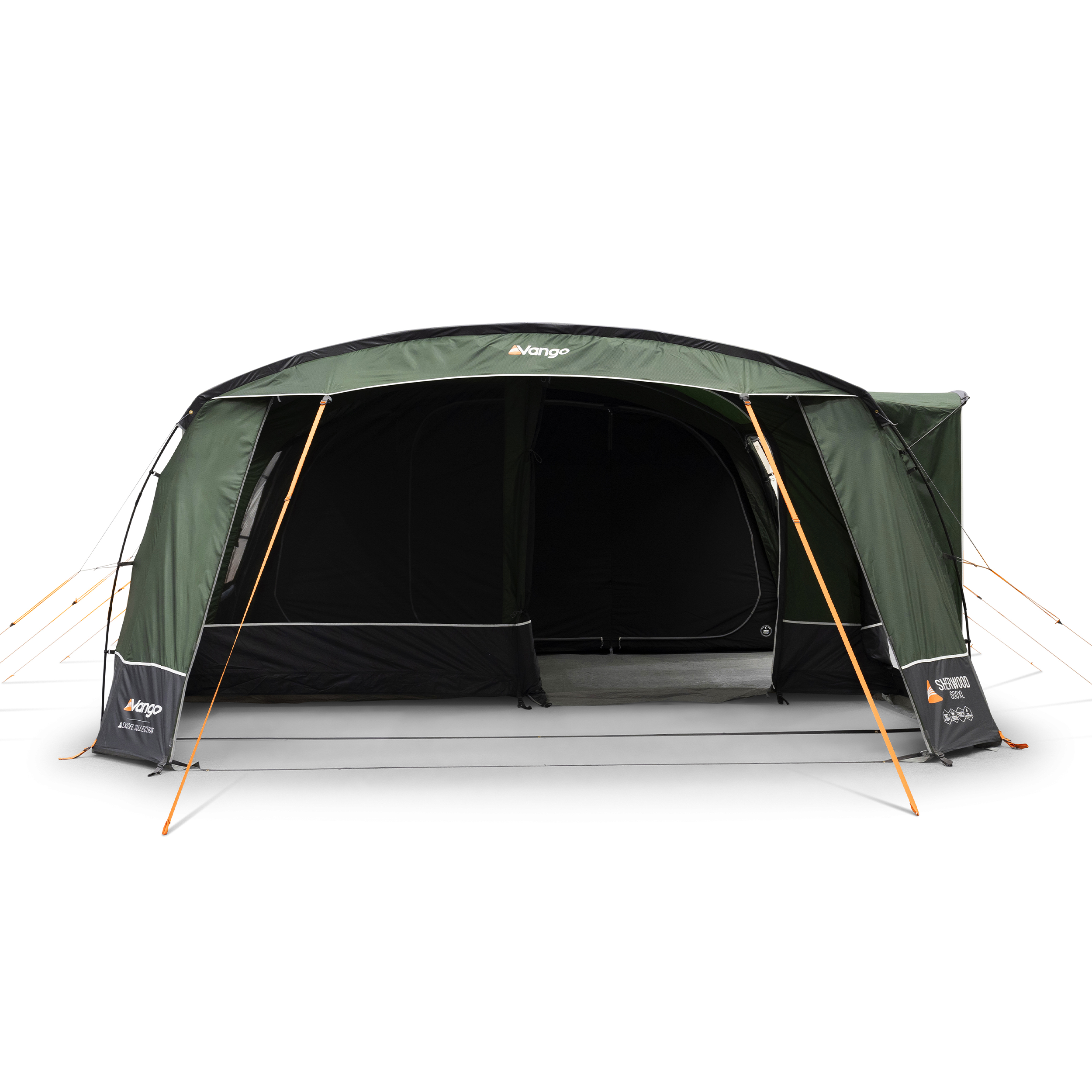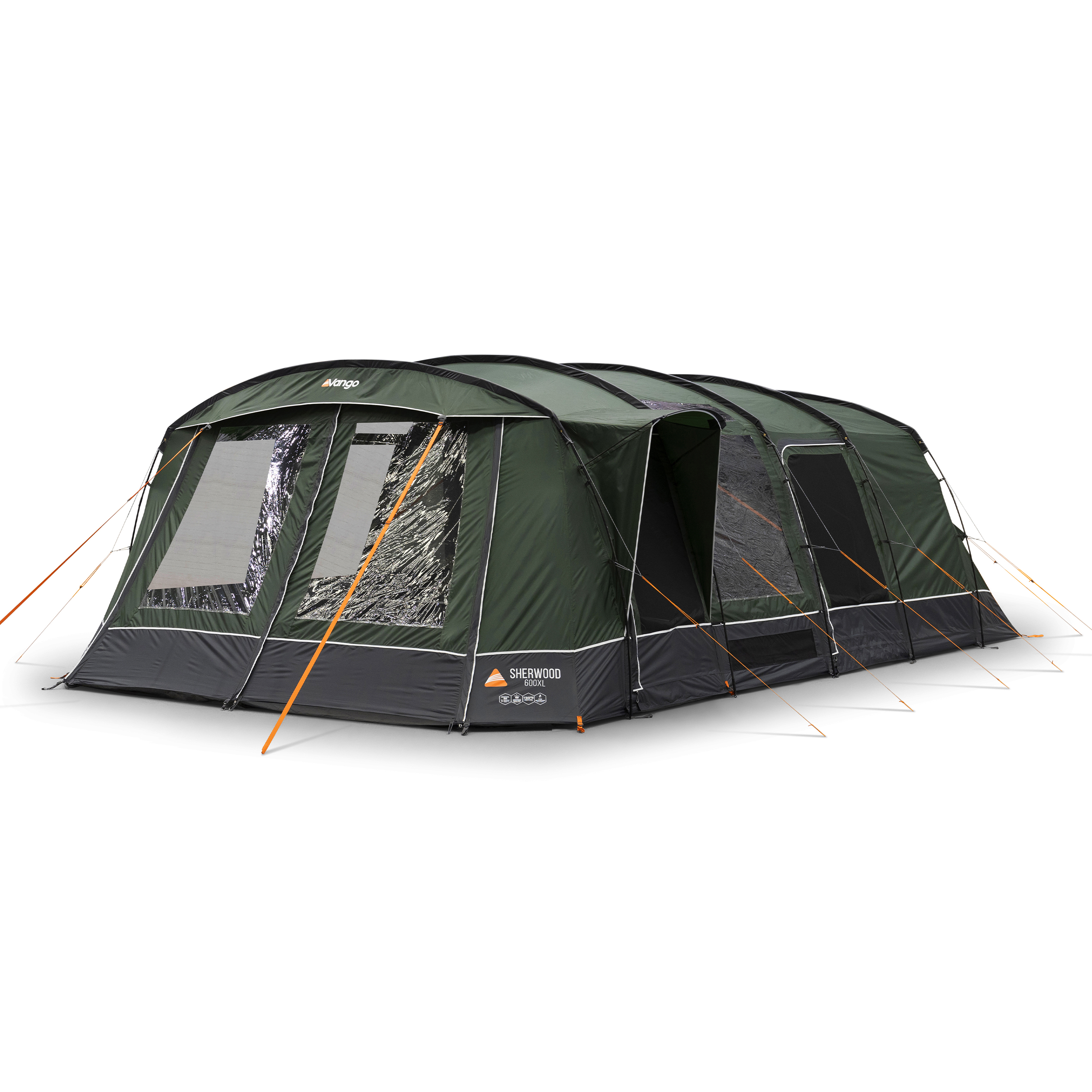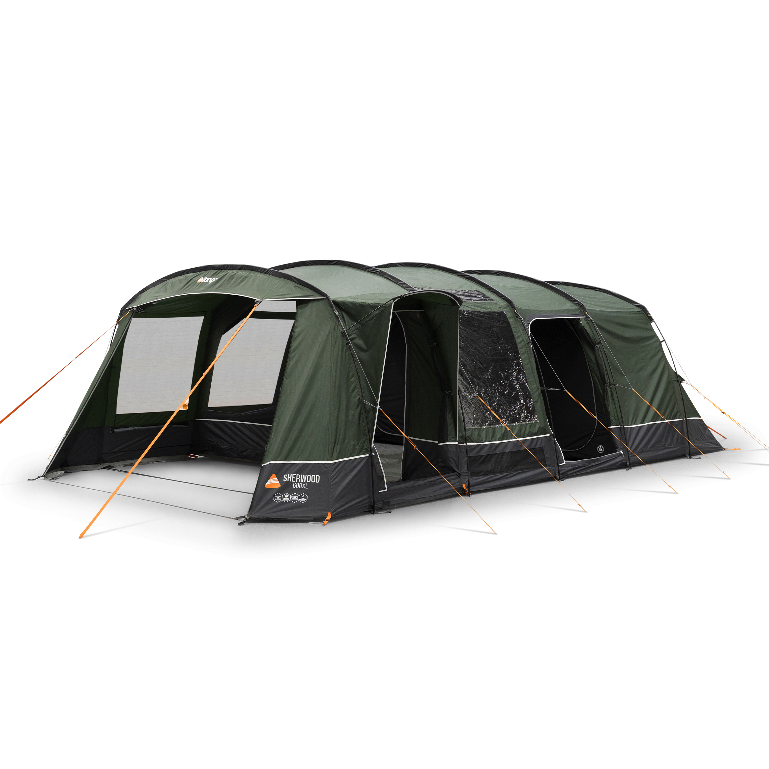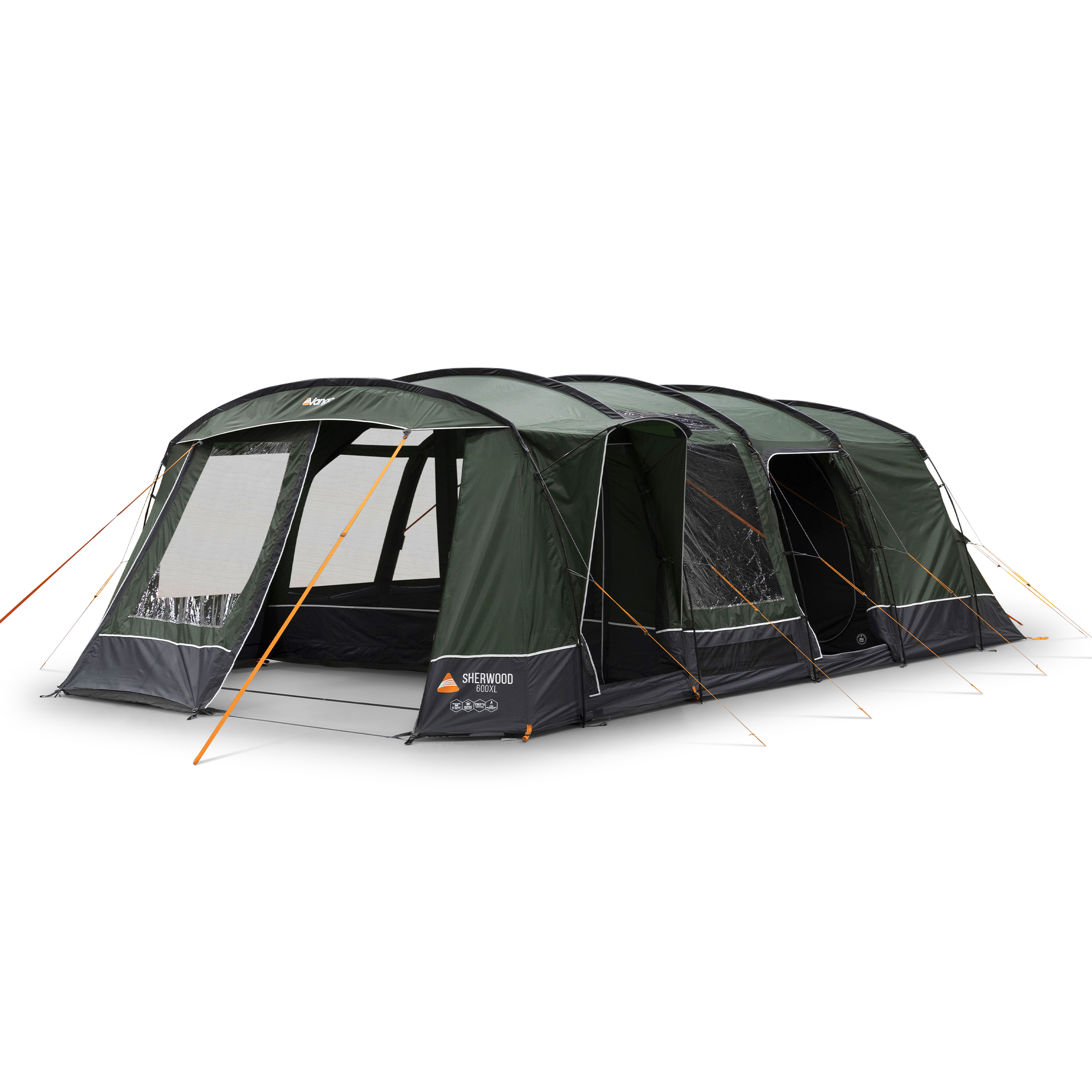The Sherwood 600XL is a 6-man Powerflex® Fibreglass poled tent with an integrated front awning that adds additional living space. This spacious 6-man tent has a covered side entrance, helping keep you dry from the elements, and an extended living area, perfect for socialising or storing kit. The Sherwood is part of our Excel collection, which features a highly waterproof and durable 150D embossed fabric, boasting a 5,000mmHH. The Excel collection also utilises our ColourLok technology, designed to increase fabric colour retention against UV light. Features include King Size Midnight Bedrooms, a premium darkened fabric used in bedrooms to allow for a great and comfortable night's sleep with plenty of space. The Sherwood 600XL is also compatible with the optional Universal Inner, offering an additional sleeping or storage area in your tent living area.