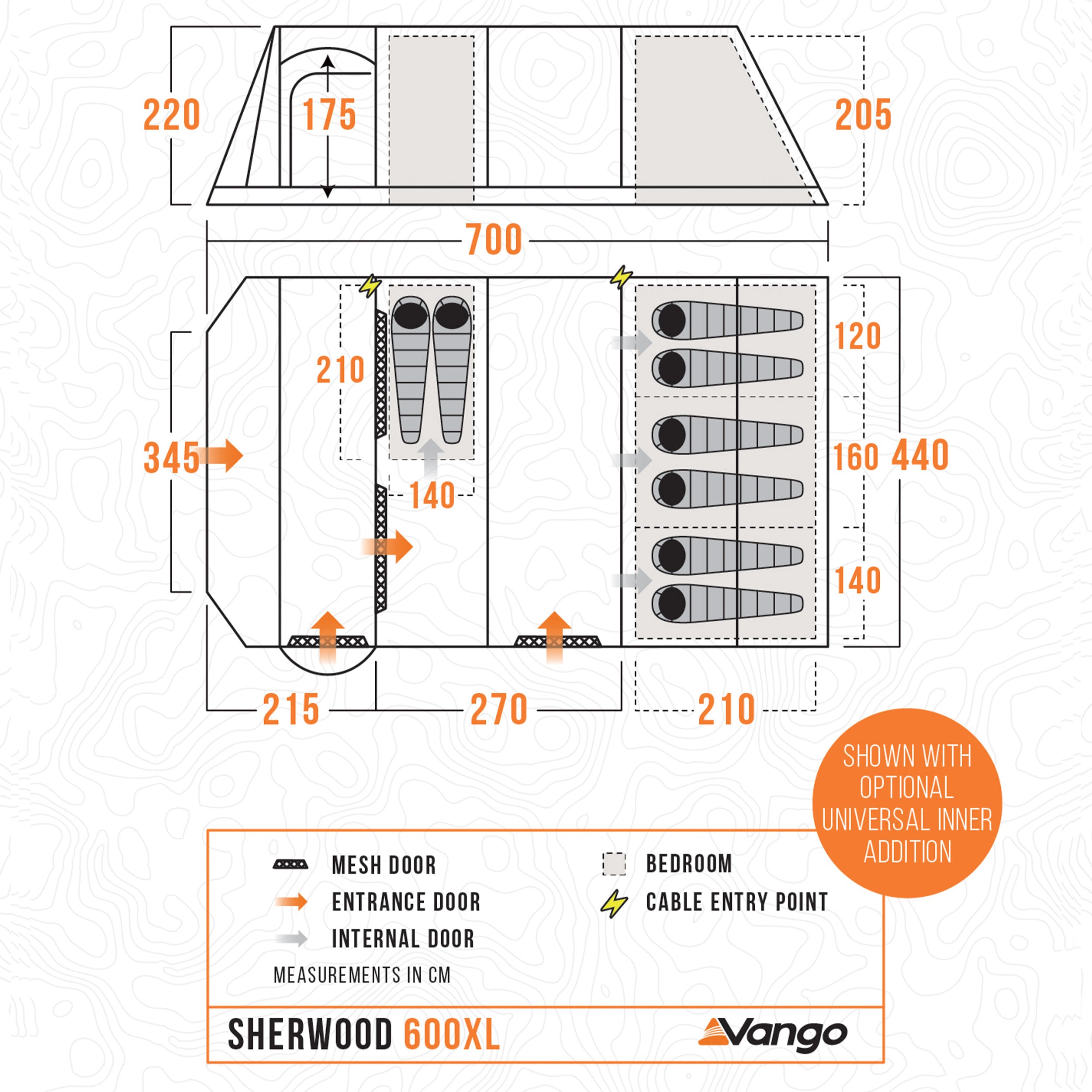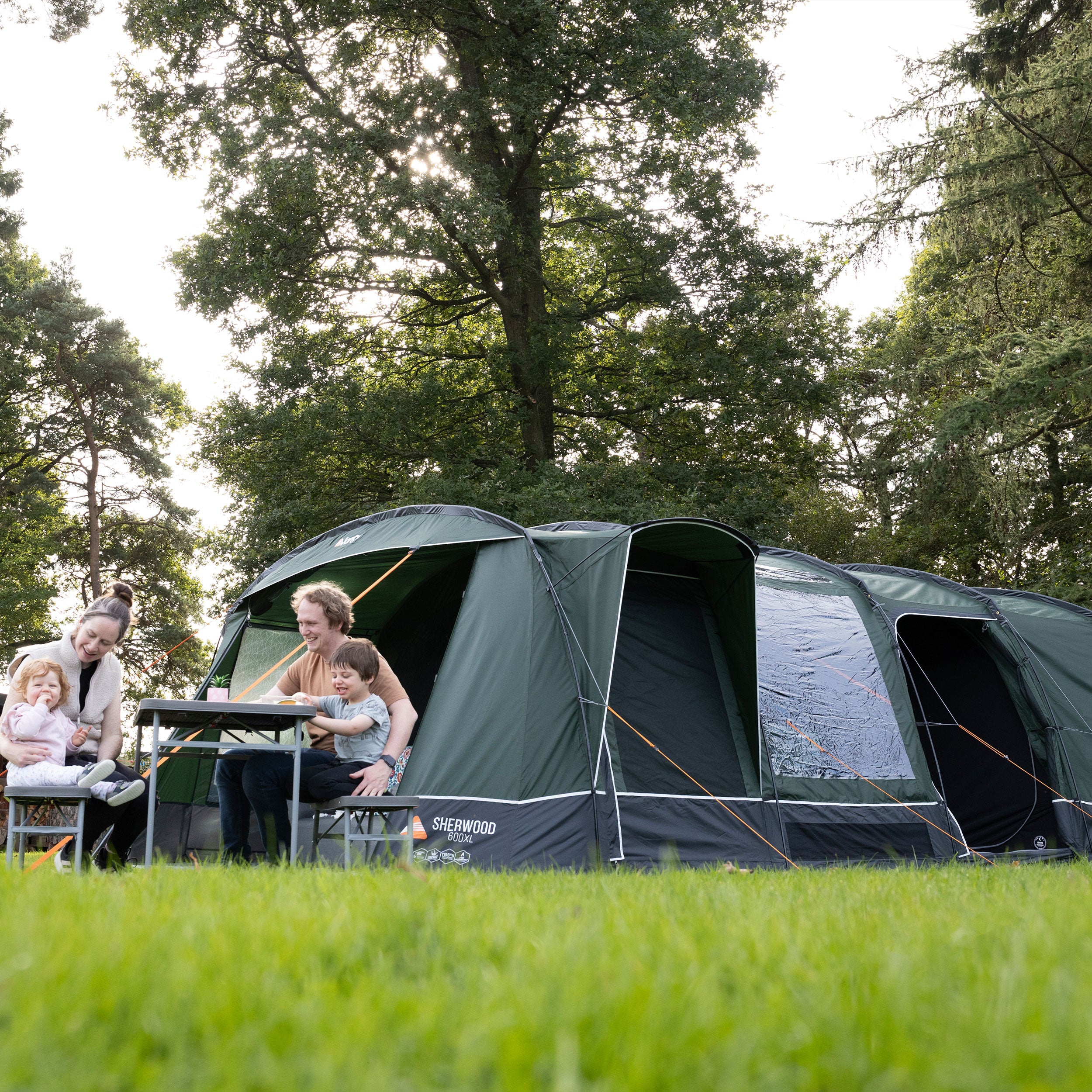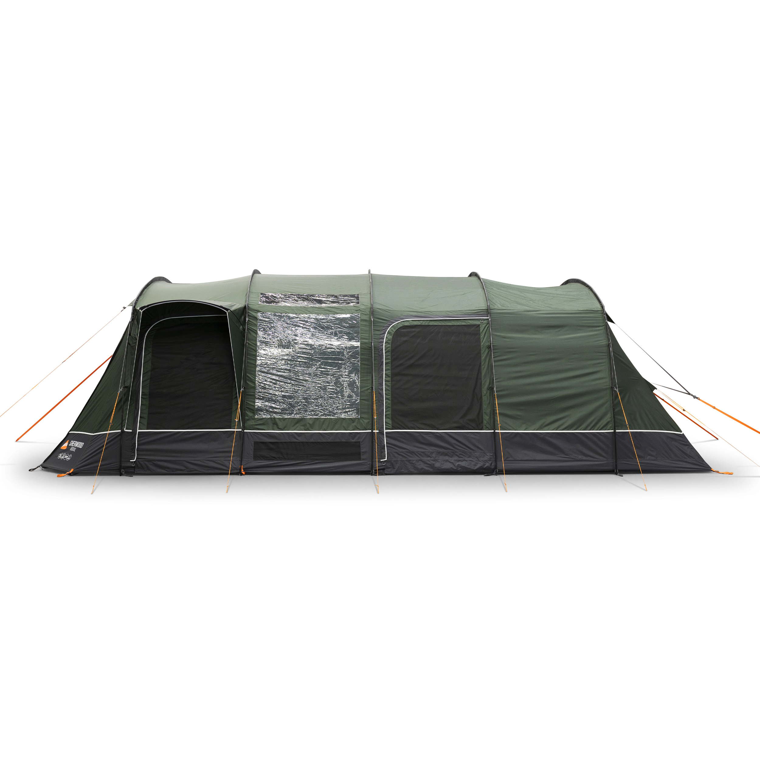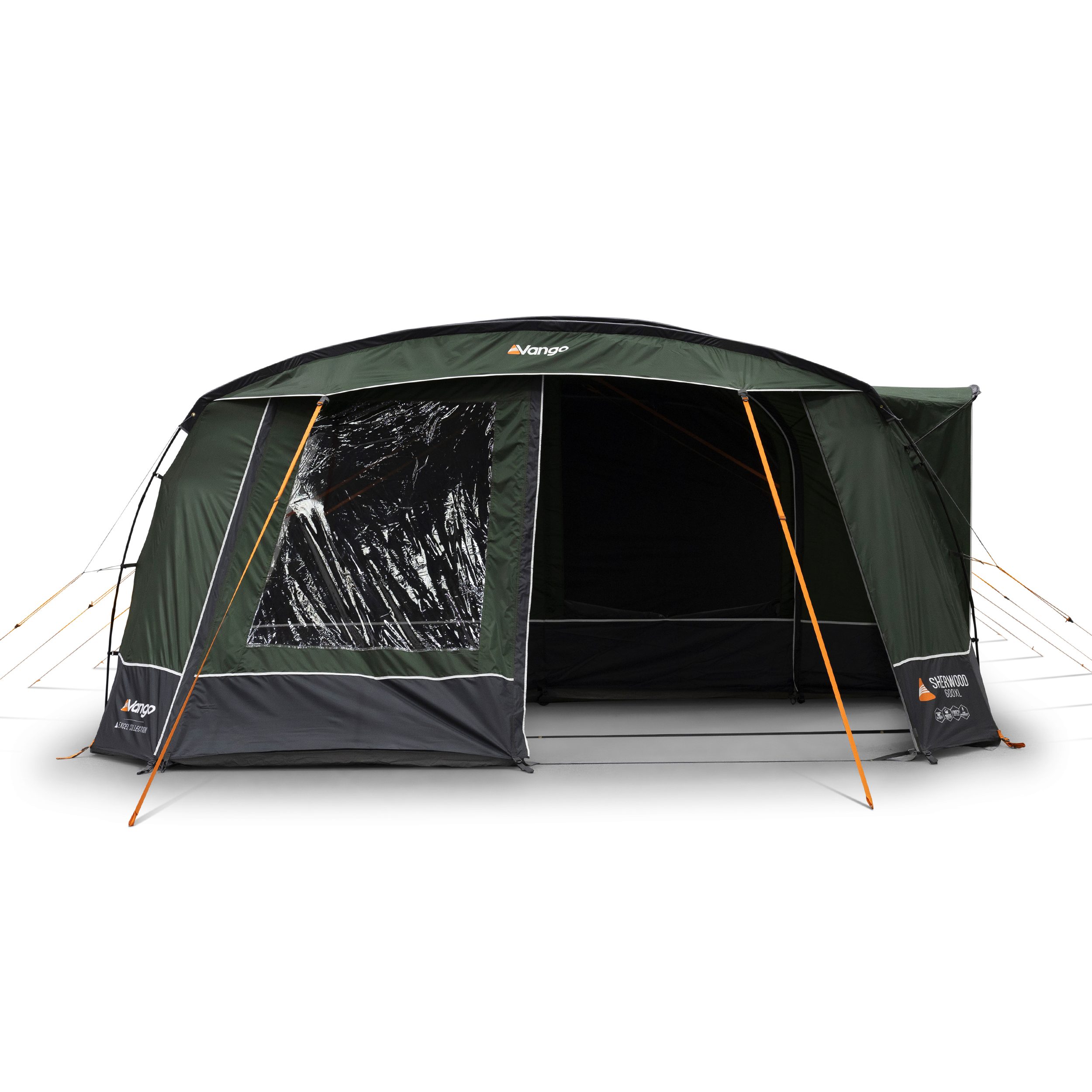 The Sherwood 600XL is a 6-man Powerflex® Fibreglass poled tent with an integrated front awning that adds additional living space. This spacious 6-man tent has a covered side entrance, helping keep you dry from the elements, and an extended living area, perfect for socialising or storing kit. The Sherwood is part of our Excel collection, which features a highly waterproof and durable 150D embossed fabric, boasting a 5,000mmHH. The Excel collection also utilises our ColourLok technology, designed to increase fabric colour retention against UV light. Features include King Size Midnight Bedrooms, a premium darkened fabric used in bedrooms to allow for a great and comfortable night's sleep with plenty of space. The Sherwood 600XL is also compatible with the optional Universal Inner, offering an additional sleeping or storage area in your tent living area.