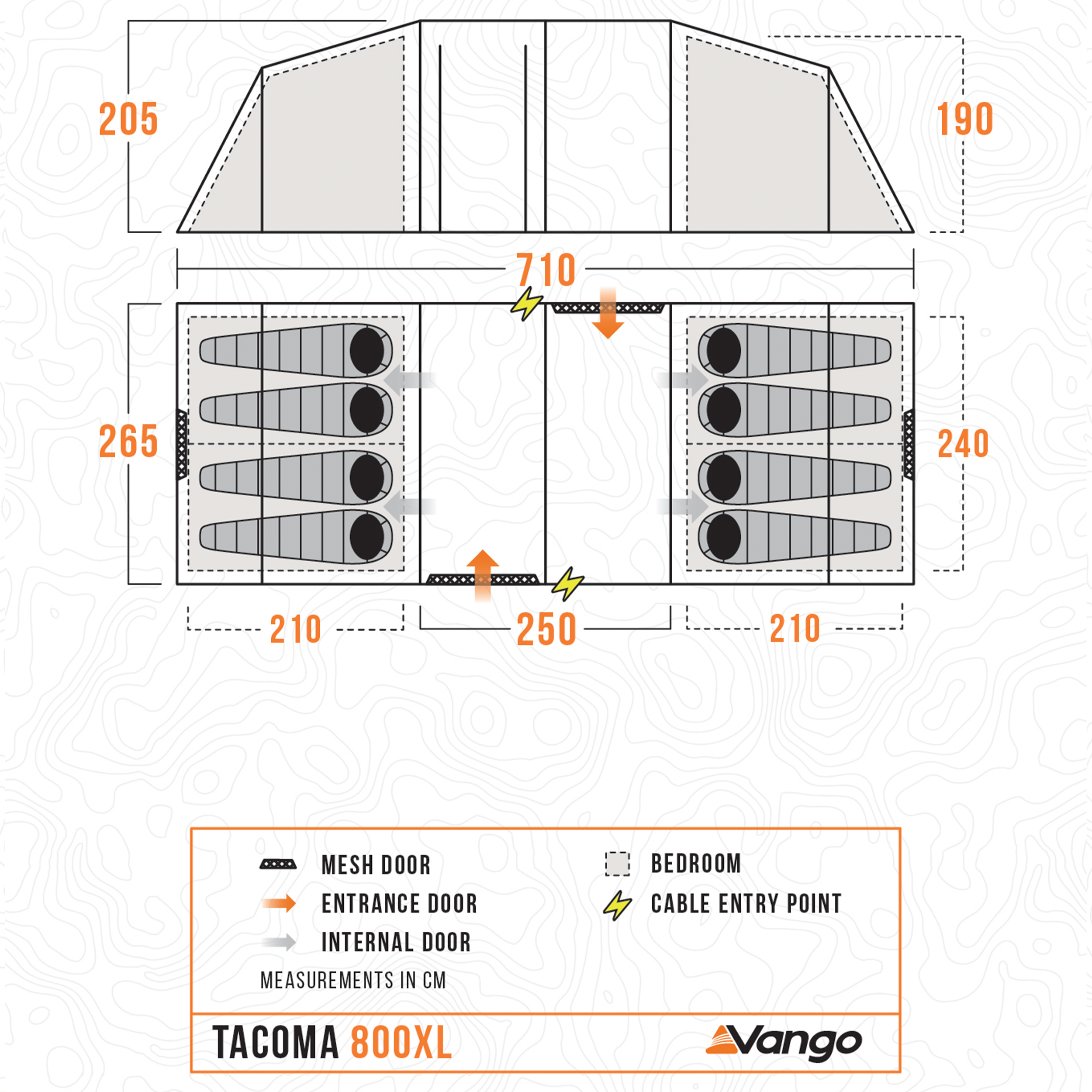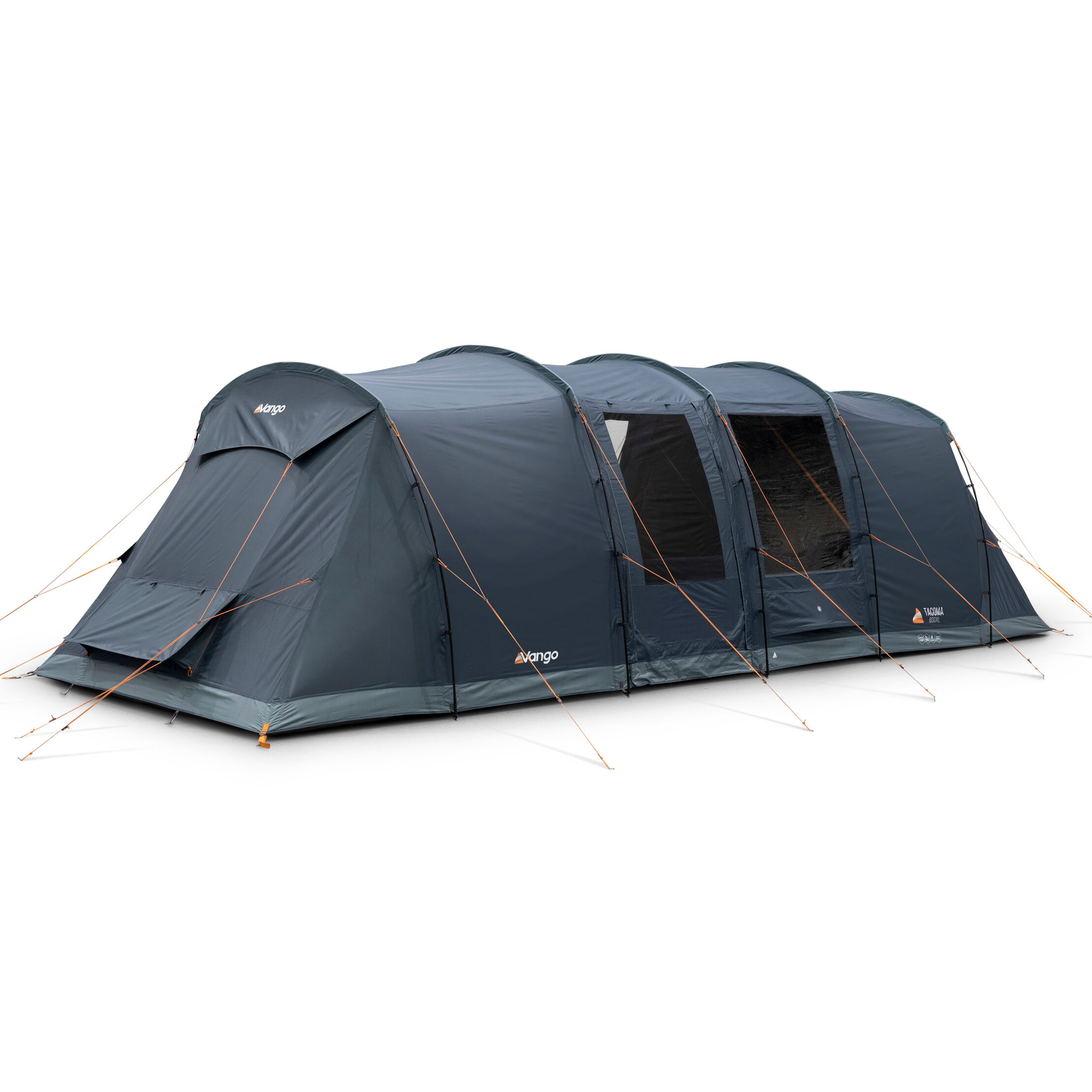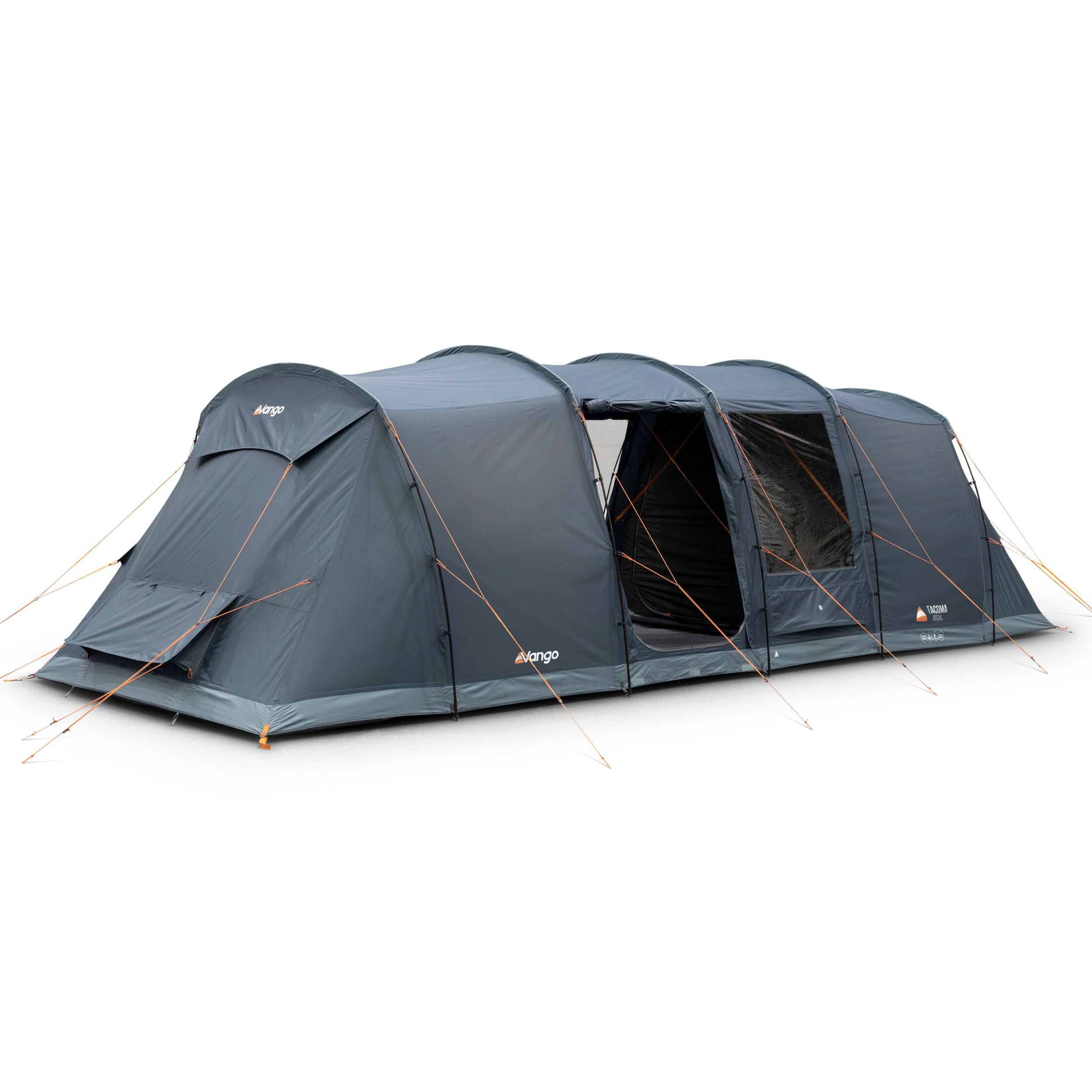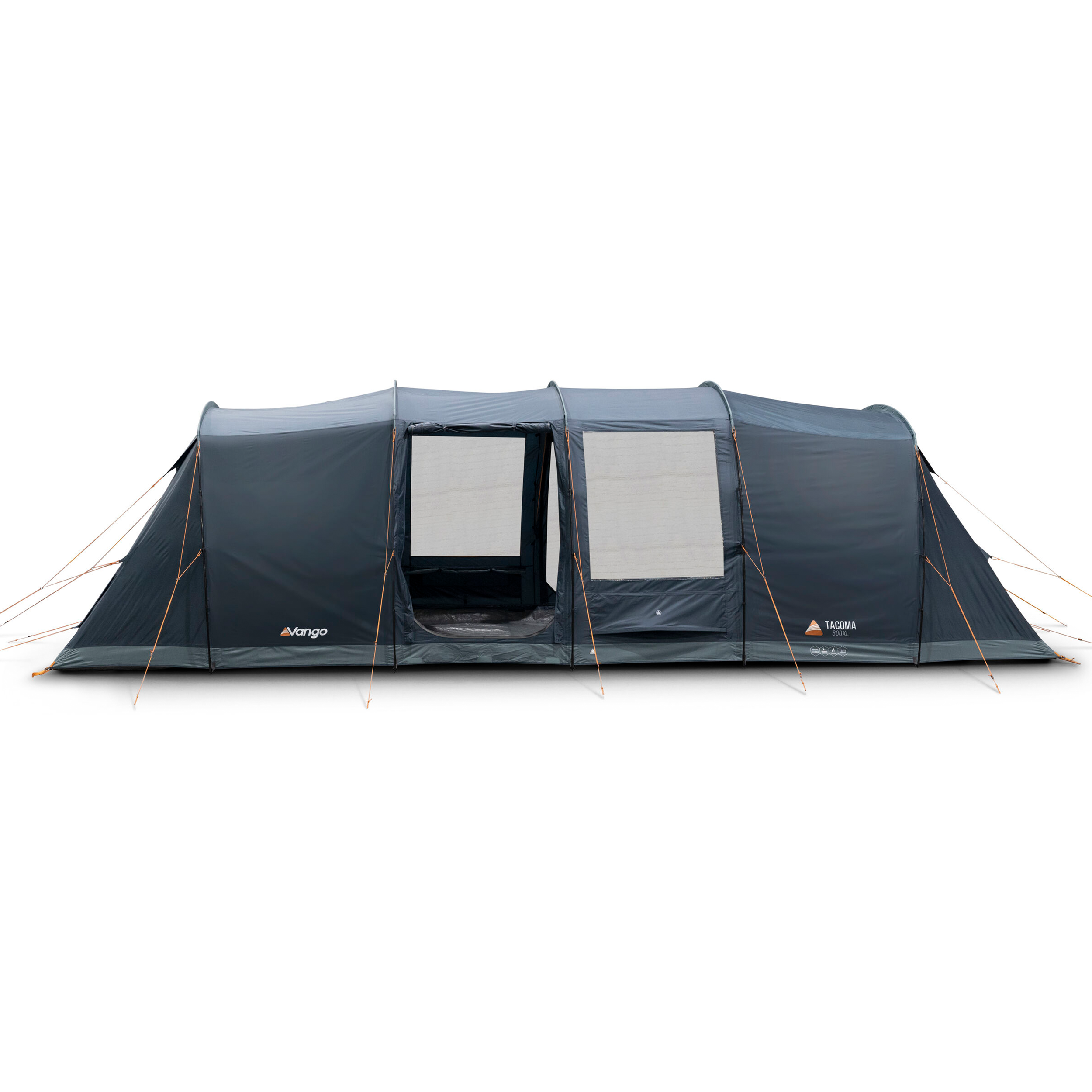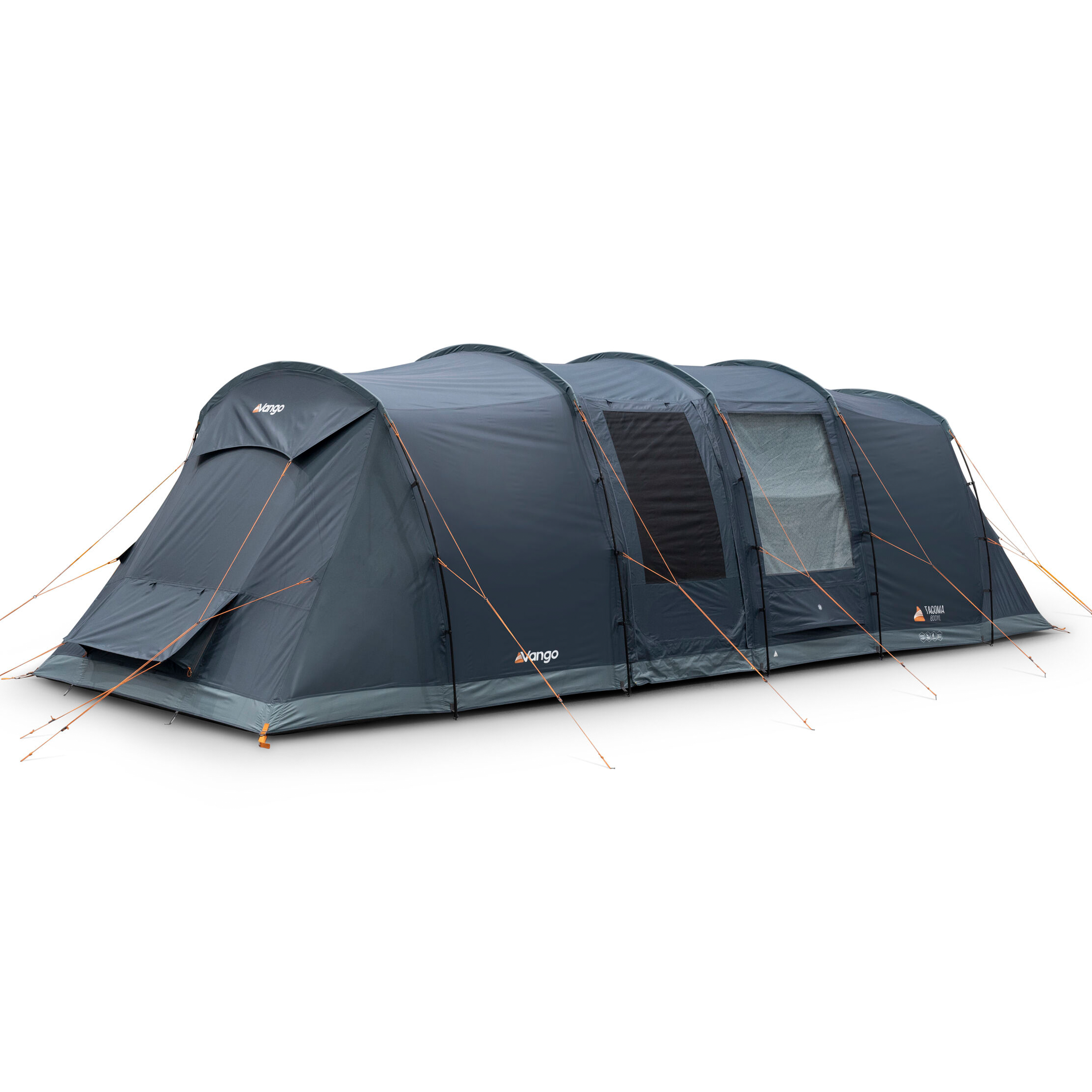 The Tacoma 800XL is an 8-man Powerflex® Fibreglass poled tent with a vis-a-vis layout. Airflow vents have been incorporated into the design to increase airflow and ventilation. The Tacoma is designed specifically for campers who prefer more private sleeping areas, with a generous living area in the middle. The living space incorporates large Diamond Clear windows allowing light to pour into the living area during the day with the ability to cover with the roll-away toggled curtains at night. Dynamic Weave 100™ Fabric keeps pack size and weight low, while ensuring Vango quality and durability. The optional side awning provides a functional porch that’s great for storing extra kit.