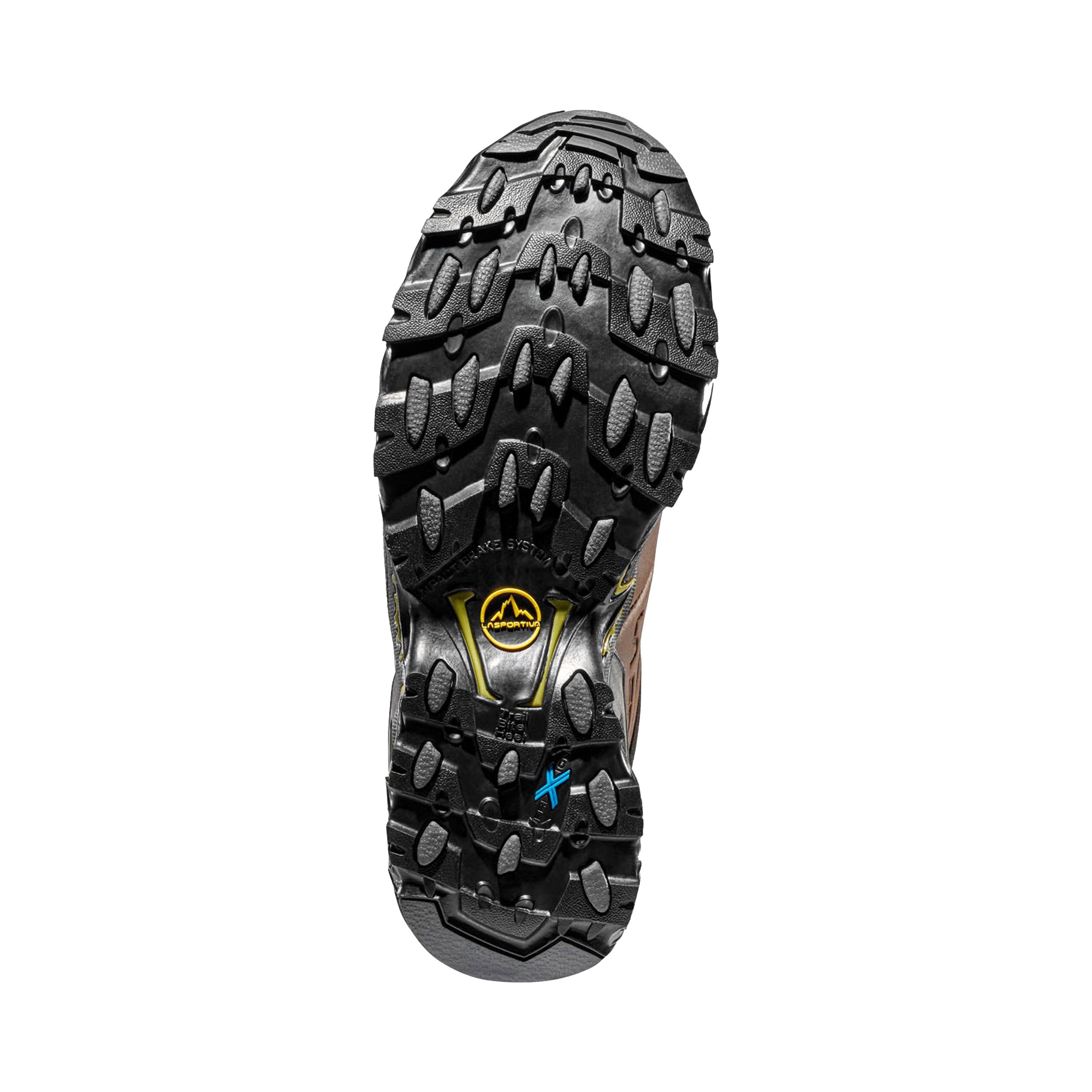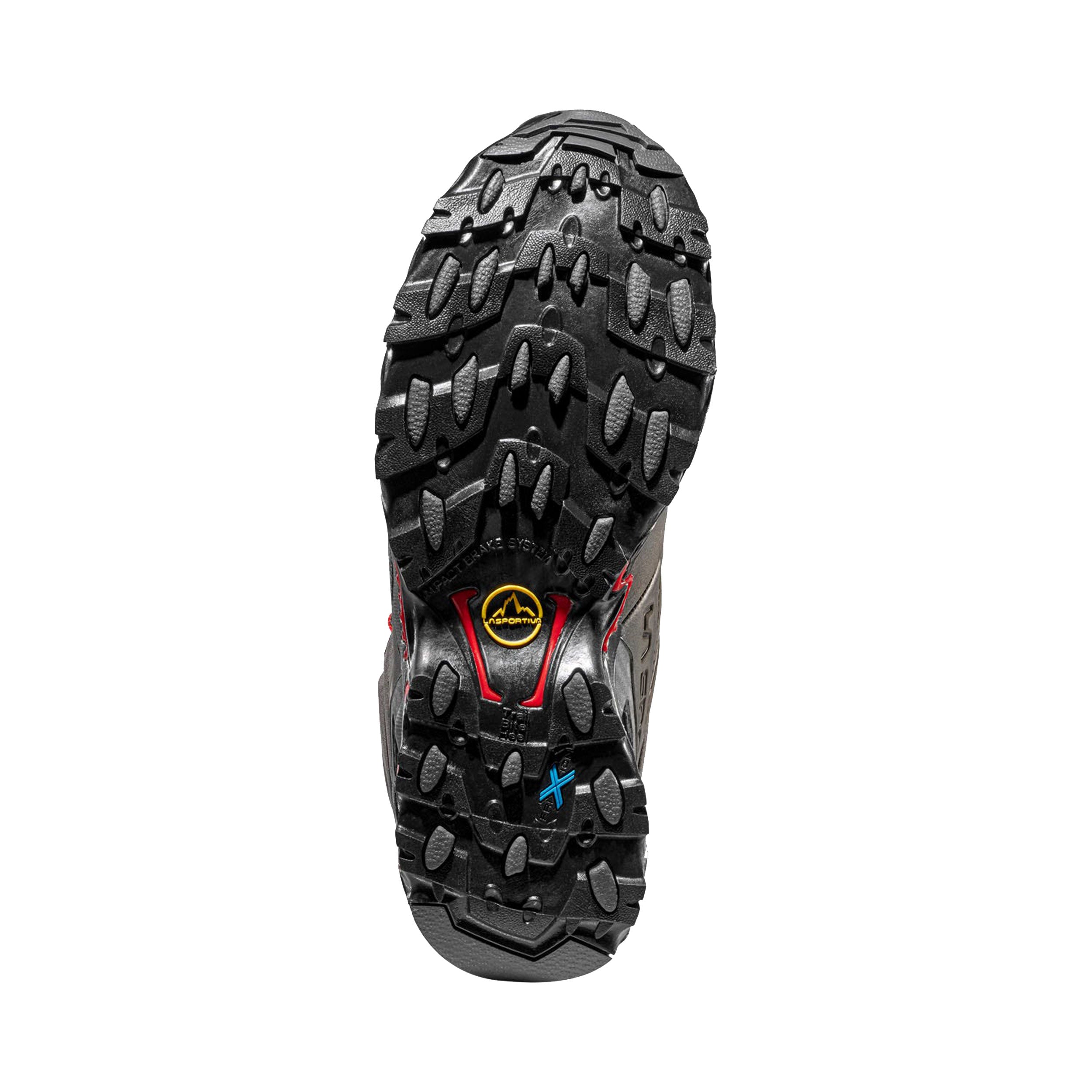 The FriXion™ Blue outsole is crafted from a soft, long-lasting compound that offers excellent grip, making it ideal for various terrains. The sole is designed with a pronounced Trail Bite Heel, which enhances braking performance on descents, providing greater control and stability. This versatile outsole is perfect for hiking and running on both road and track surfaces. It also features an all-terrain grip combined with La Sportiva's Impact Brake System for added traction and security.