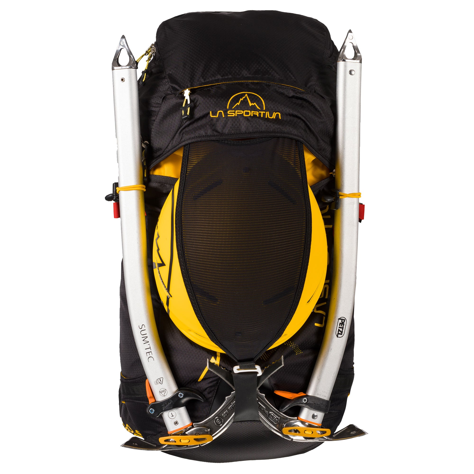 Mountain hiking & ski mountaineering backpack featuring ice-axe holder, lateral ski attachment, compatible with various hydration systems. Helmet holder included. Sturdy, resistant fabric. In addition to the normal opening, in the upper part, it has wide access through the back that can be completely opened.