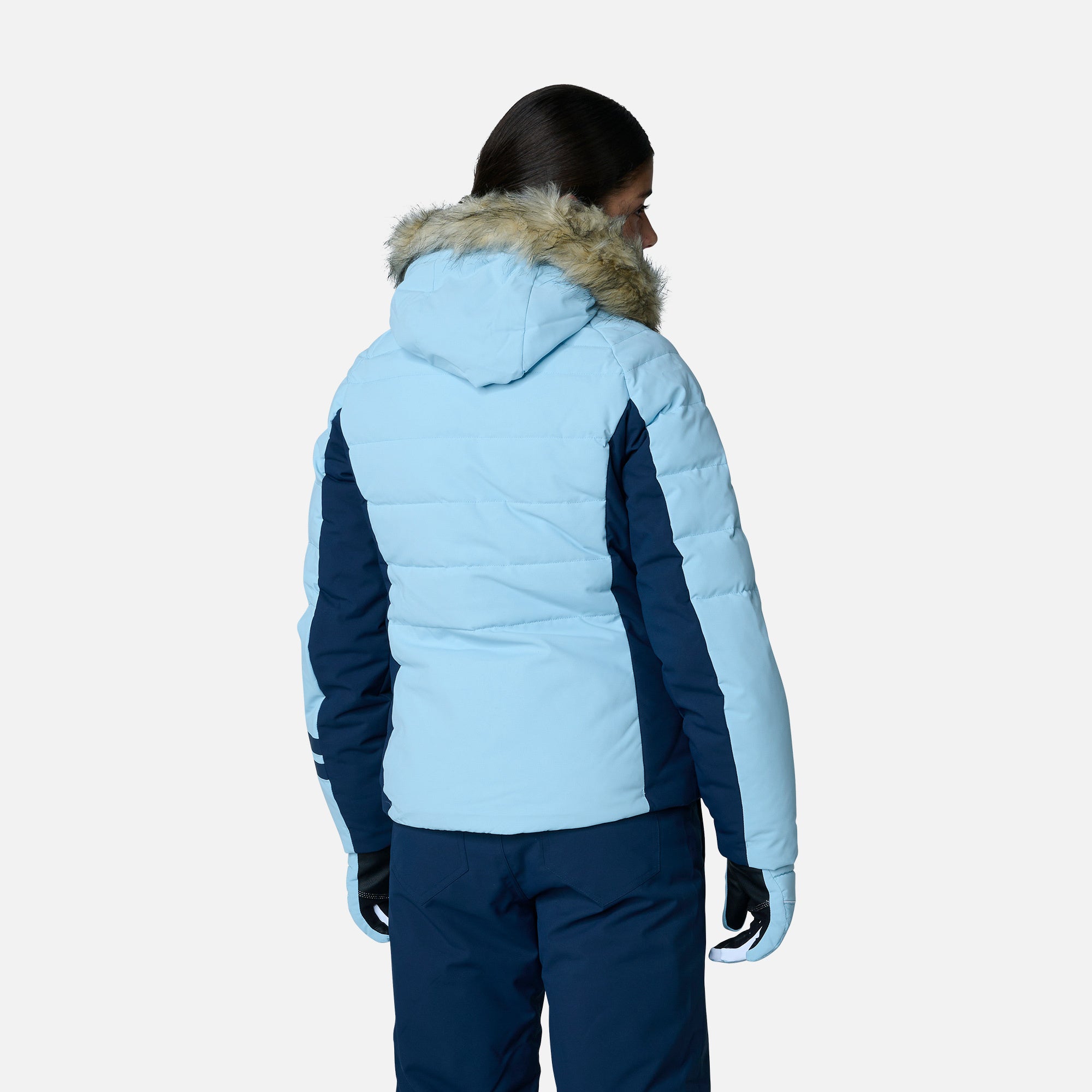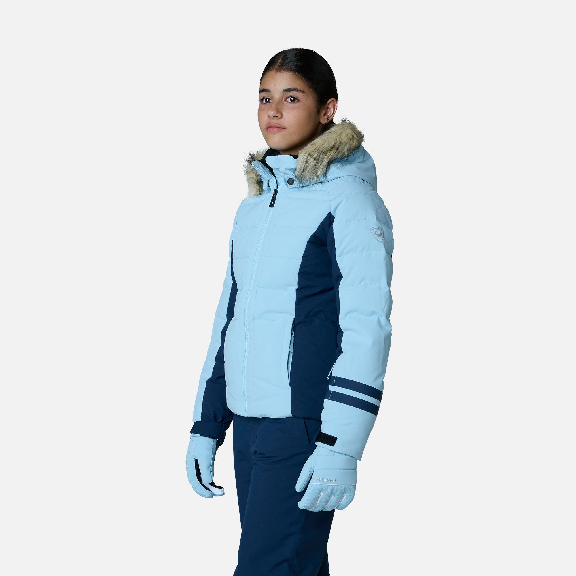 Warm kids have more fun on the mountain. The girls' Rossignol Polydown Ski Jacket features high-loft synthetic insulation in the body for down-like warmth and easy care. A waterproof, breathable membrane seals out stormy conditions to keep her dry, while ski-day details like adjustable stretch cuffs and a built-in snow skirt keep out cold and snow. A removable hood lets her choose her style.