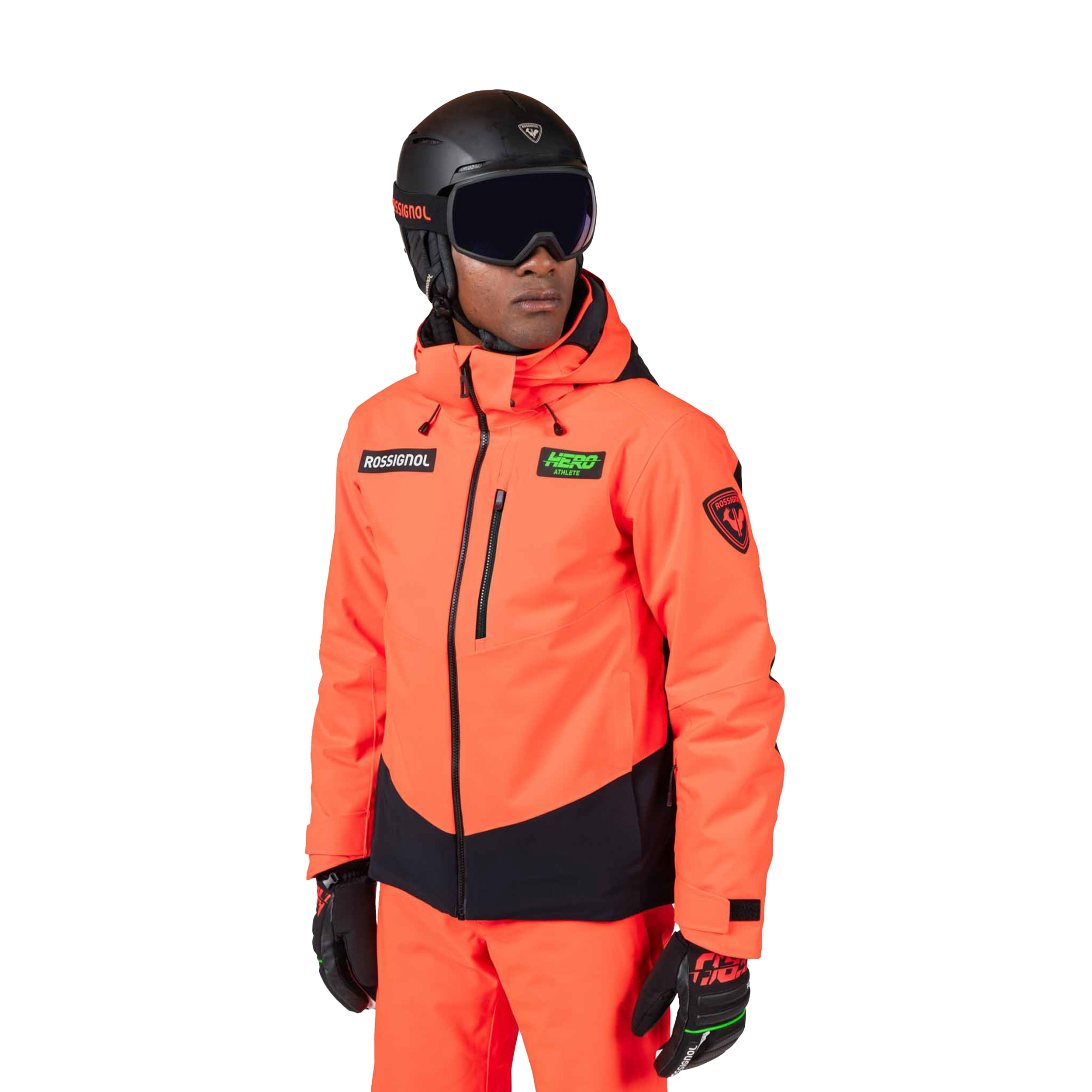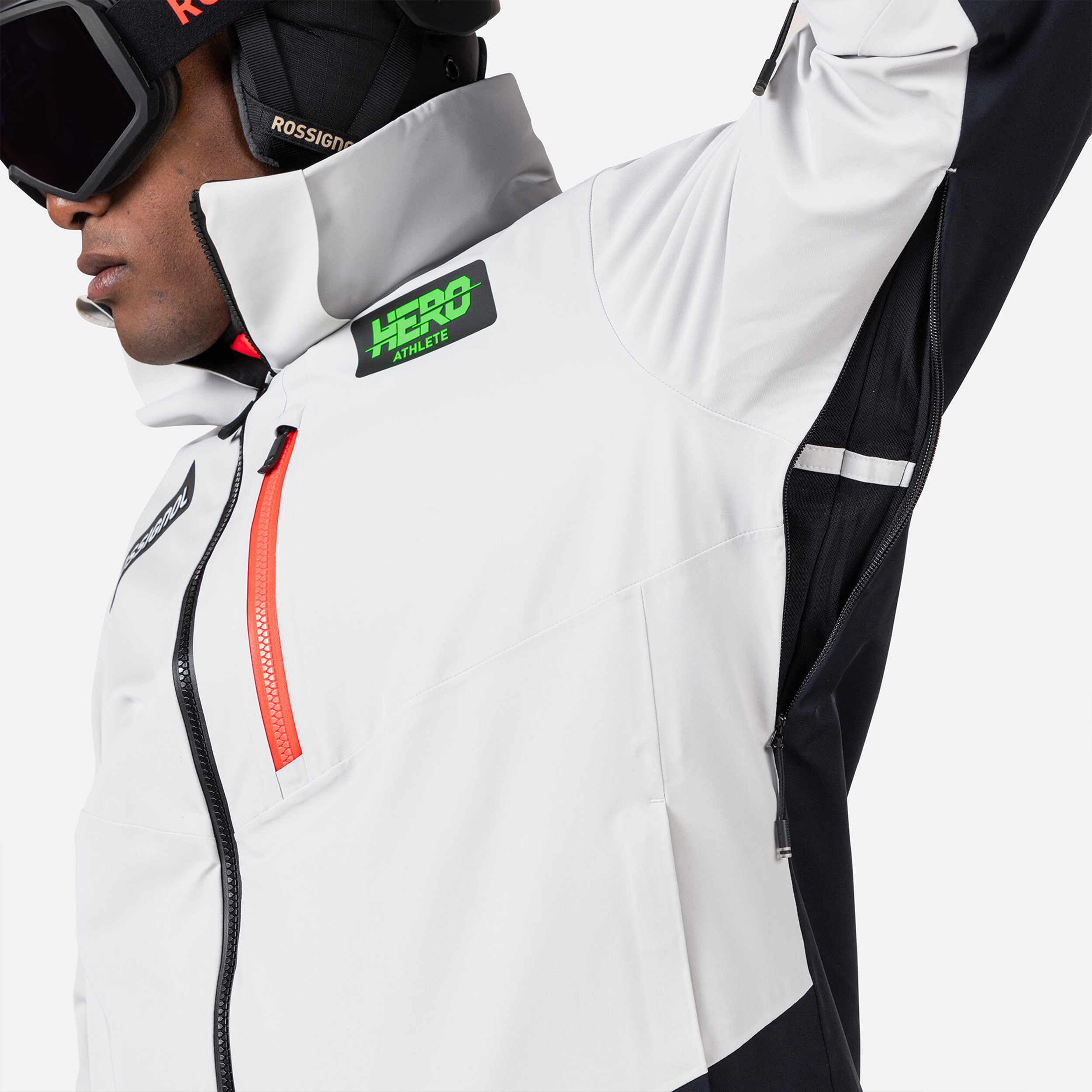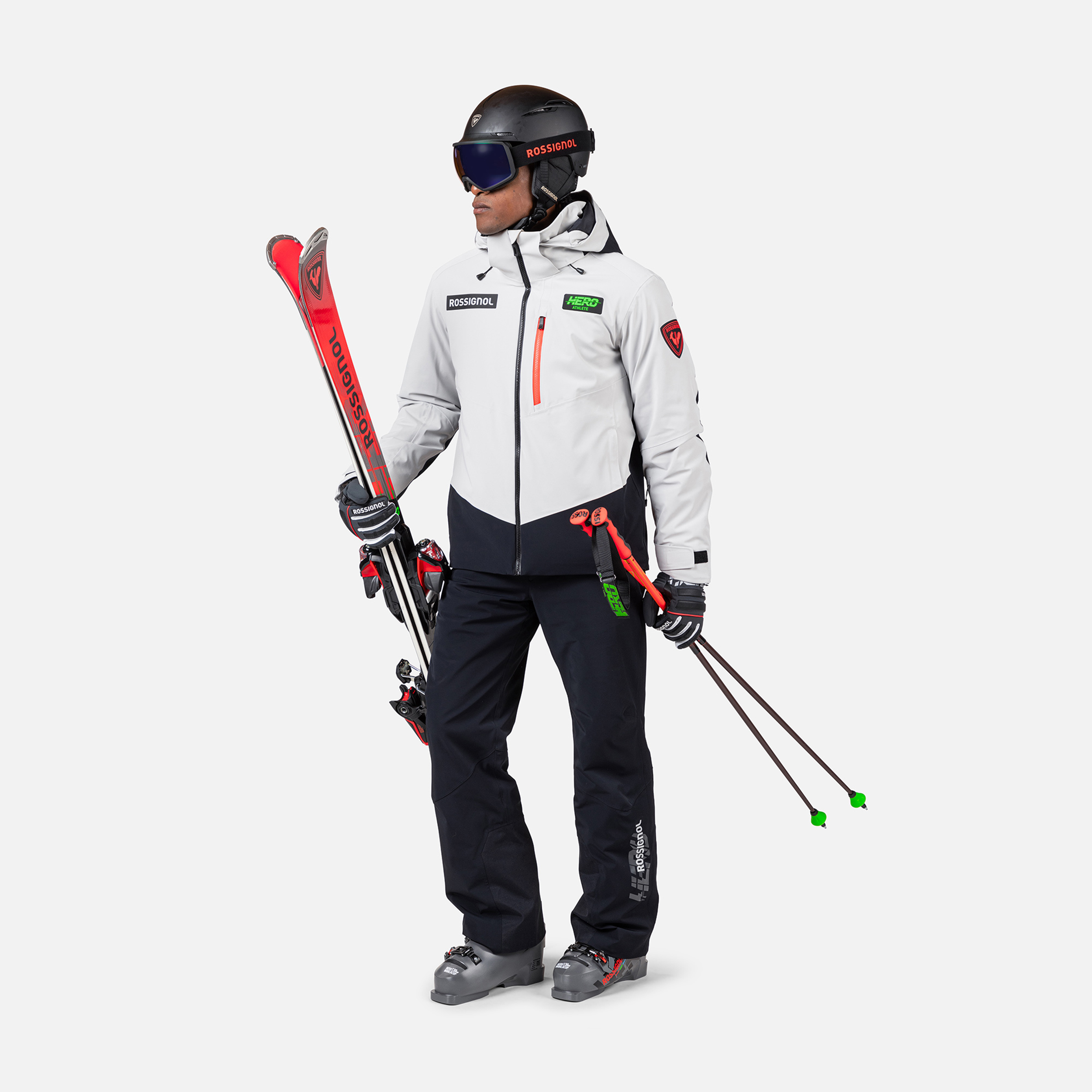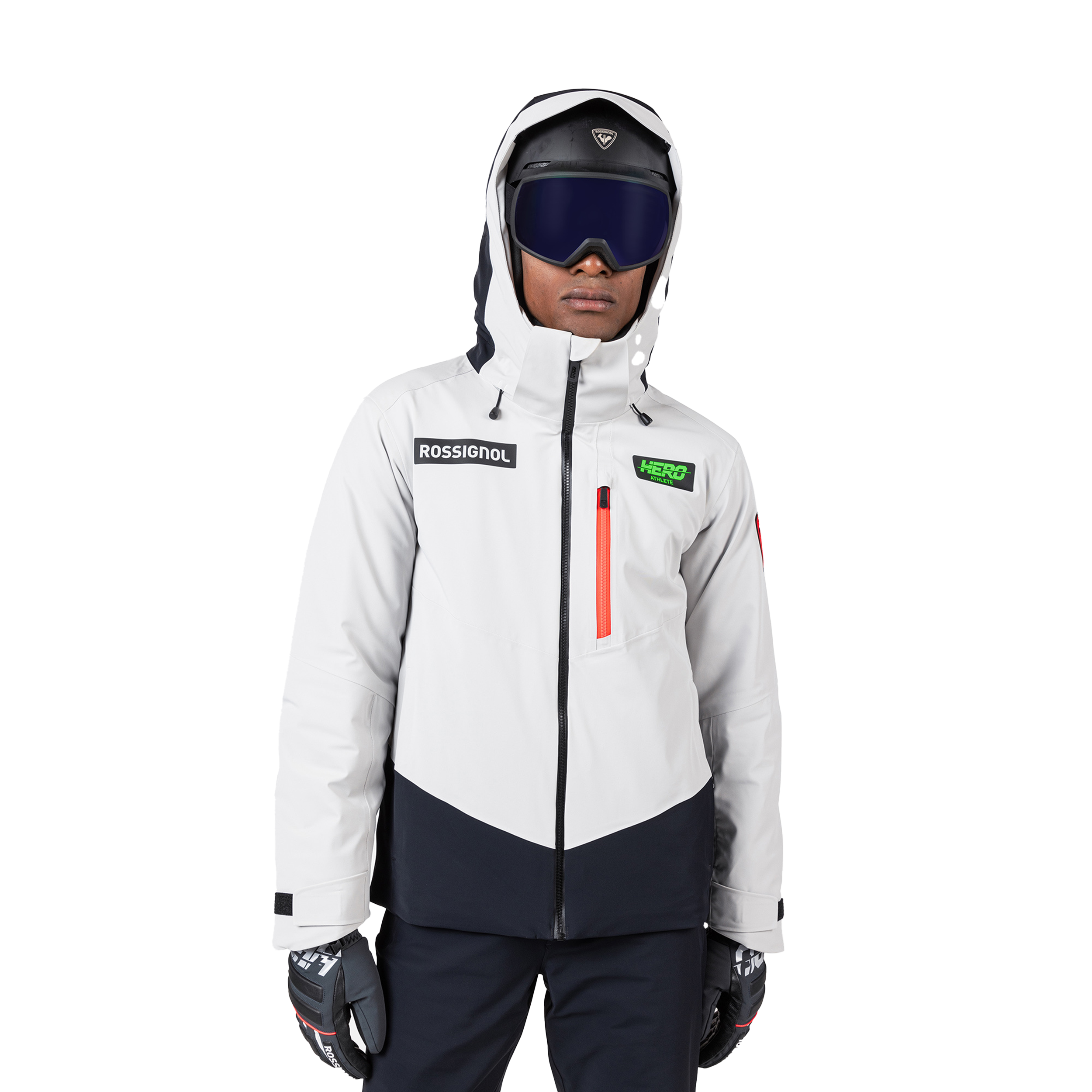 High-performance storm coverage with an elevated fit and feel for charging on the mountain. The men's Hero Blackside Insulated Ski Jacket combines the easy-moving feel of a four-way stretch shell with the latest waterproof, breathable technology to keep you dry, comfortable and skiing your best. HeiQ Smart Temp technology manages comfort by auto-adjusting breathability to match your changing body temperature, while low-profile synthetic insulation turns up the heat on cold lift rides. Fully-taped seams enhance storm protection, keeping you dry and comfortable through the stormiest weather. Ski day details like stretch cuffs with thumb loops, an attached goggle cloth and a built-in powder skirt extend your comfort range on cold days. Hero graphics pay tribute to Rossignol's legacy for speed, and a removable hood lets you customise your look.