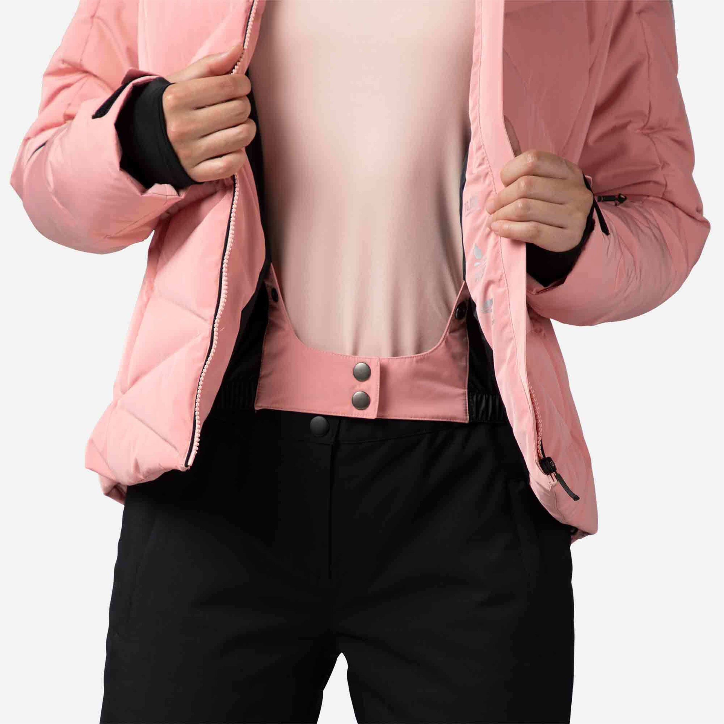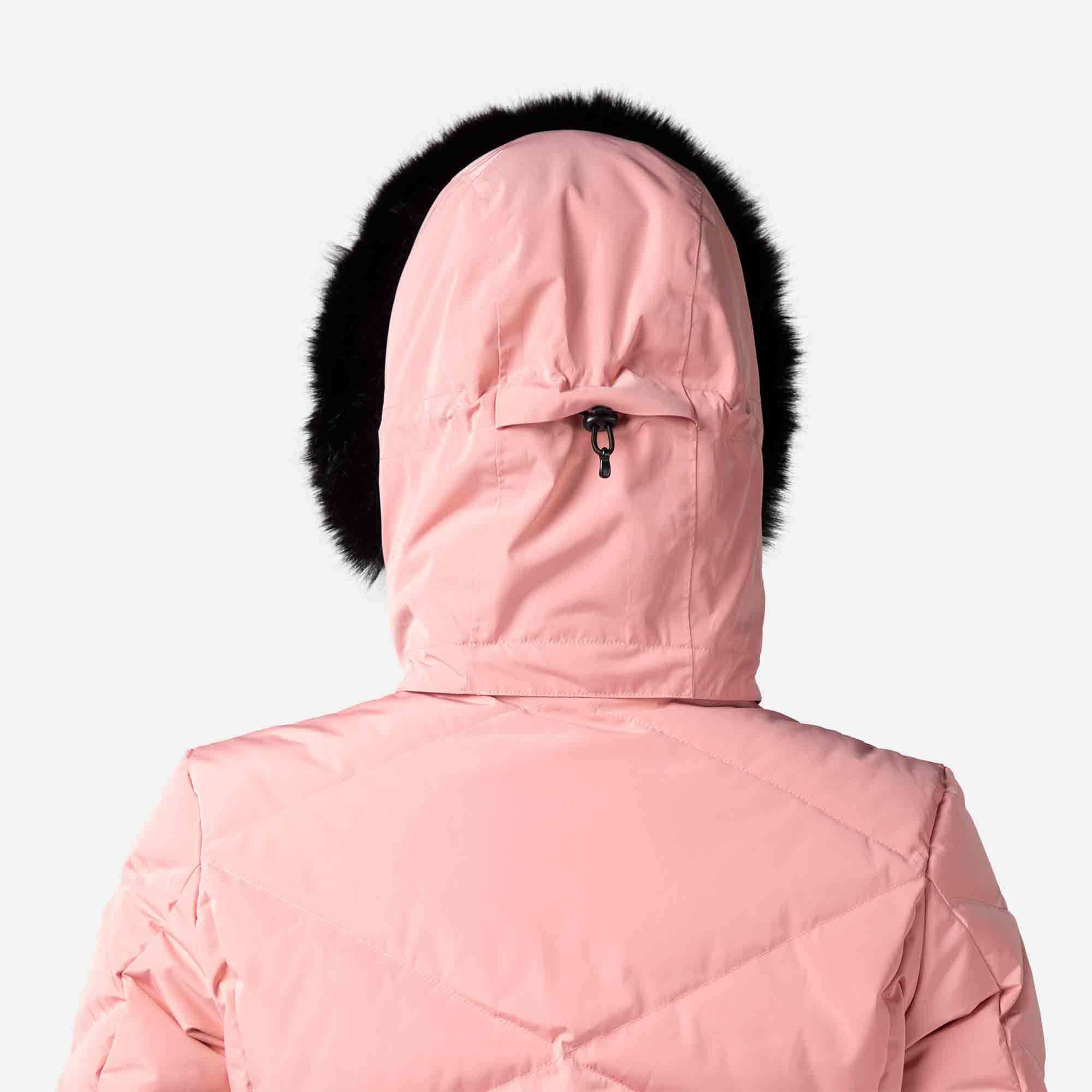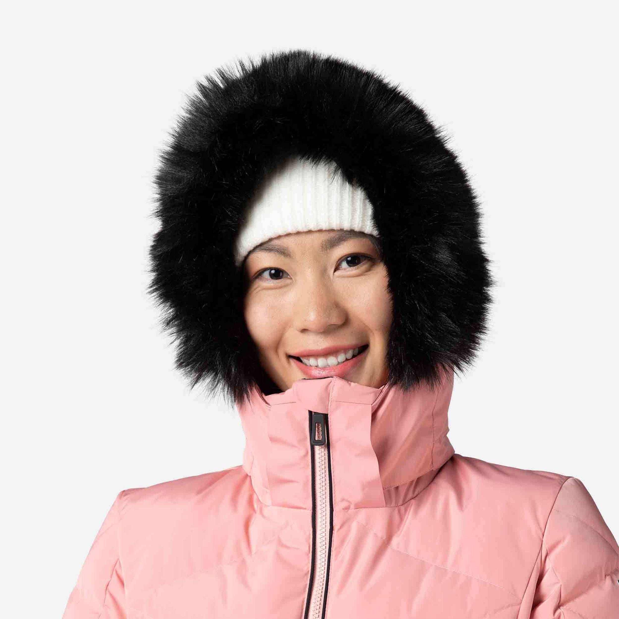 Zip up warmth you can feel. The women's Staci Ski Jacket offers all-conditions warmth with down-like synthetic insulation that seals in heat. A waterproof, breathable membrane seals out cold, stormy weather to keep you dry. A built-in powder skirt and integrated stretch cuffs with thumb loops further seal out the cold. The removable hood includes a detachable faux-fur trim for easy customization. Design details include a feminine fit and a signature rooster logo patch that reflects Rossignol's alpine legacy.