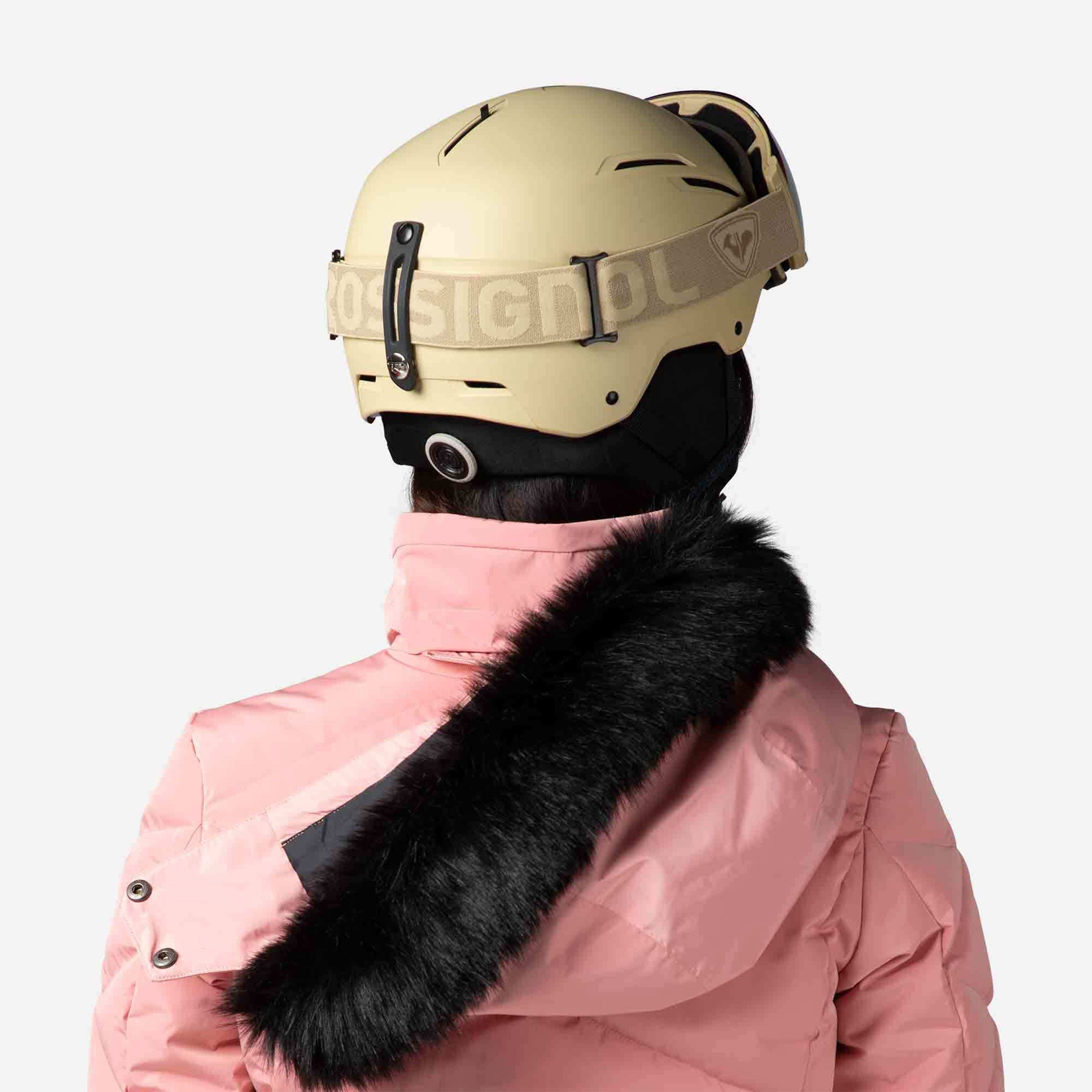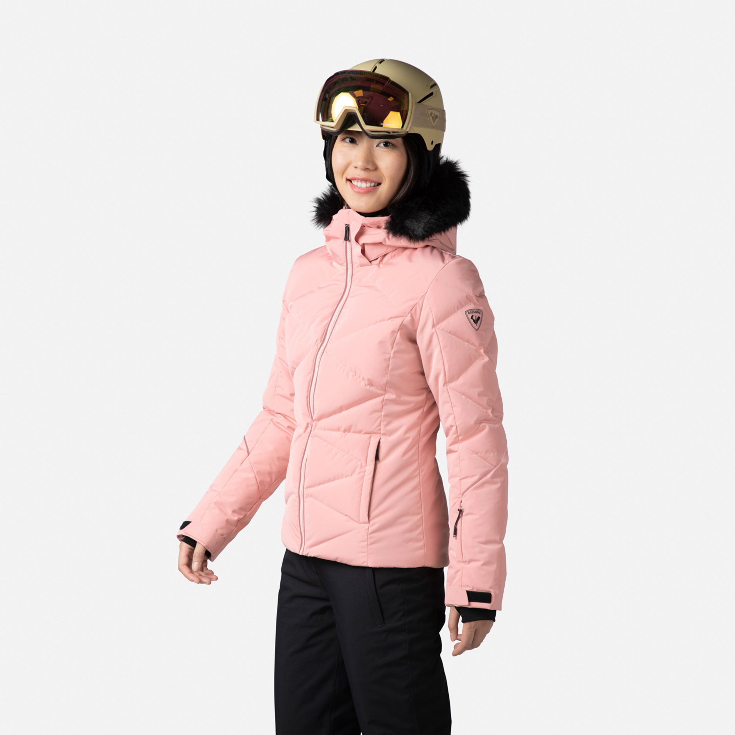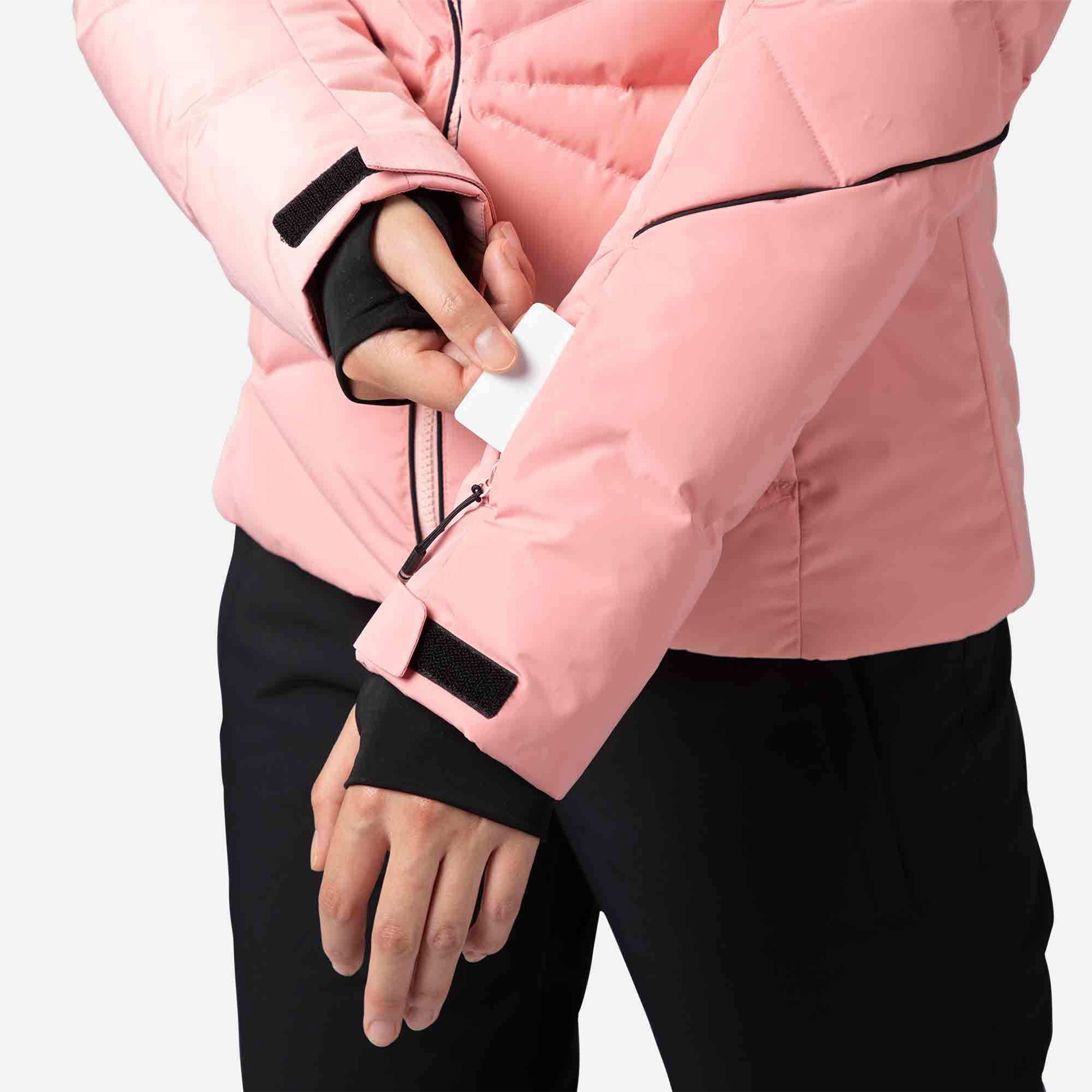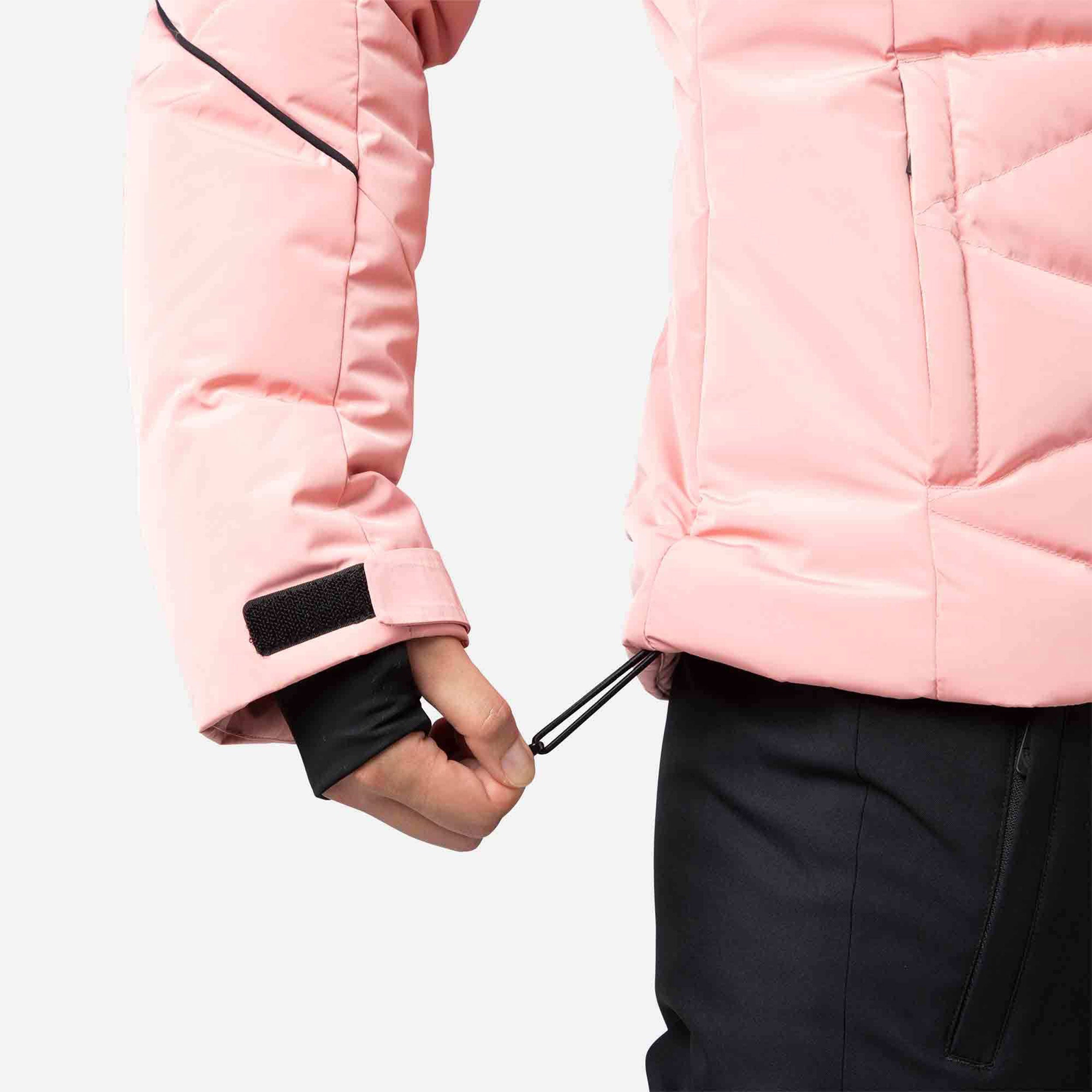 Zip up warmth you can feel. The women's Staci Ski Jacket offers all-conditions warmth with down-like synthetic insulation that seals in heat. A waterproof, breathable membrane seals out cold, stormy weather to keep you dry. A built-in powder skirt and integrated stretch cuffs with thumb loops further seal out the cold. The removable hood includes a detachable faux-fur trim for easy customization. Design details include a feminine fit and a signature rooster logo patch that reflects Rossignol's alpine legacy.