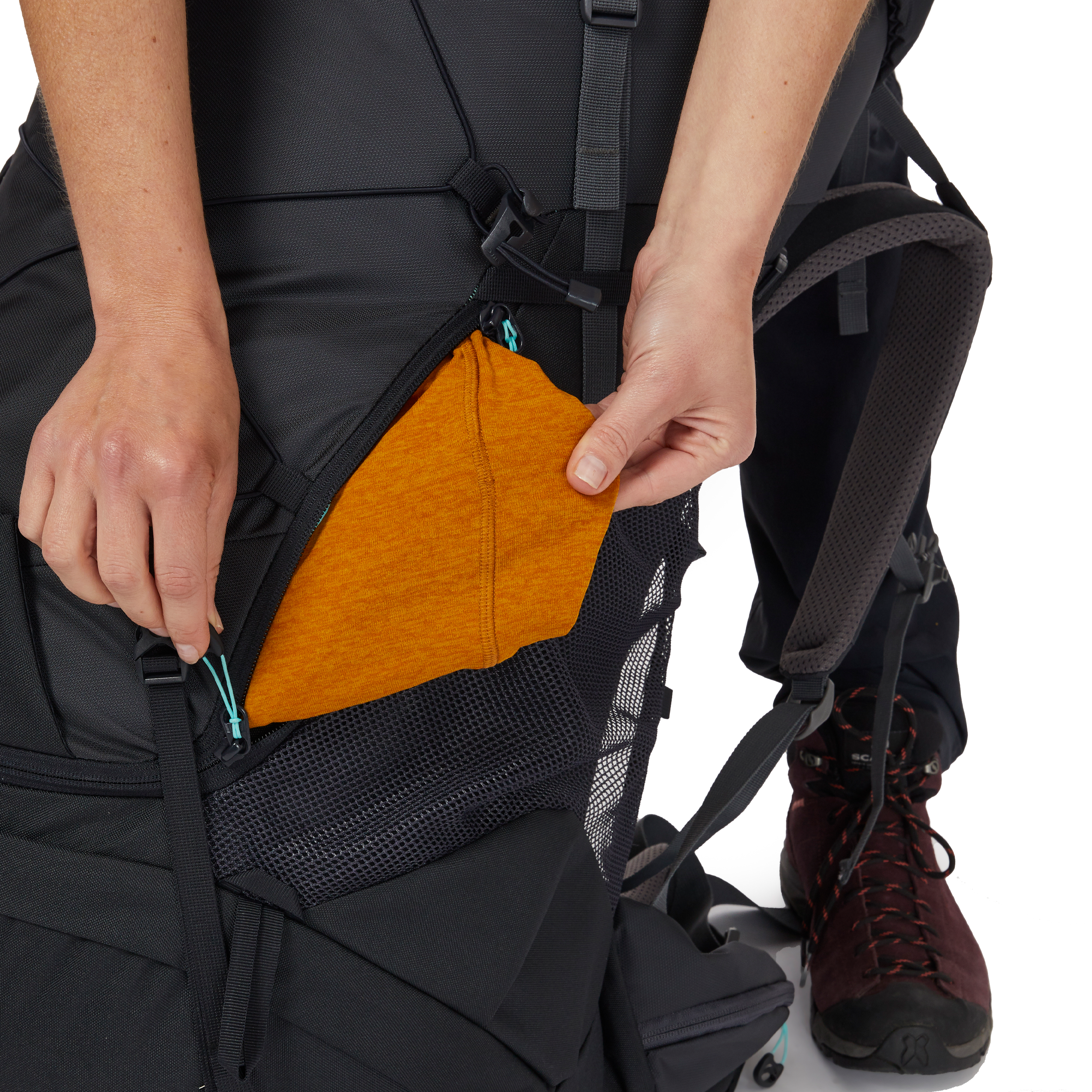 The pack offers easy access to all your kit using the zipped front and lower entry, with an internal divider panel to keep everything organised. The padded hip belt has easy-access pockets which are perfect for keeping snacks or a compass close to hand, while the elastic front bungee is the ideal place for stashing your wet gear. On extended trips you’ll be glad of the base and side compression, which you can cinch to secure your carry as supplies decrease.