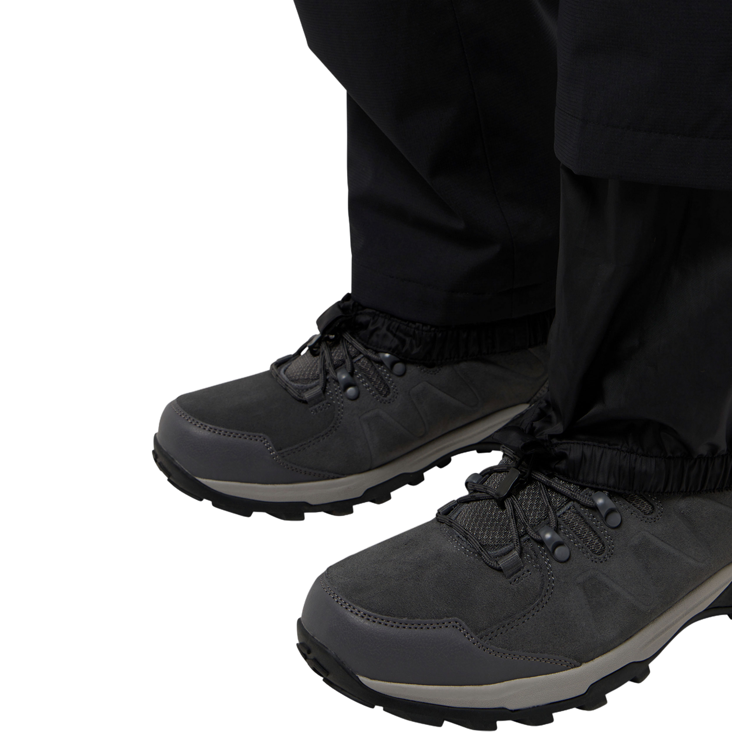 The integrated gaiters are designed with durable boot hooks that fasten securely over footwear, creating a protective barrier to block out snow, debris, and other outdoor elements. This added layer ensures feet stay dry and comfortable, providing enhanced protection and performance in challenging, rugged environments.