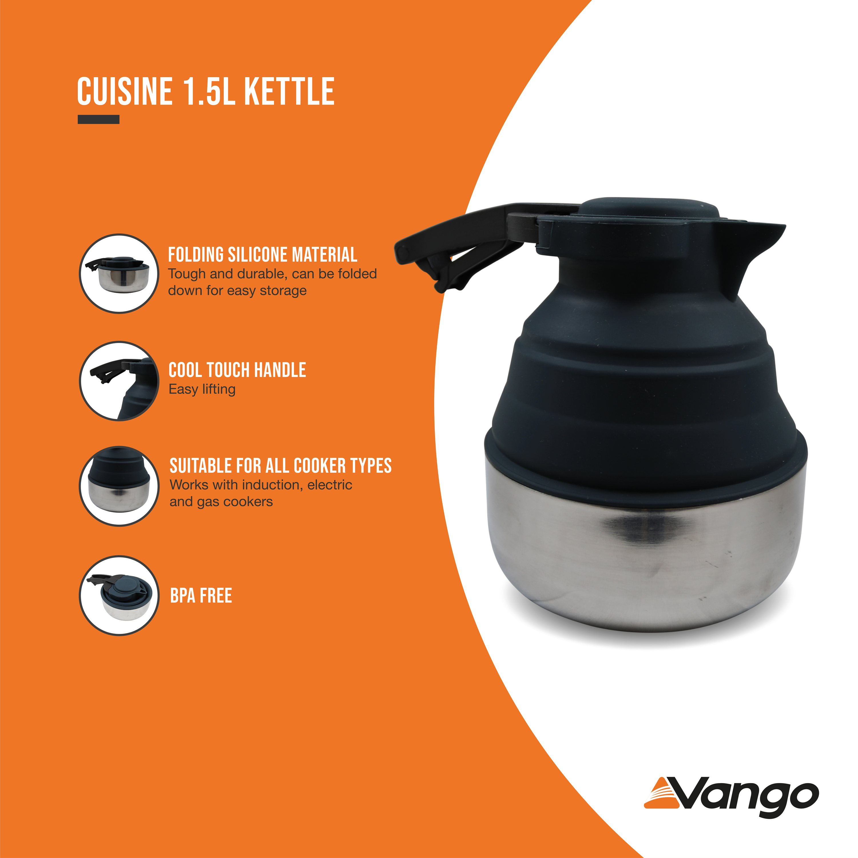 The space saving Vango Cuisine cooking Kettle 1.5L is the perfect partner for any adventure. Made from silicone, this kettle is easy to clean and can fold down for transport and storage. Able to work on induction, electric and gas cookers, you will never be far from your home from home luxuries.
