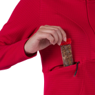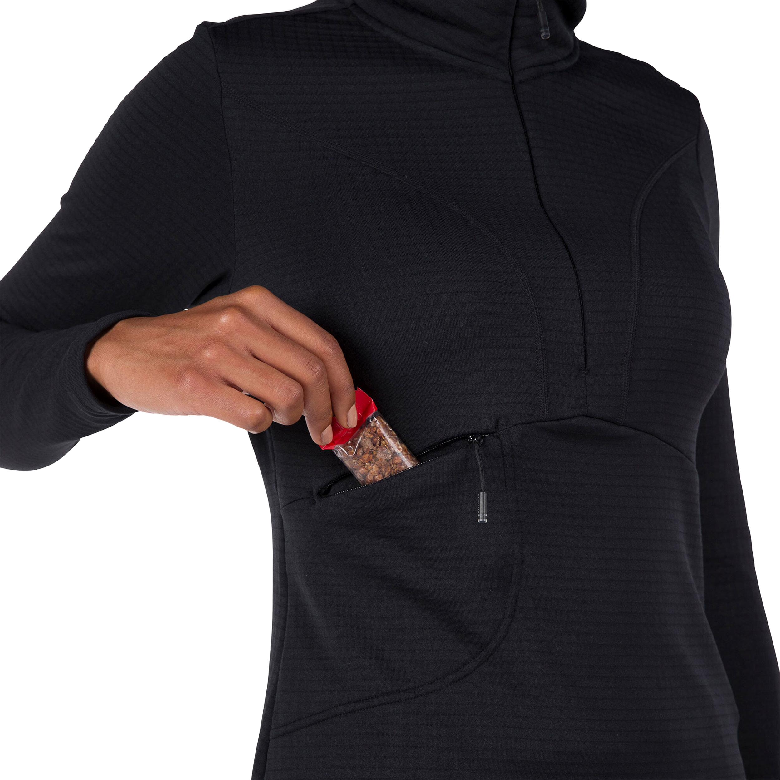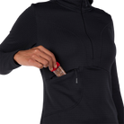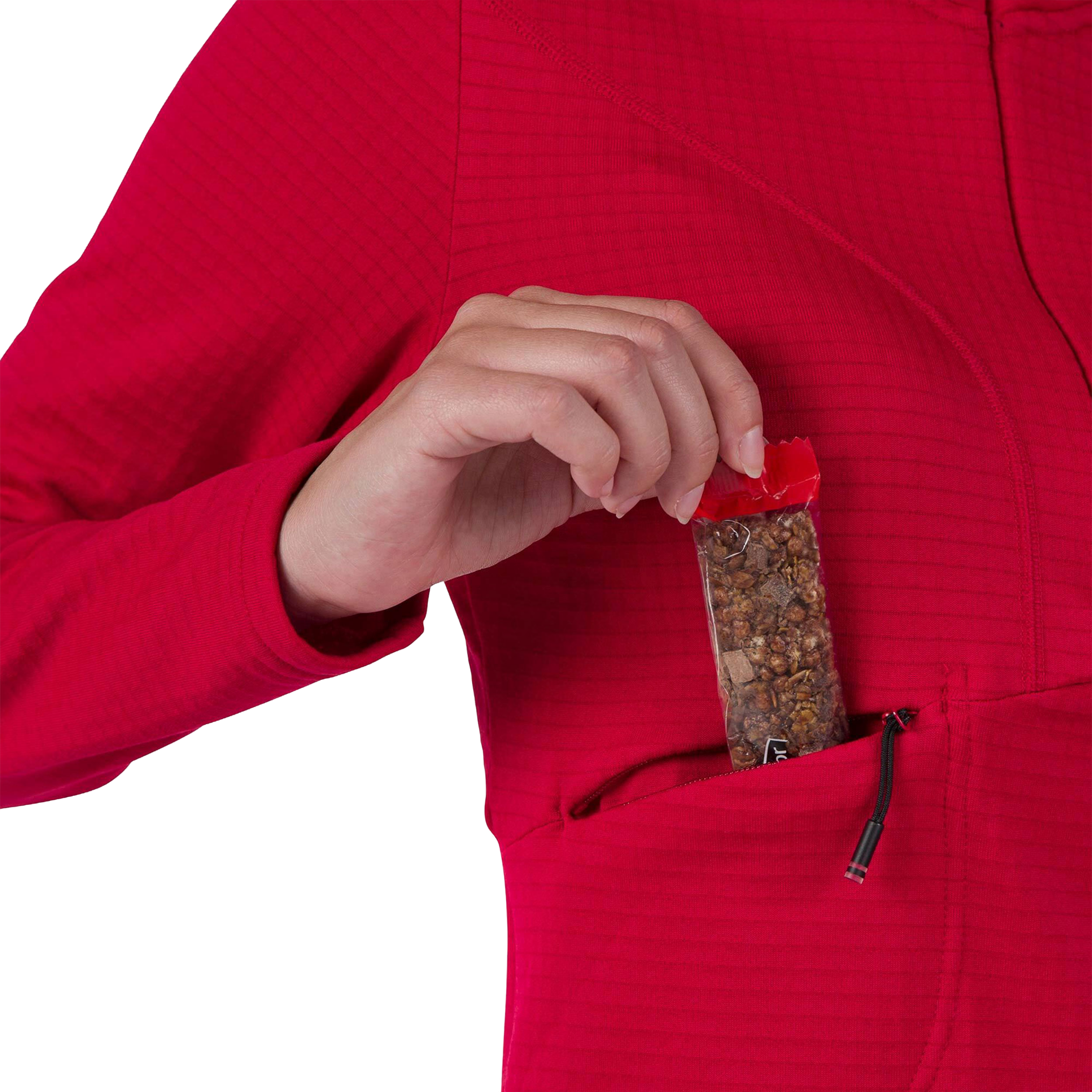This half-zip top is thoughtfully designed with a zippered hand pocket, providing a convenient and secure storage solution for essentials such as snack bars. Ideal for skiing, hiking, or other outdoor activities, this feature ensures quick access to energy-boosting items while keeping your hands free to focus on the adventure ahead.