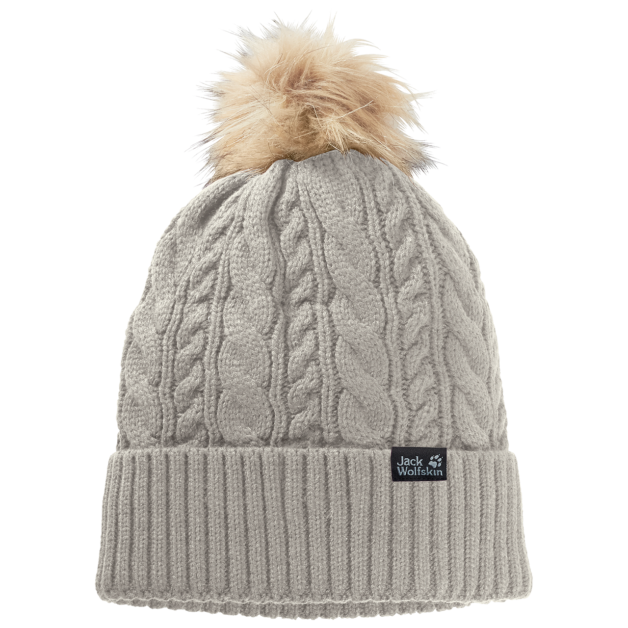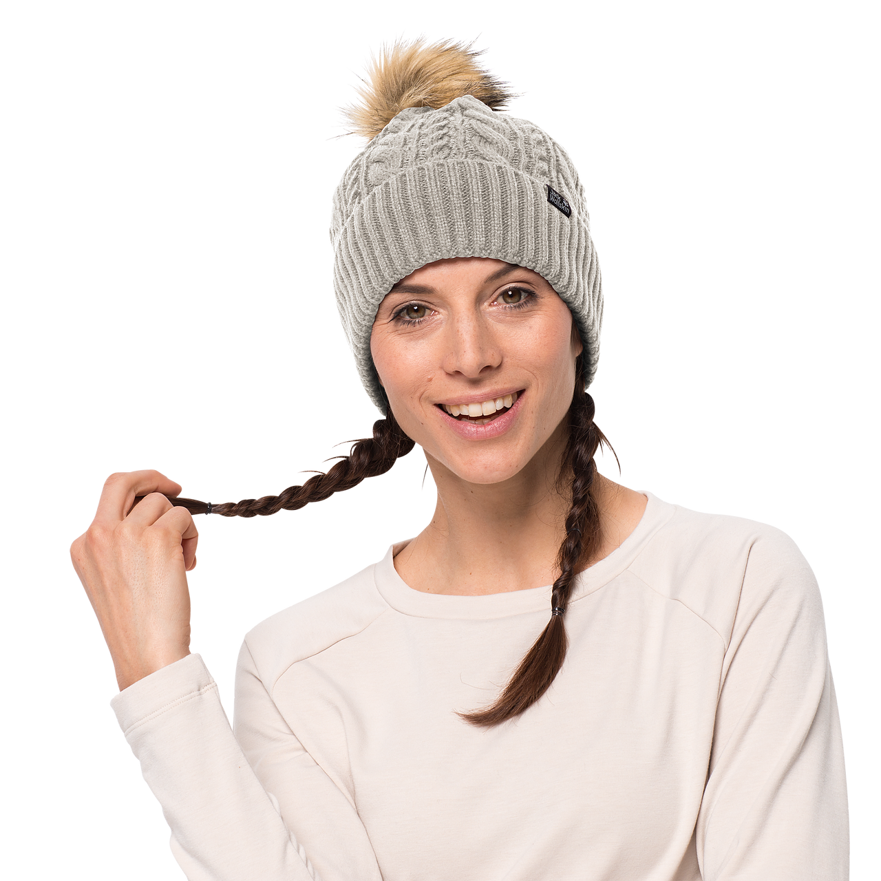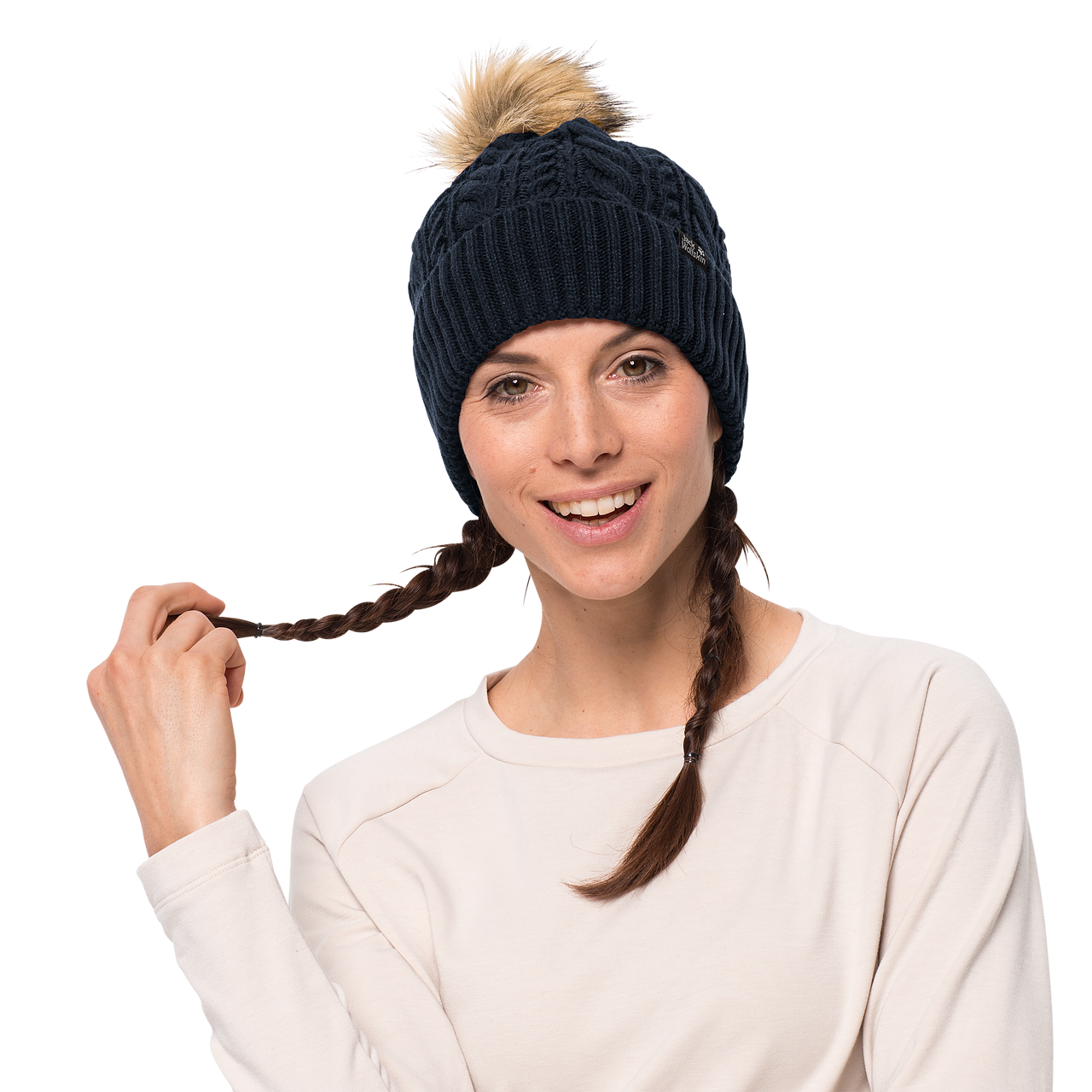 With its pretty knitted look and playful faux fur pom-pom, this stylish hat is a must-have accessory for the winter season.