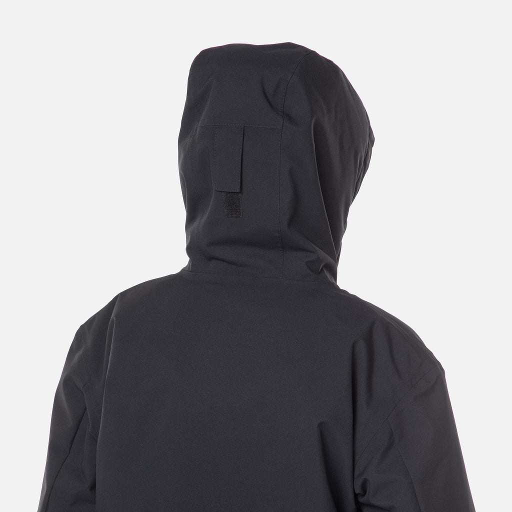 This ski jacket features an adjustable hem and a fixed hood that is fully compatible with ski helmets, allowing for seamless integration and added protection on the slopes. The hood is designed to comfortably accommodate a helmet without compromising coverage, ensuring warmth and shielding from the elements. This thoughtful feature enhances the jacket’s practicality, making it an ideal choice for skiers who prioritize both safety and convenience in their winter outerwear.