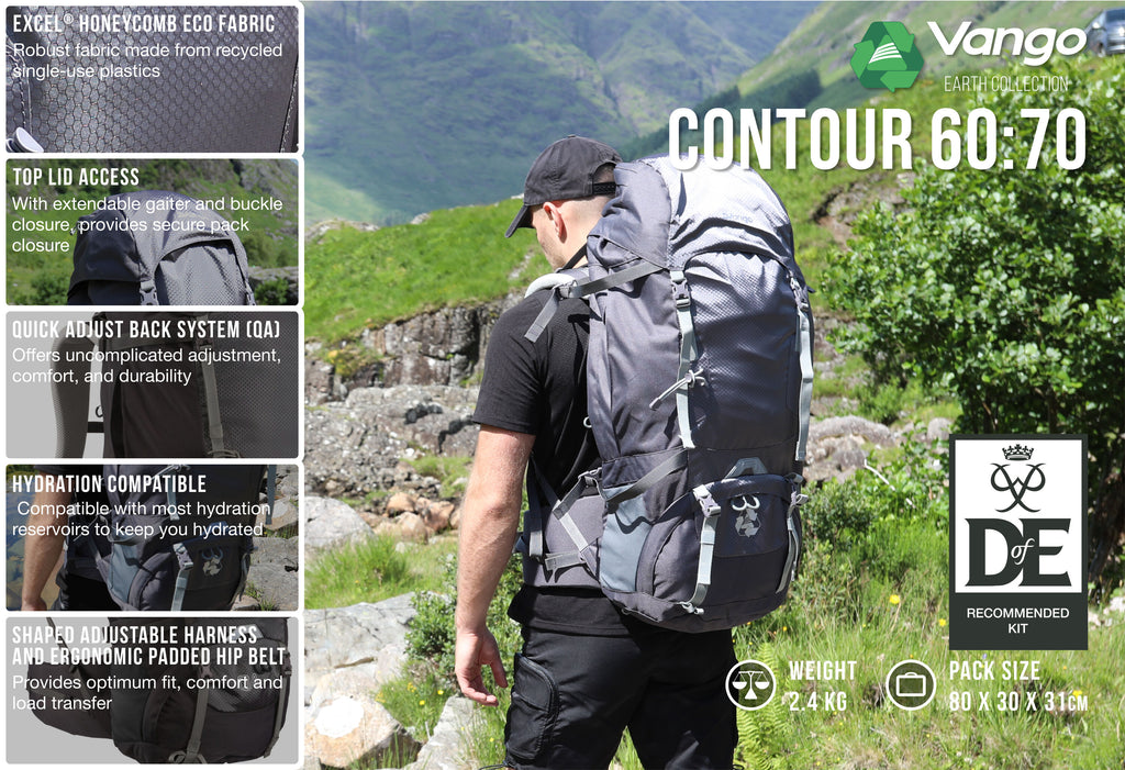 The Vango Contour 60:70L rucksack is designed for backpackers and explorers on multi-night expeditions, the rucksack offers exceptional performance and fit. Recommended by The Duke of Edinburgh's Award due to its brilliantly designed Quick Adjust back system, this rucksack allows the user to customise for a perfect fit. The Contour joins Vango's Earth Collection for 2023.