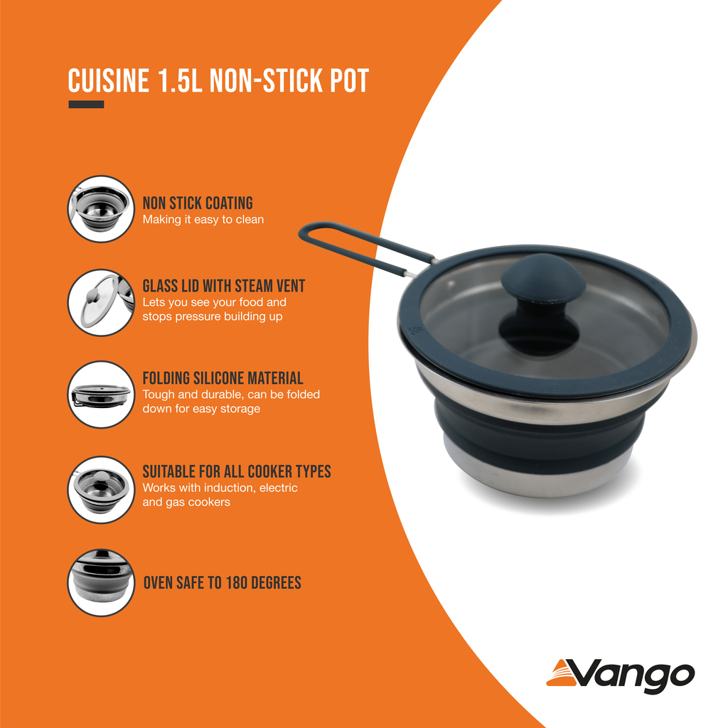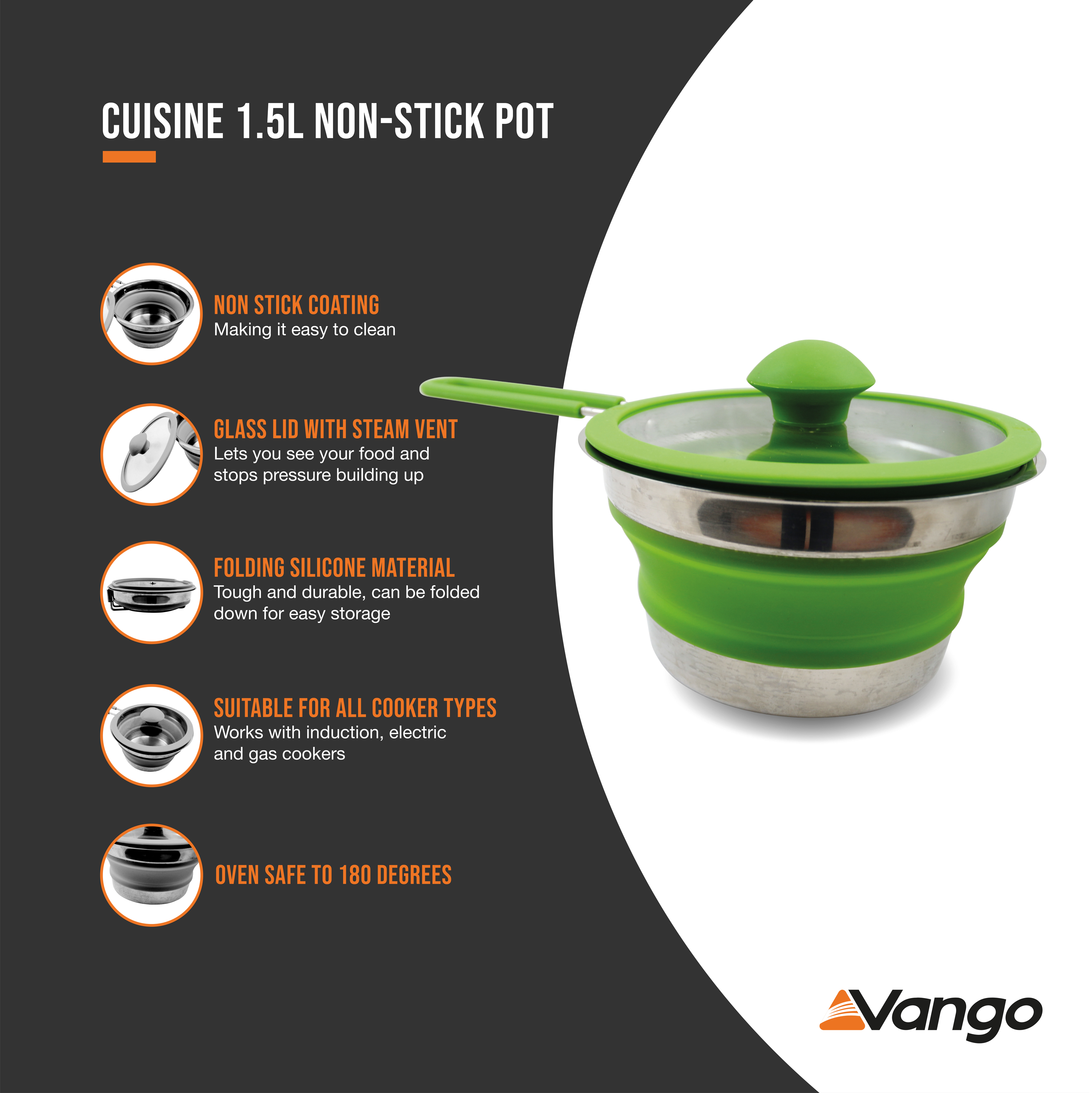 The space saving Vango Cuisine Casserole 1.5L allows you to cook the finest of dishes when travelling or camping. Made from silicone, it is durable, non-stick, easy to clean and foldable, making it very easy to store and transport. Able to work on induction, electric and gas cookers.