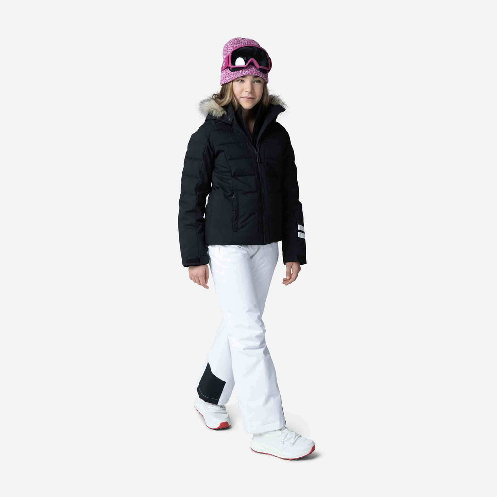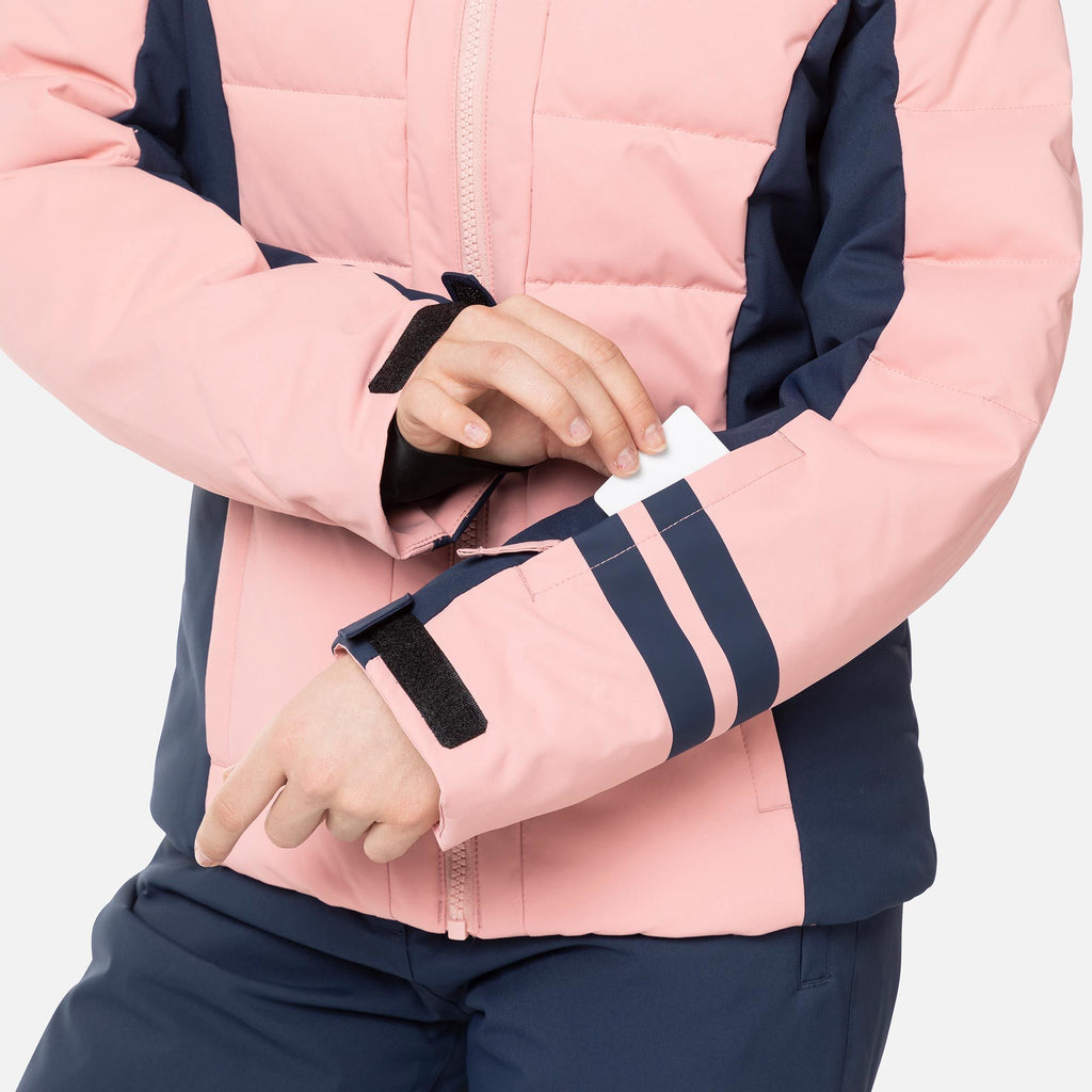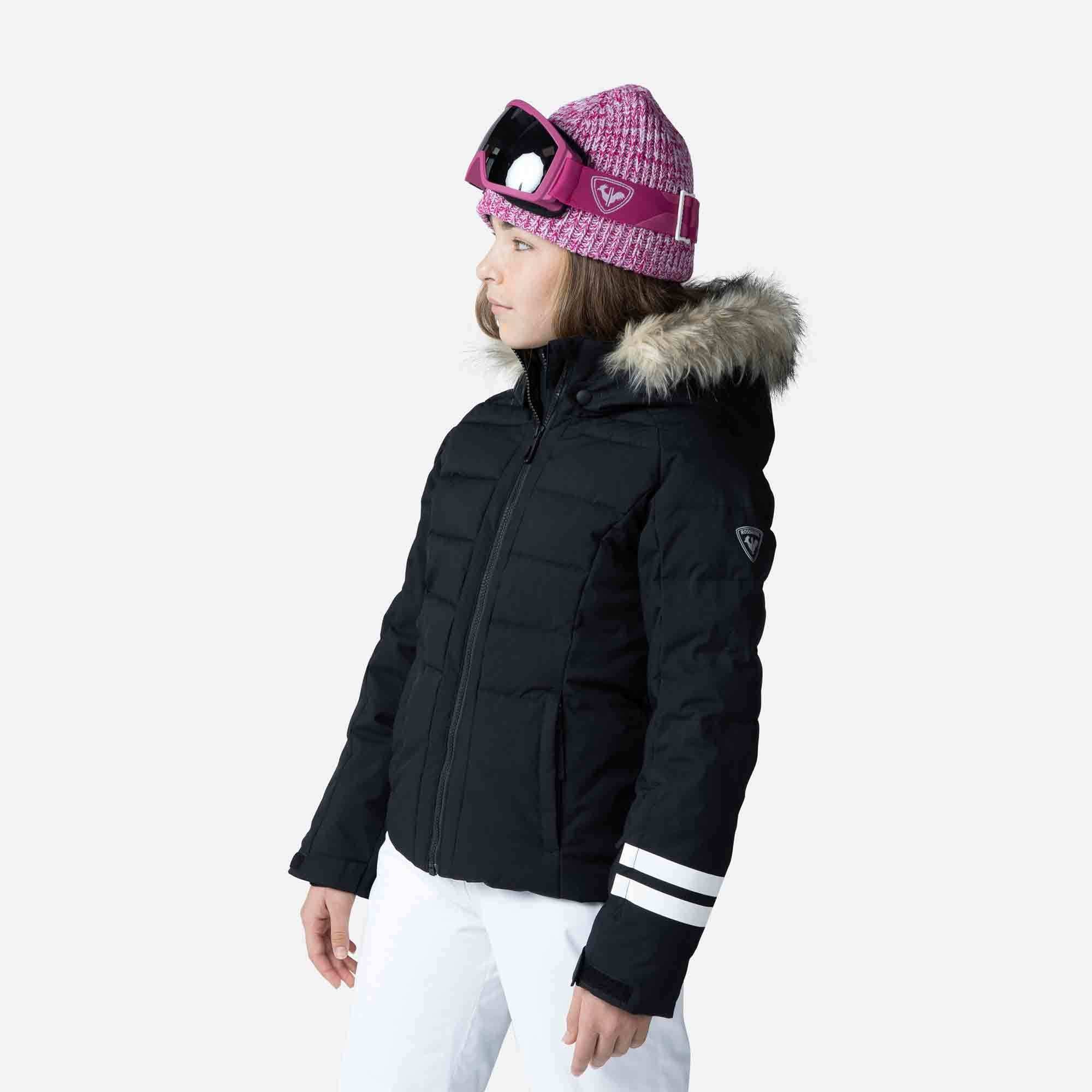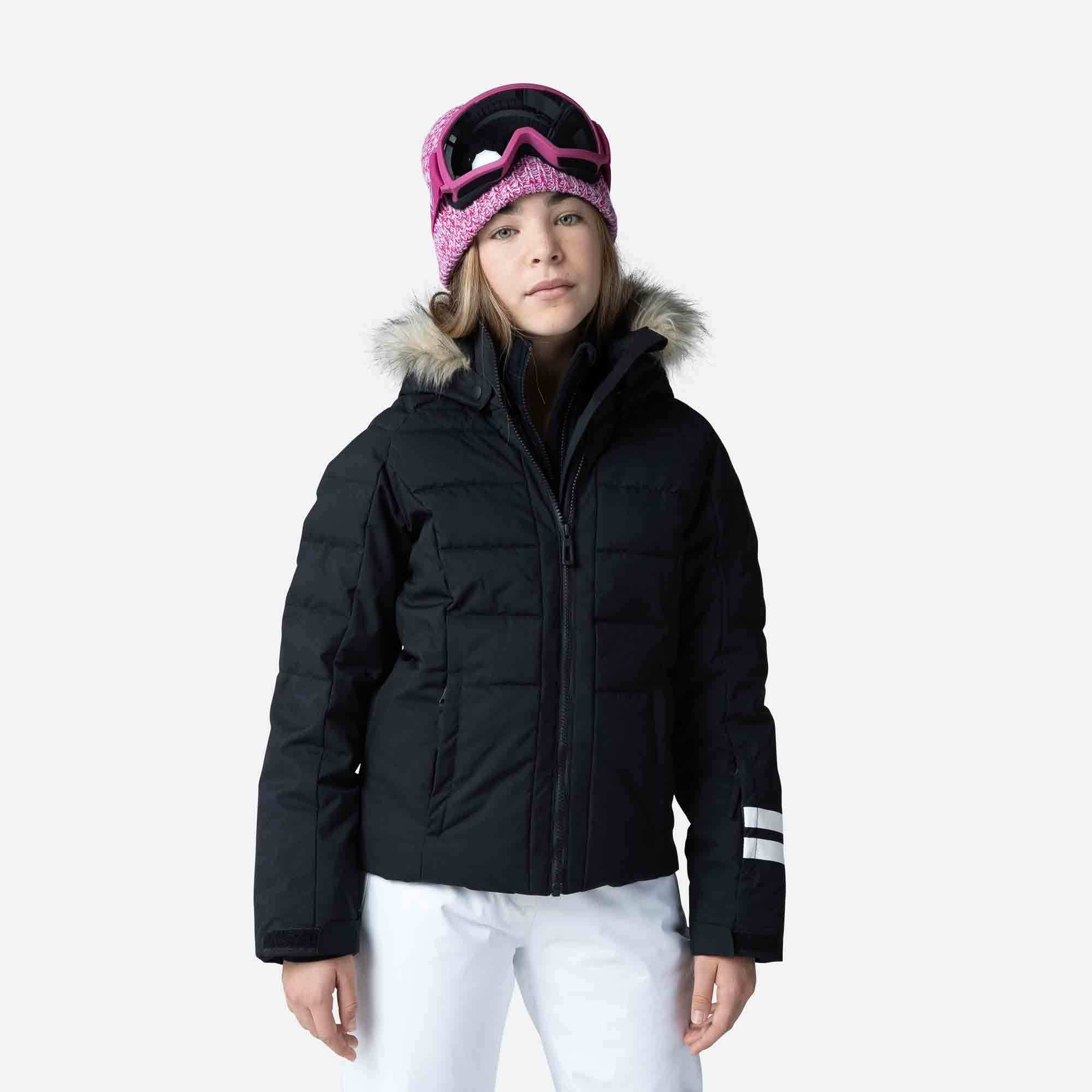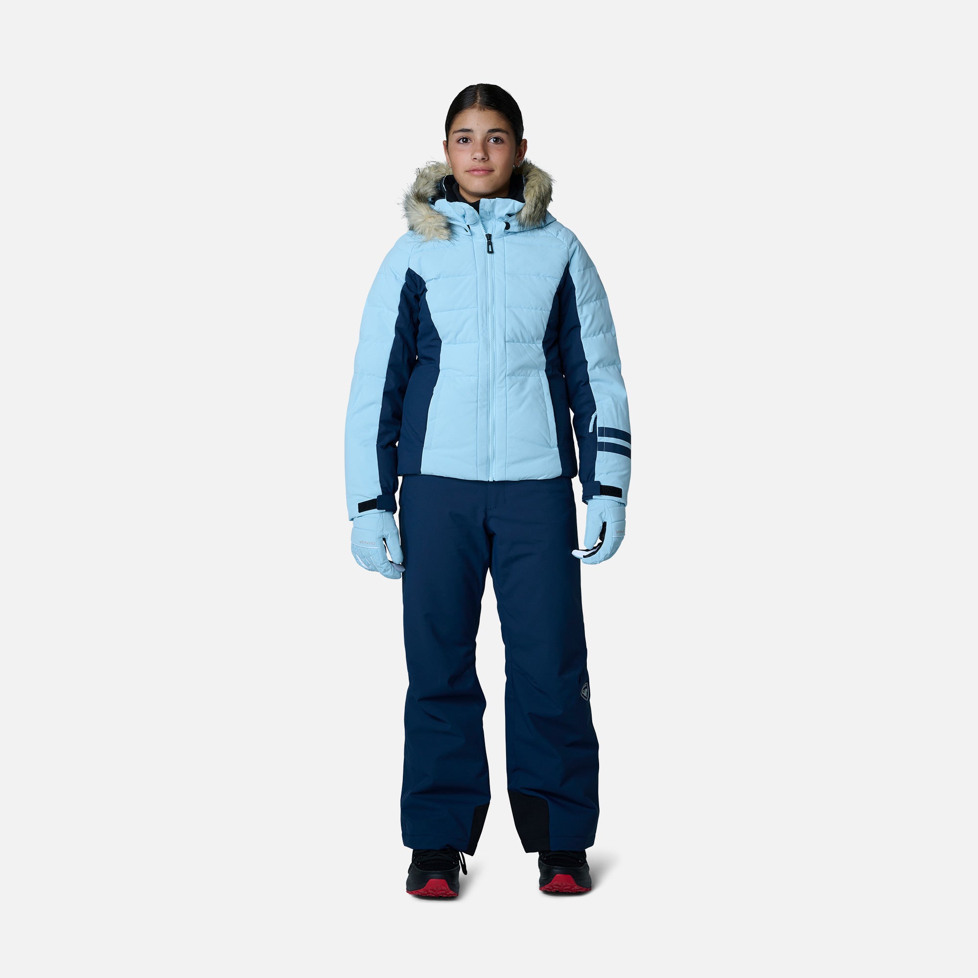 Warm kids have more fun on the mountain. The girls' Rossignol Polydown Ski Jacket features high-loft synthetic insulation in the body for down-like warmth and easy care. A waterproof, breathable membrane seals out stormy conditions to keep her dry, while ski-day details like adjustable stretch cuffs and a built-in snow skirt keep out cold and snow. A removable hood lets her choose her style.
