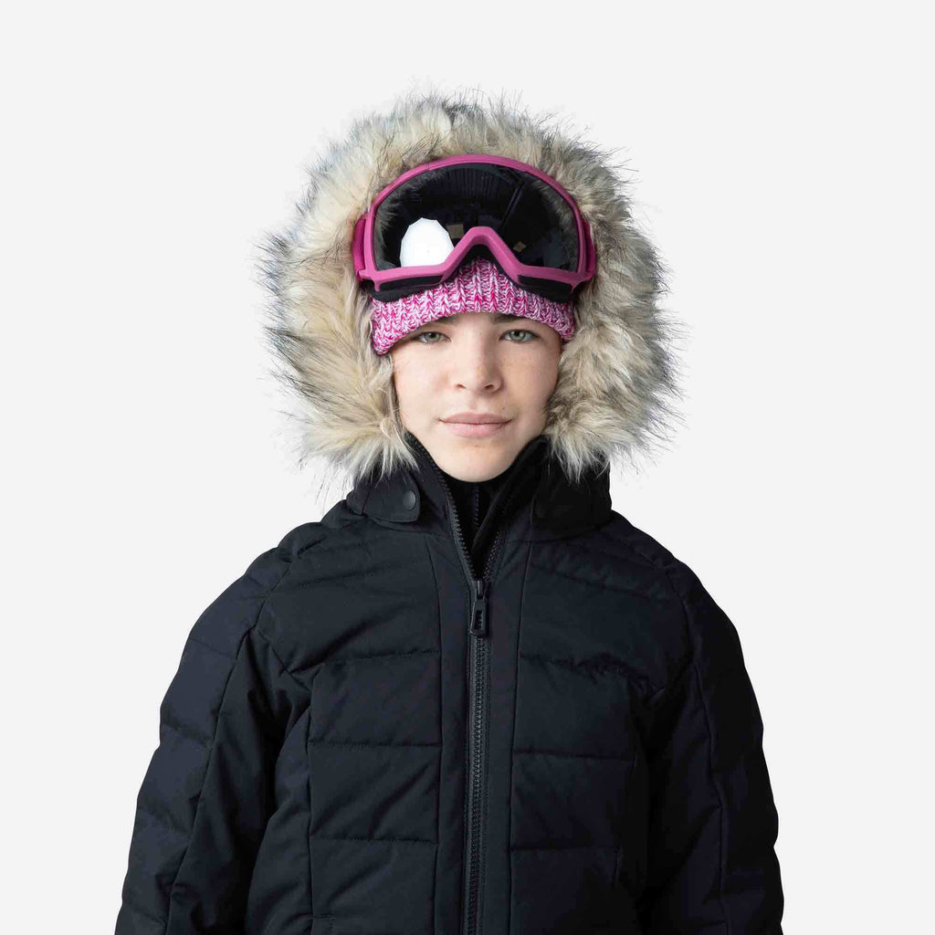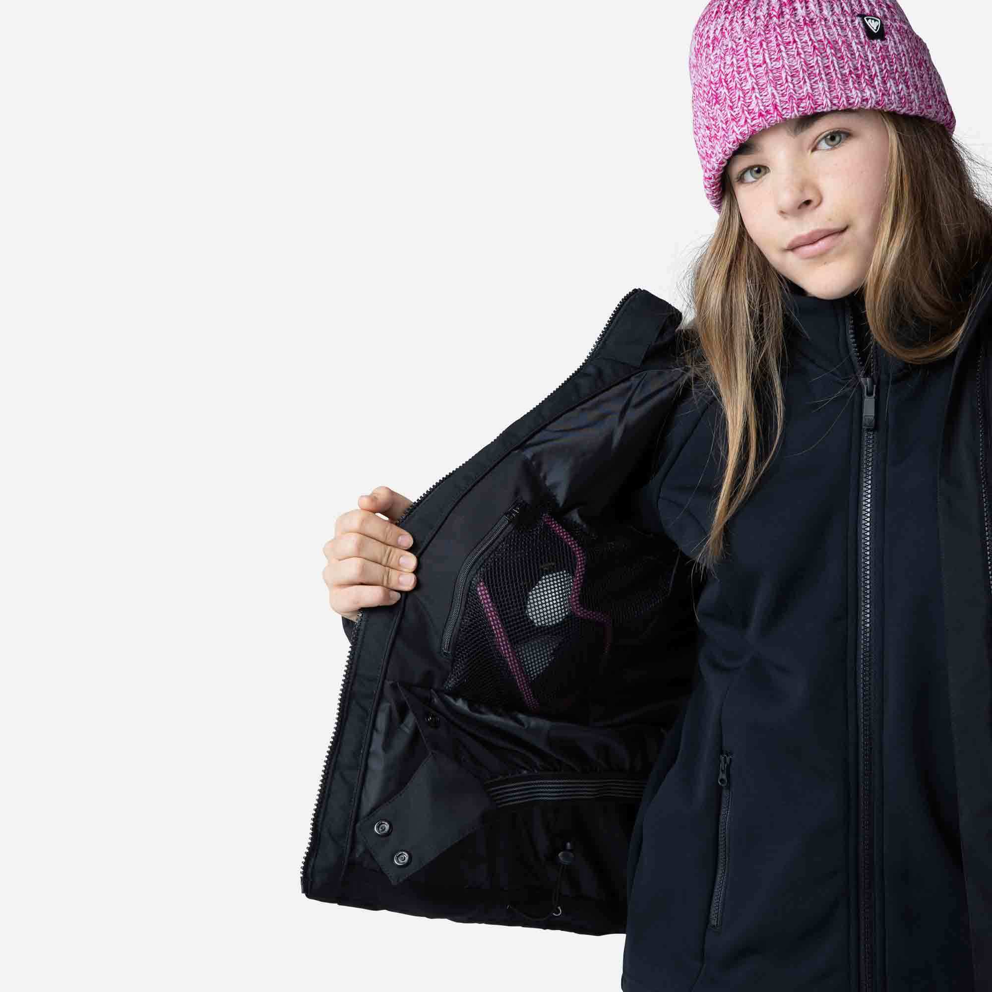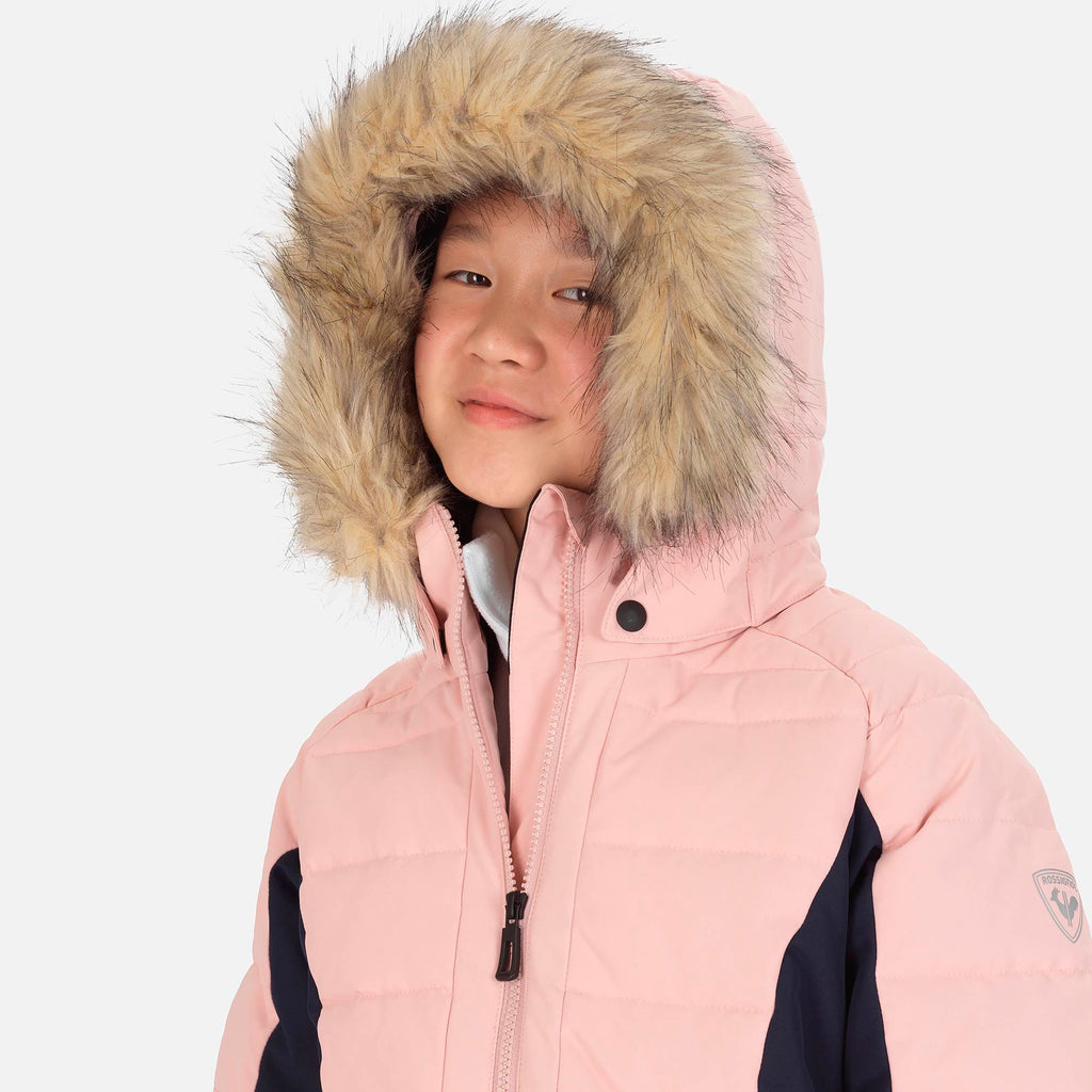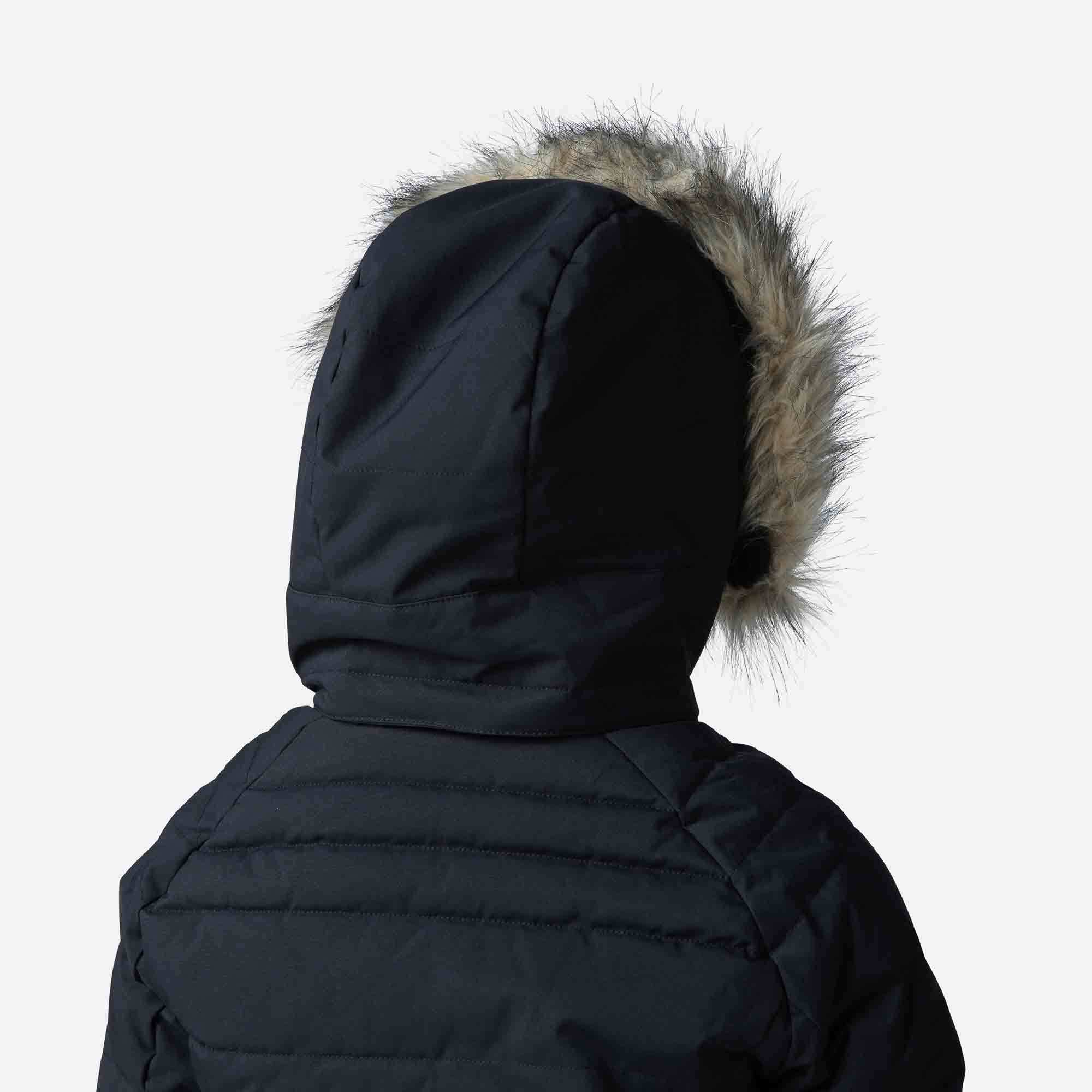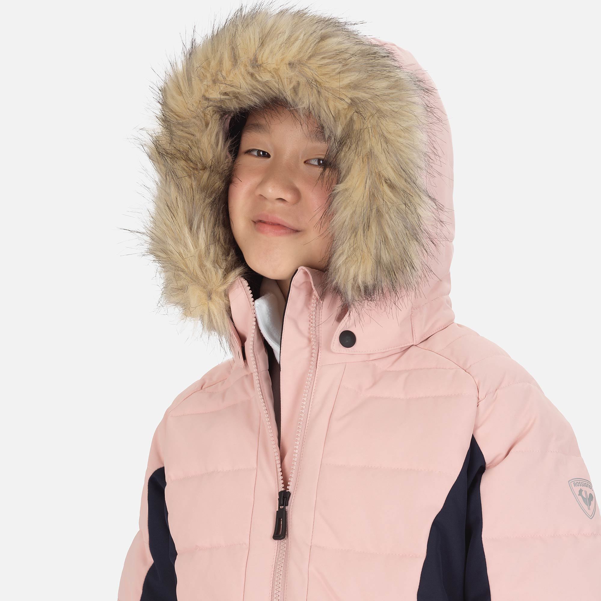 Warm kids have more fun on the mountain. The girls' Rossignol Polydown Ski Jacket features high-loft synthetic insulation in the body for down-like warmth and easy care. A waterproof, breathable membrane seals out stormy conditions to keep her dry, while ski-day details like adjustable stretch cuffs and a built-in snow skirt keep out cold and snow. A removable hood lets her choose her style.