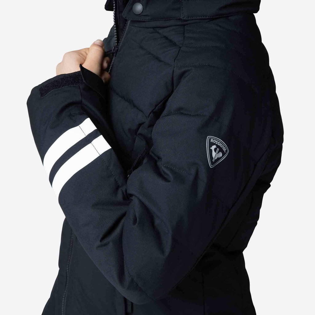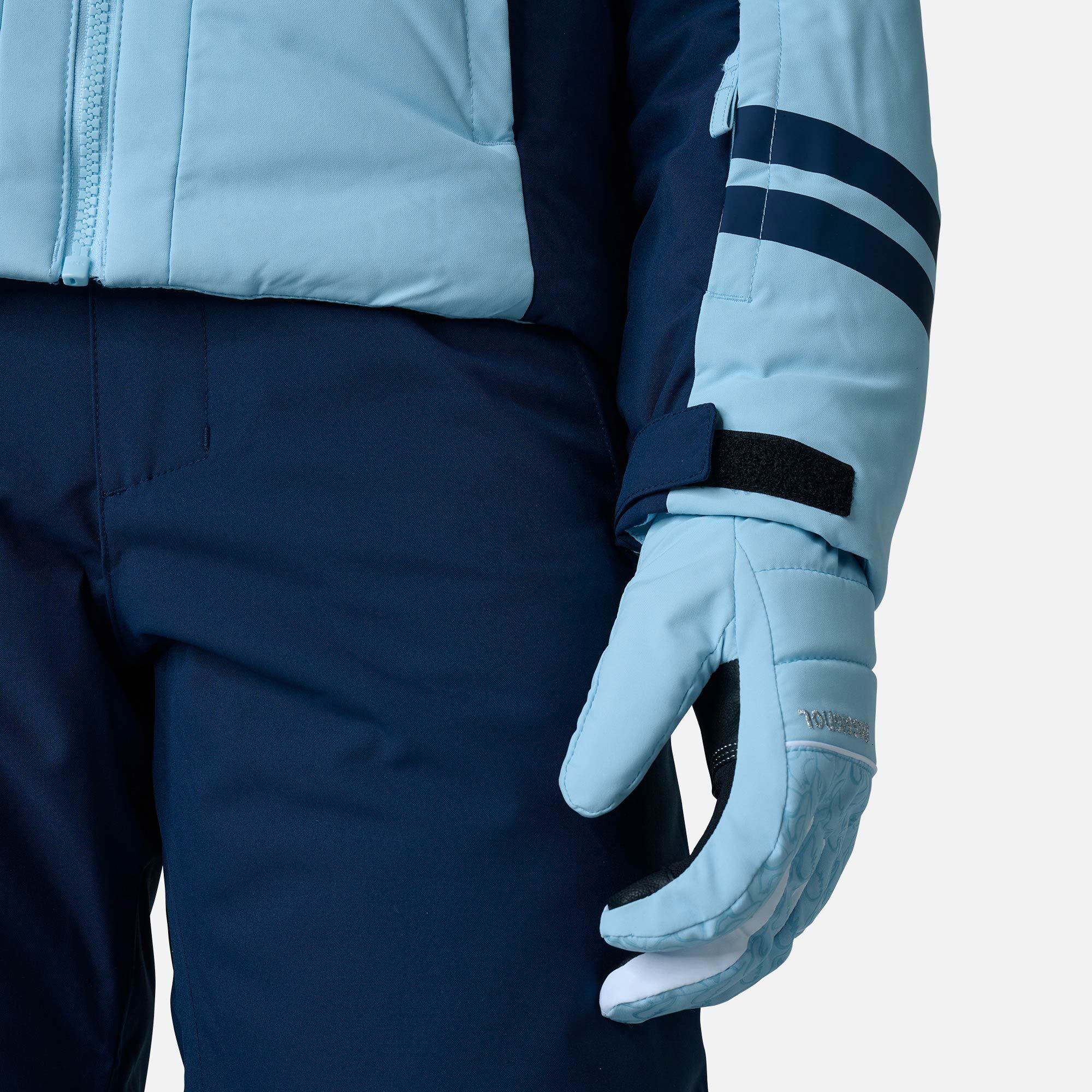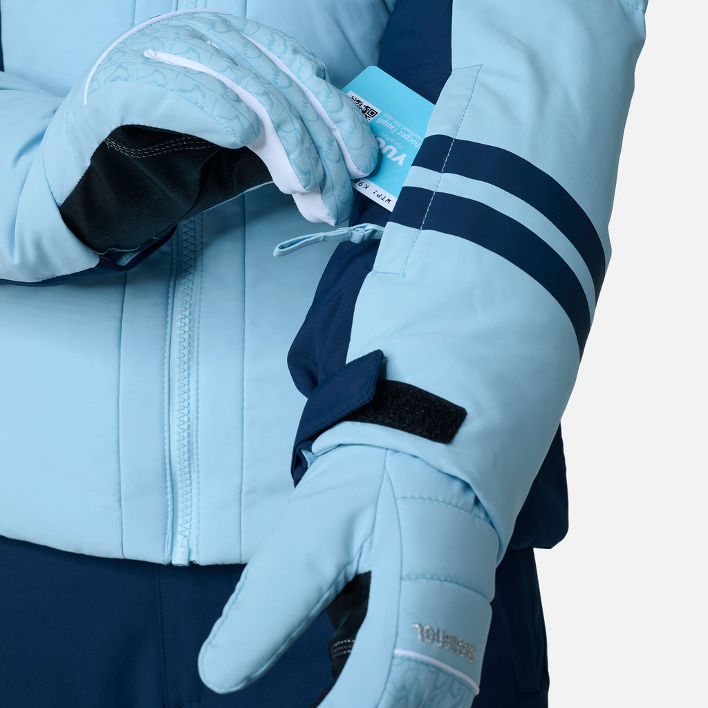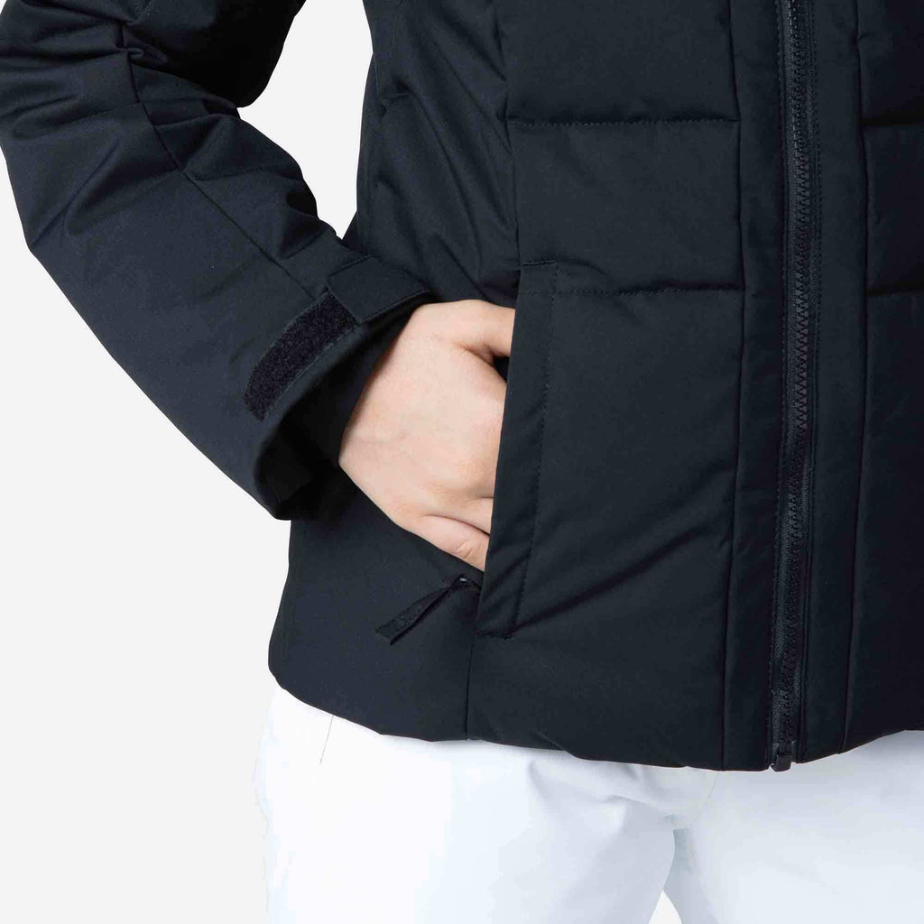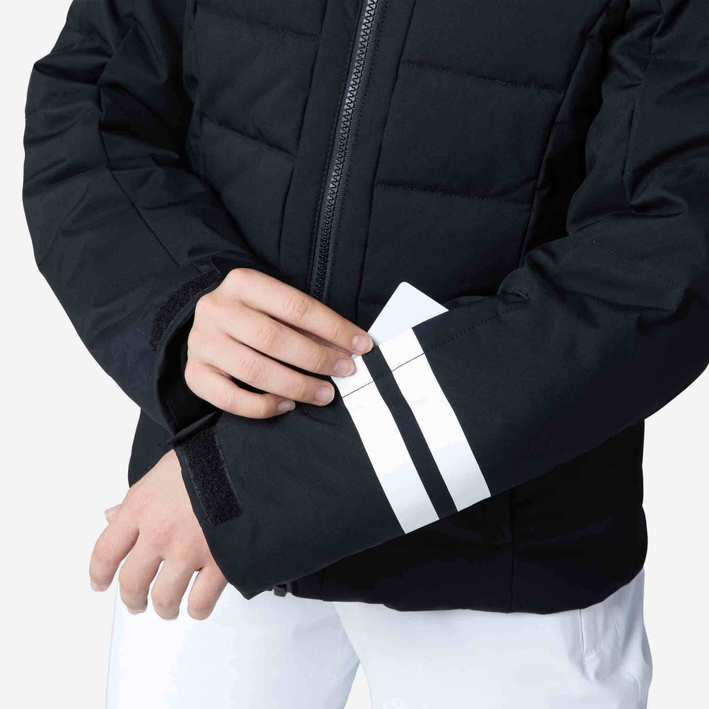 Warm kids have more fun on the mountain. The girls' Rossignol Polydown Ski Jacket features high-loft synthetic insulation in the body for down-like warmth and easy care. A waterproof, breathable membrane seals out stormy conditions to keep her dry, while ski-day details like adjustable stretch cuffs and a built-in snow skirt keep out cold and snow. A removable hood lets her choose her style.