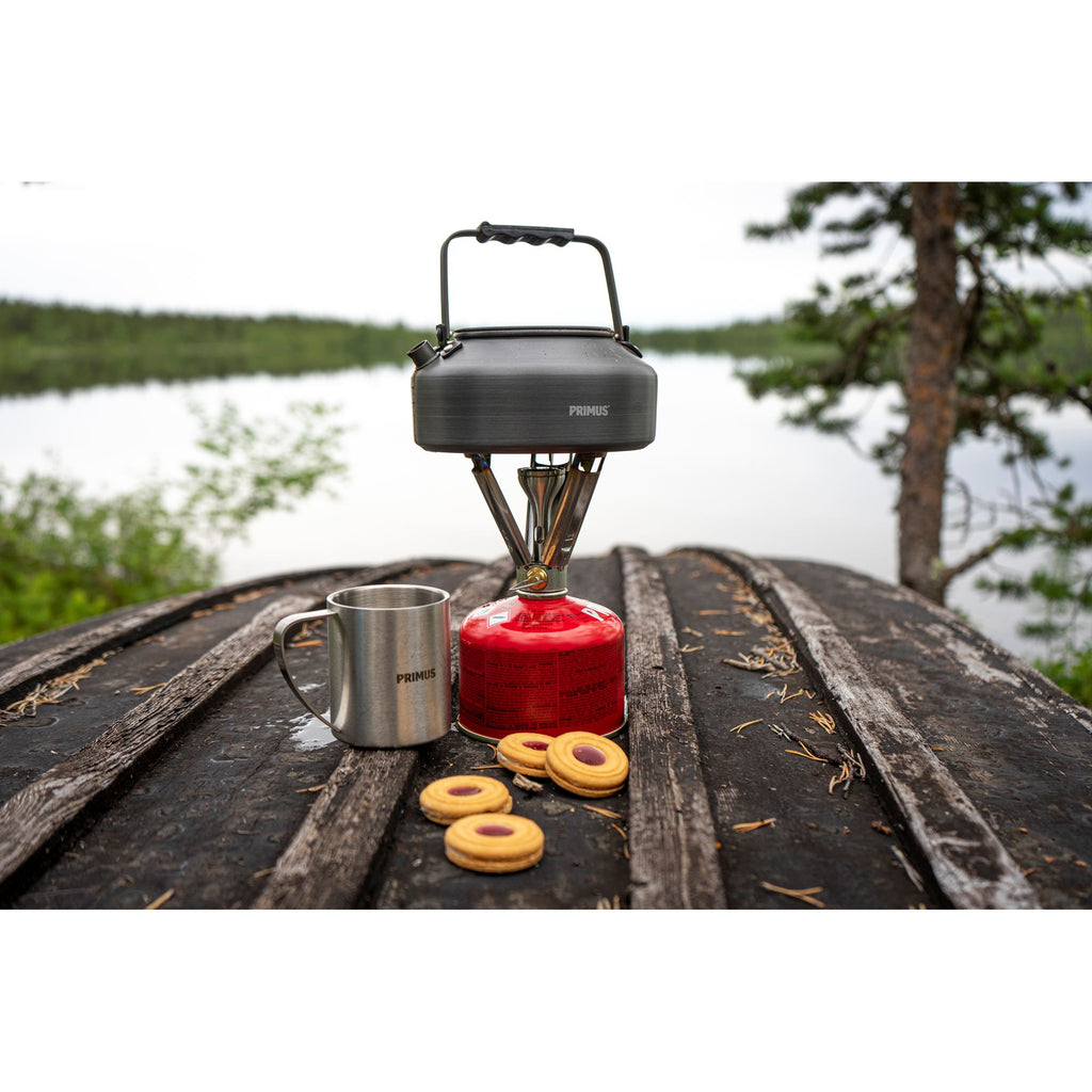 This lightweight coffee/tea kettle made of hard-anodized aluminium is a lovely attribute when camping. Folding handle. Comes in a practical net stuff sack.