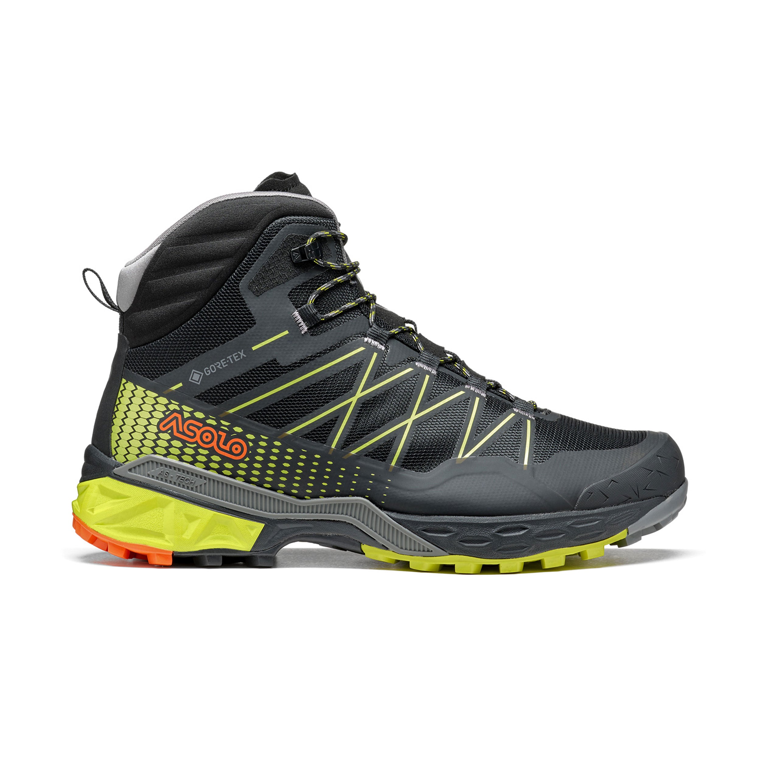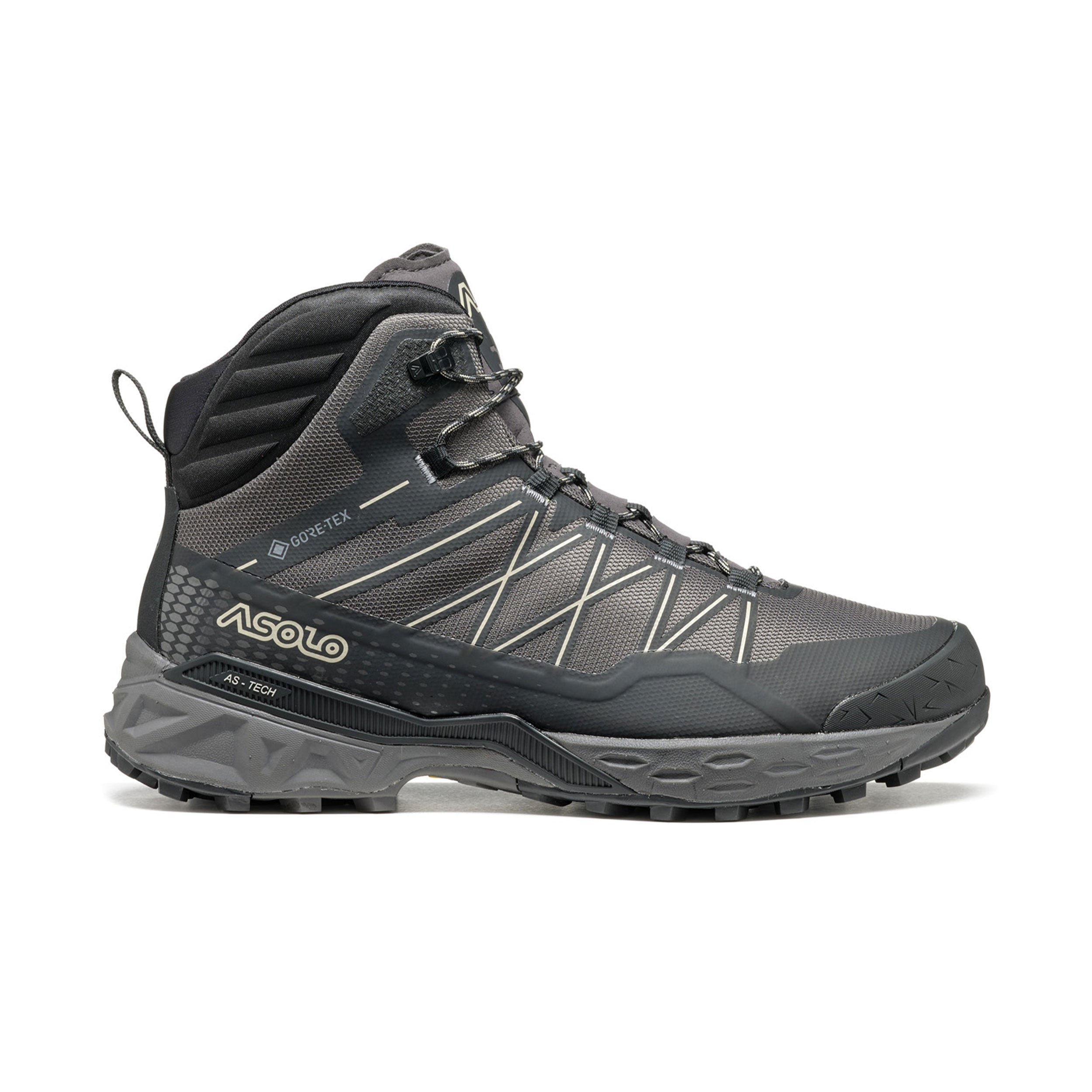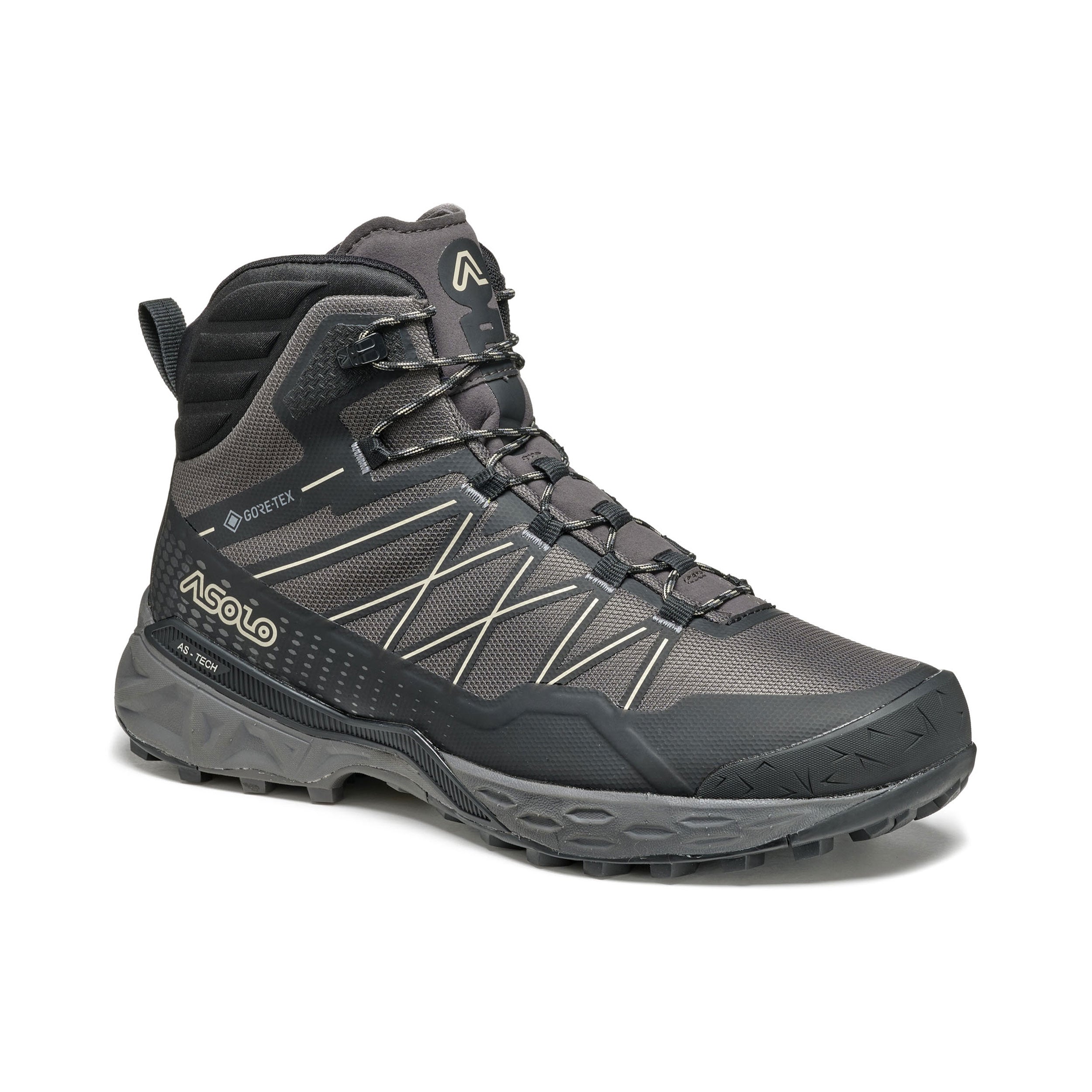 Mid-cut Tahoe Gtx in polyester upper reinforced with Tpu material offers protection and comfort while the Gore-Tex Extended Comfort Footwear lining guarantees waterproofness and breathability. The mono-density Eva midsole assures the stability, support, comfort and cushioning. The AS-Tech technology is designed and incorporated to give structure and torsion stability. The Asolo Cross outsole has a self cleaning design and assures the best traction and grip, thanks to the Sigma Grip compound, developed by Asolo. To complete the model a Tpu cap for an additional protection, the thermo-shaped tongue to guarantee the best fit and the webbing lacing system to assure a precise and fast lace up.