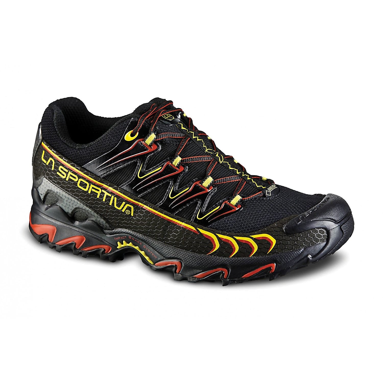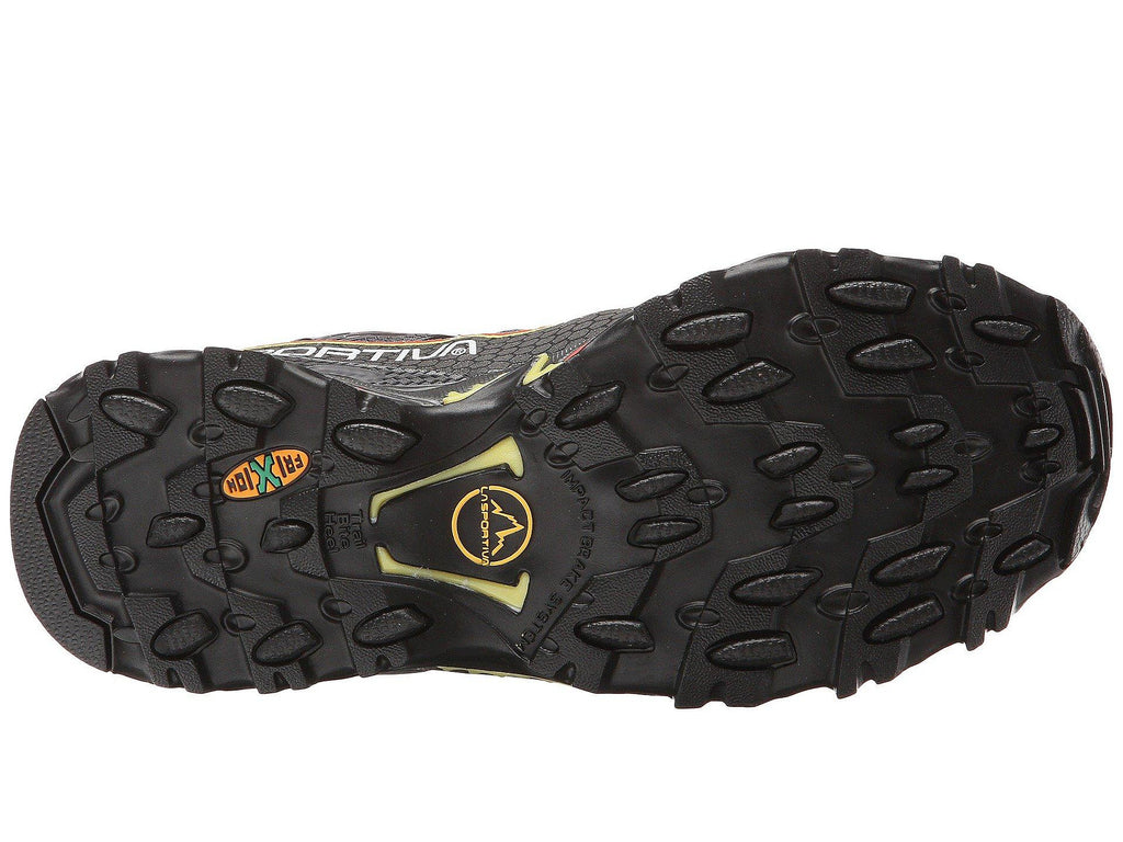A GORE-TEX® model created for winter use off-road and over long distances, for ultra marathon competitions and endurance training sessions. The uppers are made from abrasion resistant, breathable, water repellent mesh and the lining uses the GORE-TEX® Extended Comfort membrane to guarantee water resistance and breathability. The integrated lacing system uses a webbing stitched to the inner stretch fabric while the high frequency reinforcements remain on the external mesh fabric: this allows for an optimal distribution of foot tension and keeps the foot in check without compromising overall comfort. Ultra Raptor GTX brings together the advantages, in terms of performance, of a snug fit construction, to the superior comfort levels of wide fit models. The result is a product that can be worn for many consecutive hours and for endurance on any type of off road terrain both in the winter or in conditions of extreme humidity, thanks to the GORE-TEX® water proof lining. La Sportiva FriXion XF Super sticky sole.