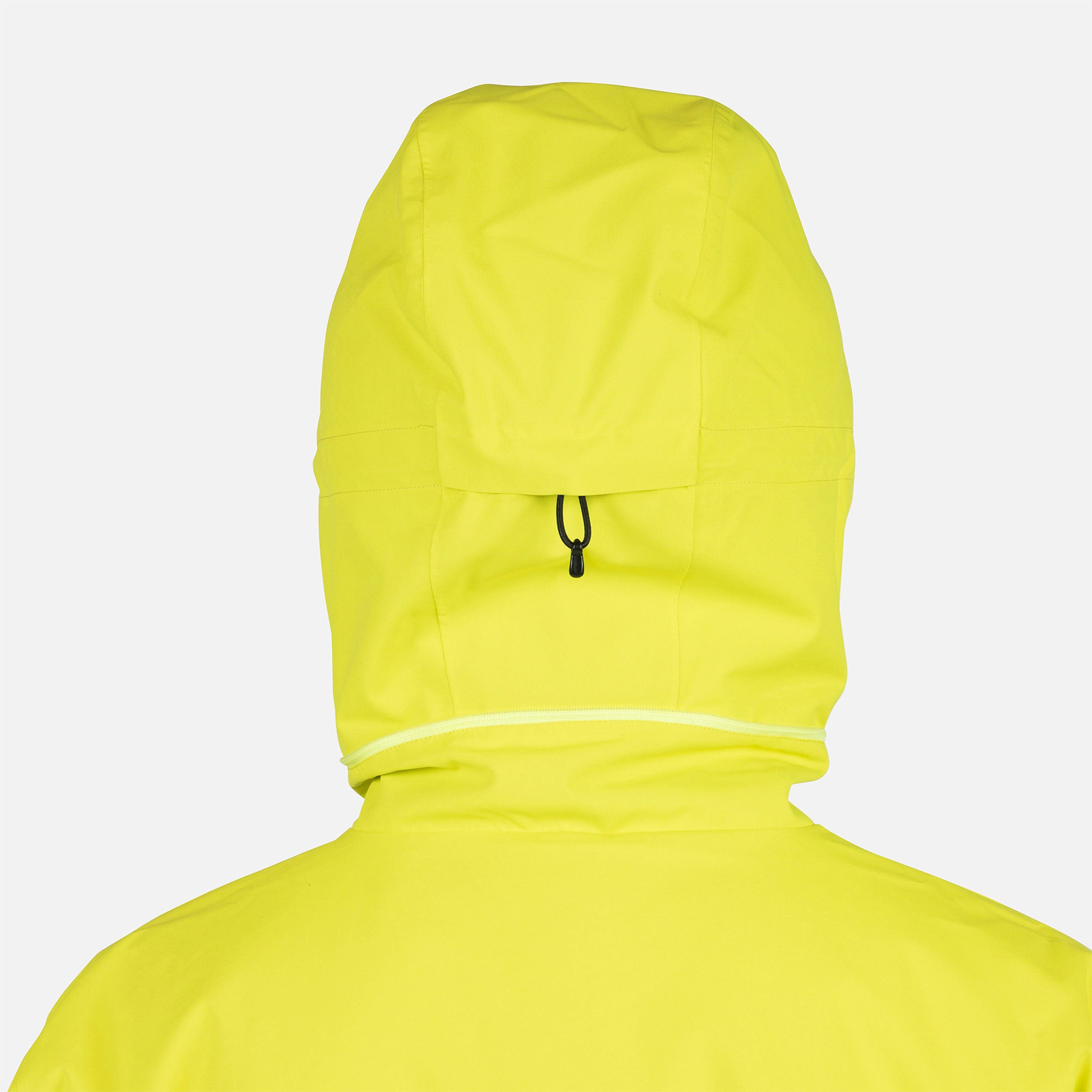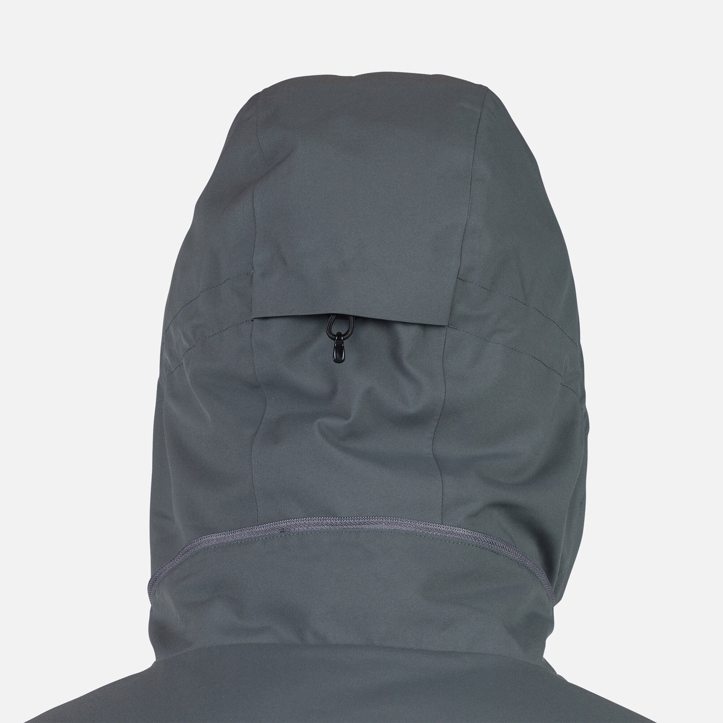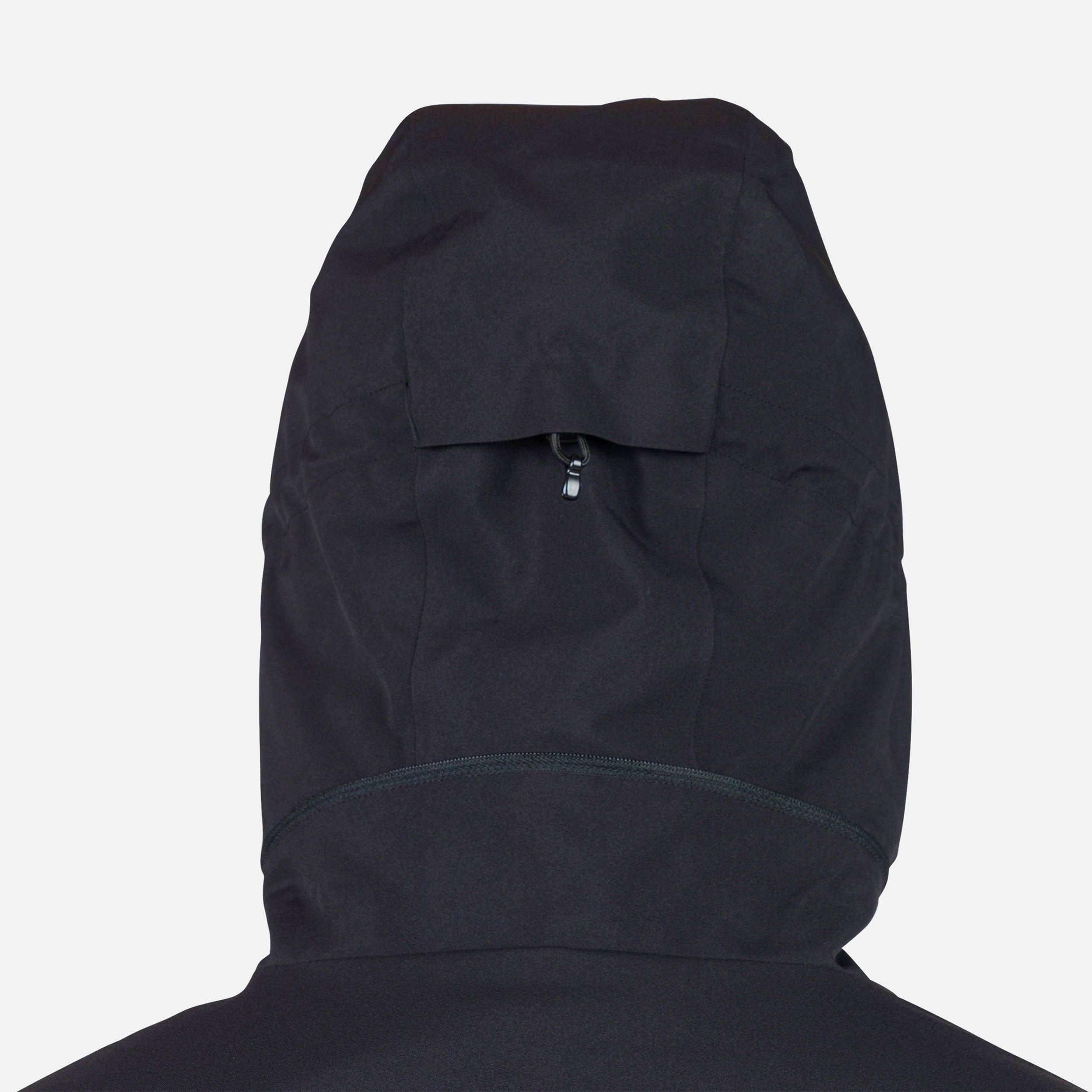 This ski outerwear piece features an adjustable fixed hood that can be customized from the hem and sides for a secure, comfortable fit, ensuring optimal protection against wind and snow. Its versatile design accommodates helmets or additional layers, meeting the needs of skiers who value both functionality and adaptability. For added convenience, the hood can be discreetly hidden within the collar when not in use.