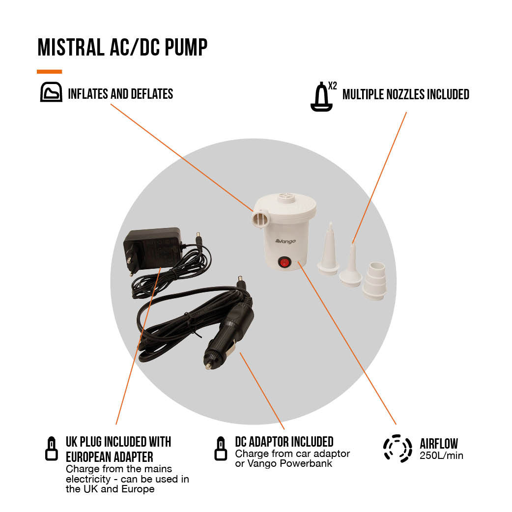 The Mistral AC/DC Pump makes inflating and deflating your air mattress or inflatable campsite furniture a breeze with a powerful airflow of 250L/minute. Including multiple nozzle options, the Mistral is powered via UK/EU plug, DC car socket or power bank, so setting up camp is simple, wherever you go.