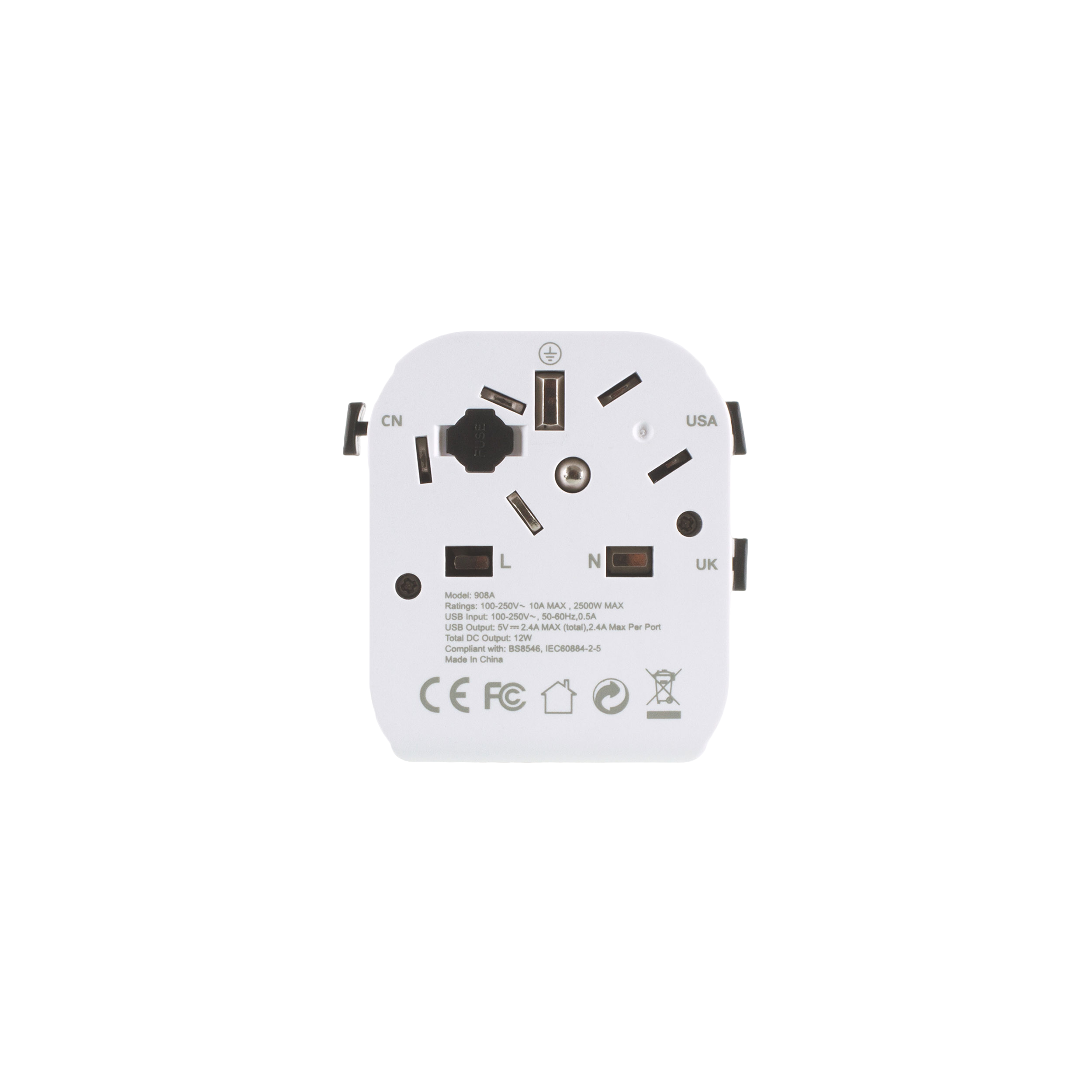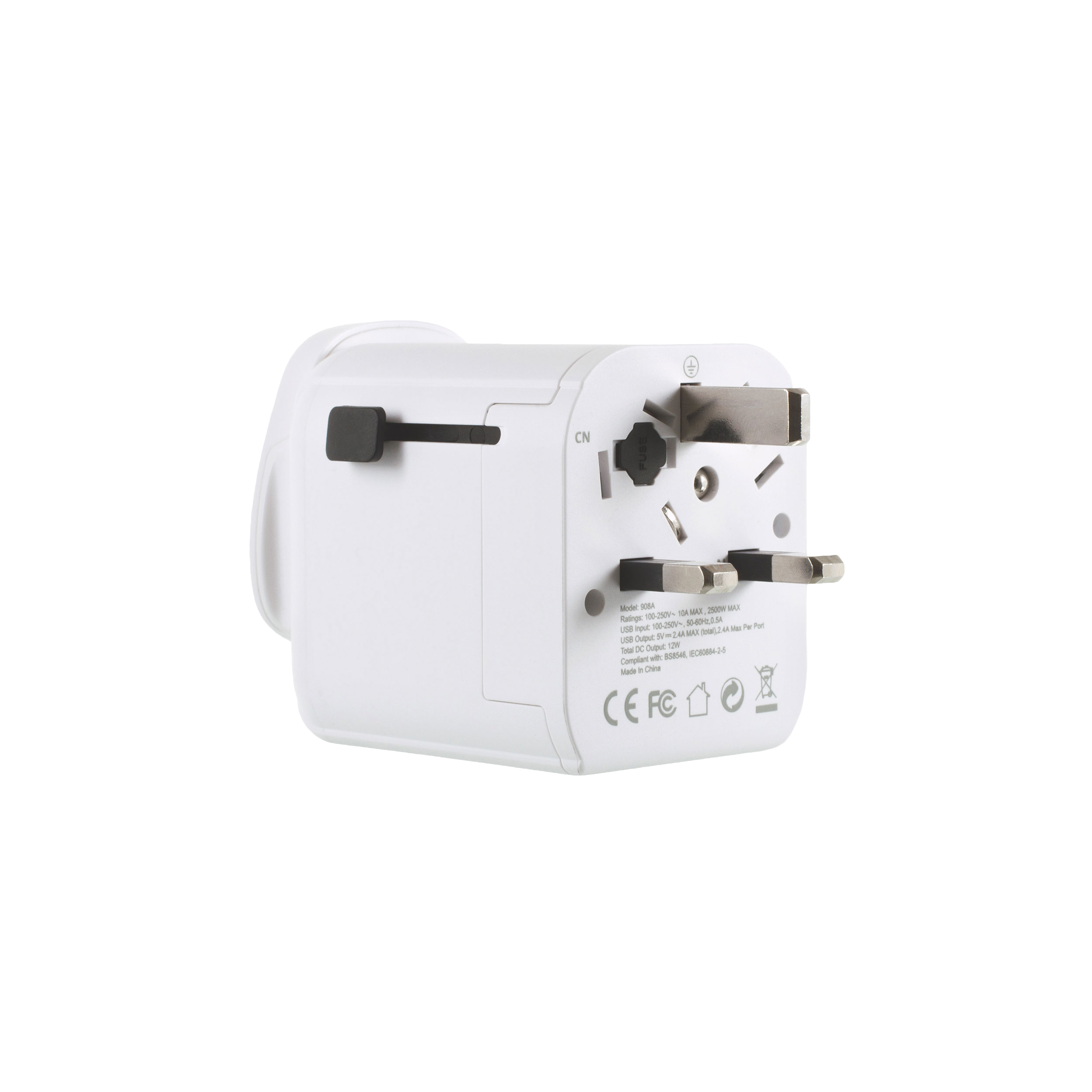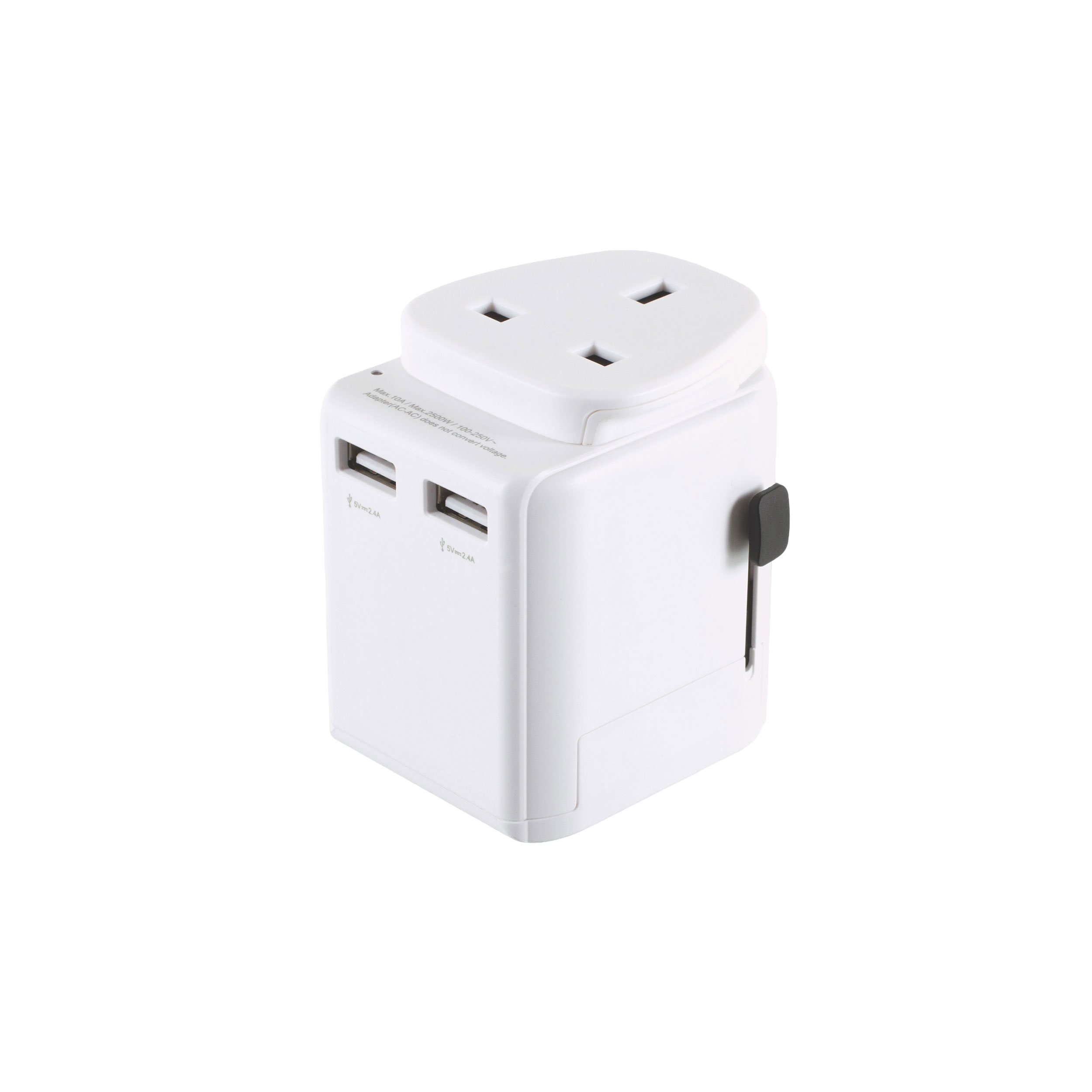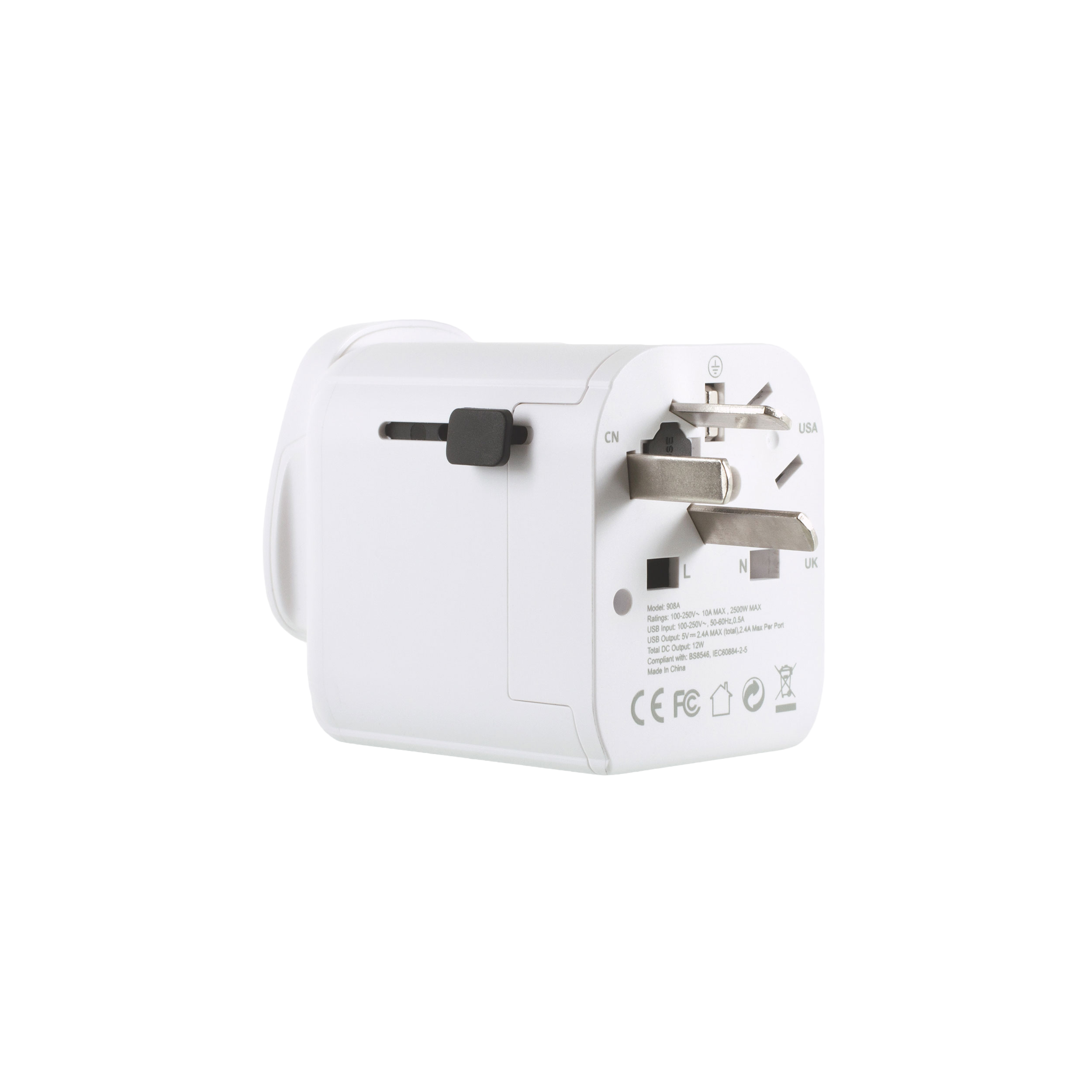 This USB UK World Travel Adapter is suitable for use with 3 pole earthed plugs to enable travellers to use their devices in over 200 countries worldwide and for multiple charging of devices. Using the adapter is easy and the 3 sliding plug faces alternate between US, British and Australian/Chinese configurations by simply pressing the button on the side. Slide out the configuration you need and it’s ready to use. You can covert to EU sockets, or use EU plugs, by taking the front section off.