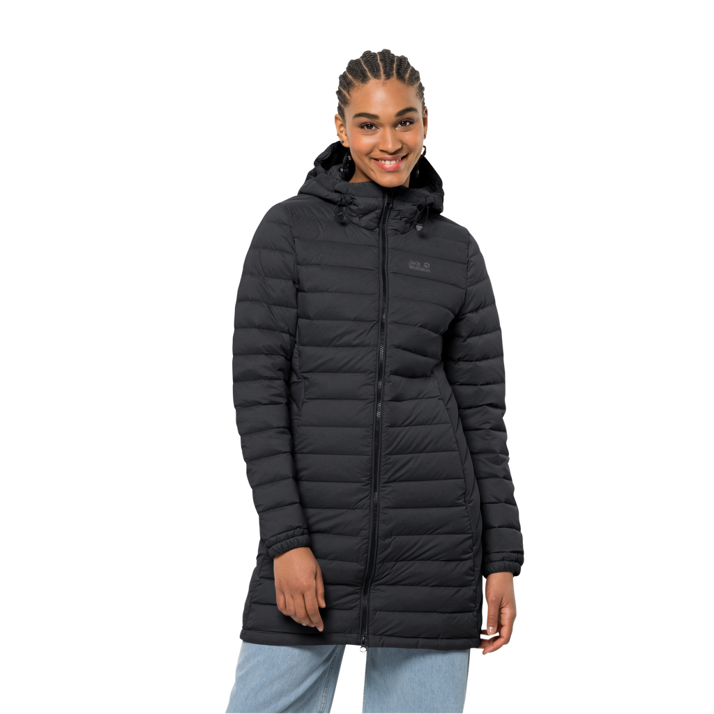 The coat features an adjustable hood and a high collar for additional warmth in the head and neck area.