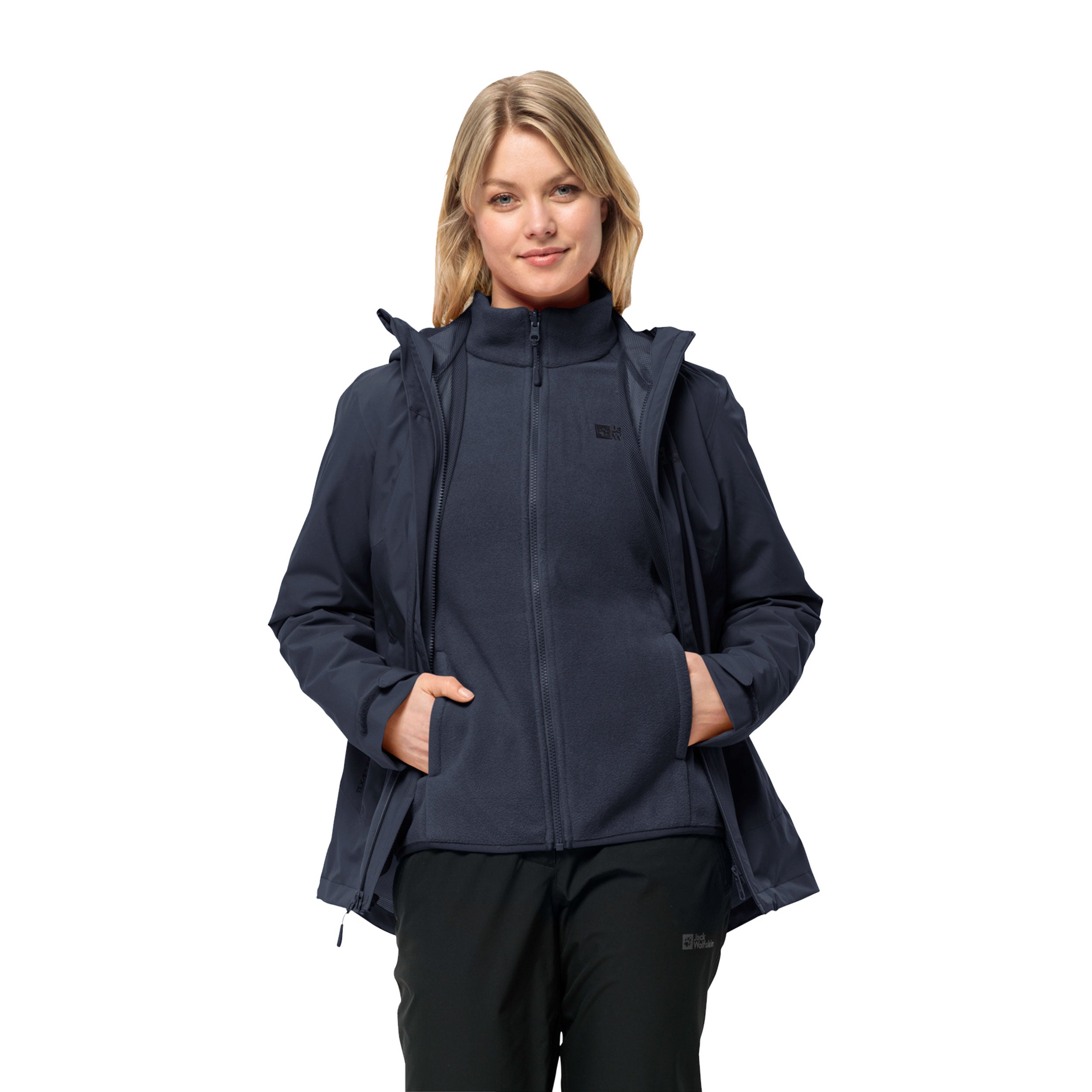 The premium Polartec® 200 g fleece inner jacket combines softness and warmth with a fully lined sleeve design for enhanced comfort and versatility. Crafted primarily from recycled materials, it can be worn independently or seamlessly integrated into a compatible Jack Wolfskin outer shell through the 3-in-1 system, offering adaptable protection across various outdoor conditions.