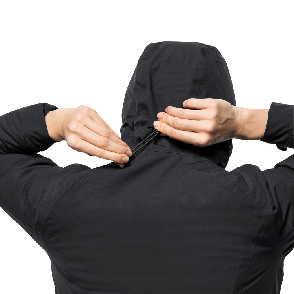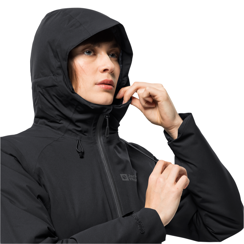 The hood and hem are fully adjustable. You’ll find space in the three pockets for important little items.